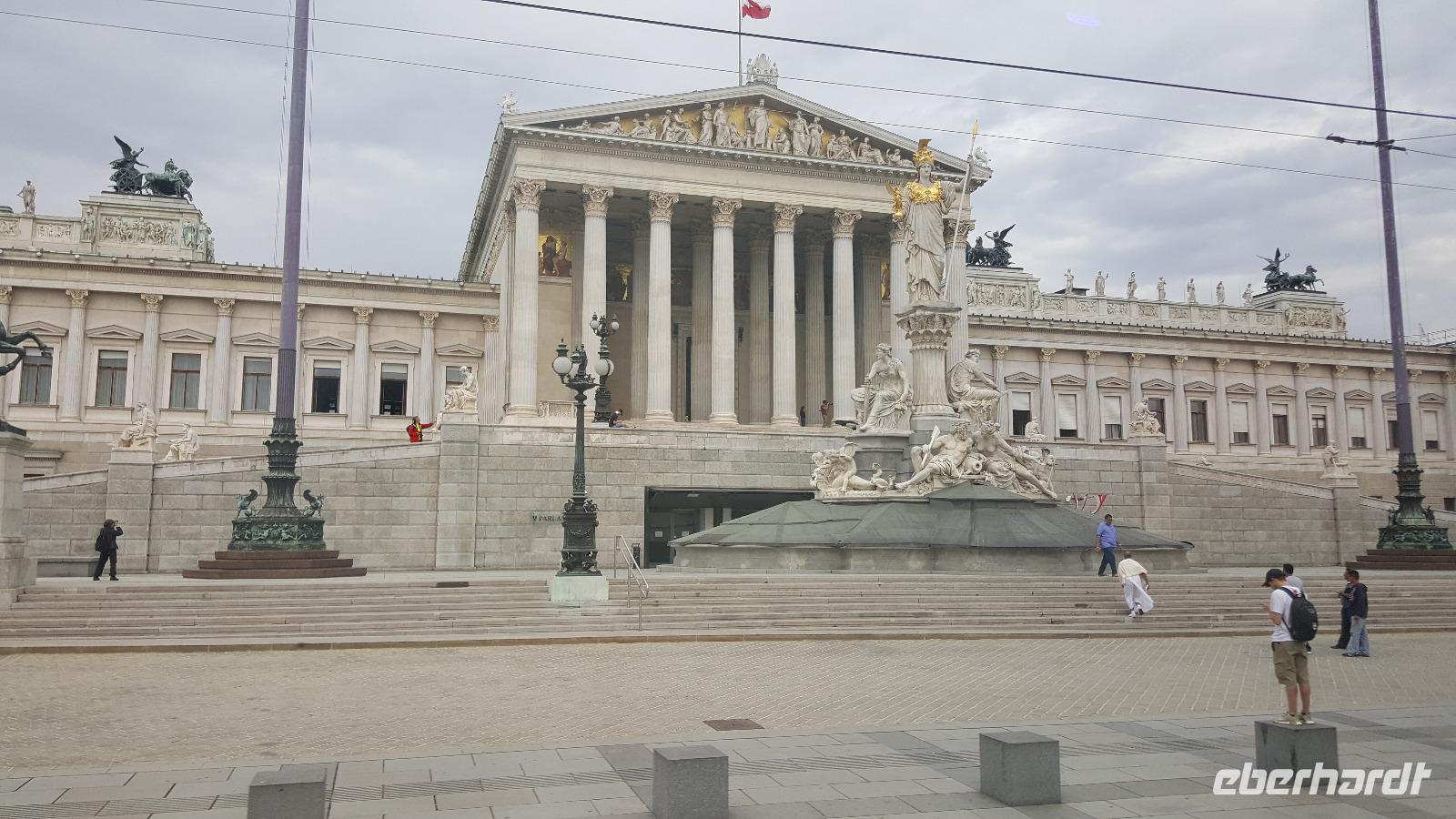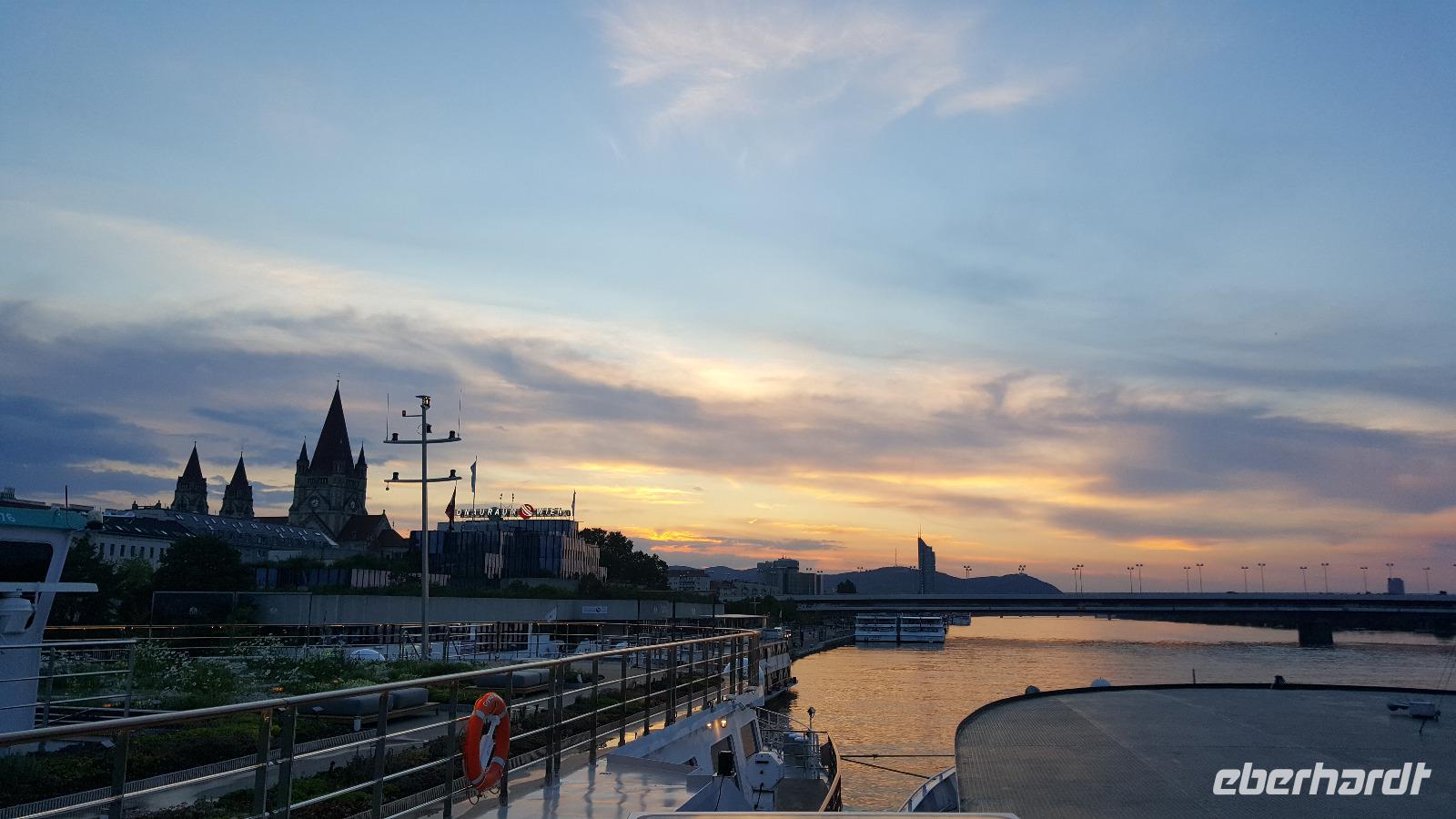 Gäste, die sich mit Jozef zum Frühsport auf der Sonnenterasse treffen haben eine fantastische Kulisse um sich. Wir haben schon in Wien angelegt. Mit Blick auf die Donau-City können wir auch den höchsten Bau Österreichs sehen. Es ist der "DC-Tower 1", der mit 250 m in den Himmel ragt. Wir haben einen Blick in das modere Wien. Wir liegen ganz nahe an der Reichsbrücke und haben auf der anderen Seite der Donau einen Blick auf die Kaiser-Franz-Joseph-Jubiläums-Kirchen und damit beginnen wir auch unsere Rundfahrt und Stadtführung durch Wien. Was wir in Wien sehen, ist nur ein Schnuppern und eine Überlegung wert diese Stadt vielleicht bei einer Reise "Wien für Genießer" intensiver zu erkunden.
