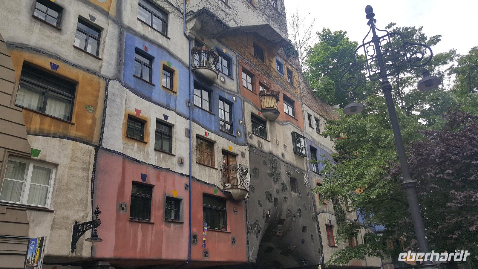 Wir haben schönes Wetter und steuern bei unserer Rundfahrt als Erstes das Hundertwasserhaus an. Friedrich Stowasser (bürgerlicher Name) hat im 3. Bezirk das „natur- und menschenfreundliche Haus" in Gang gesetzt.