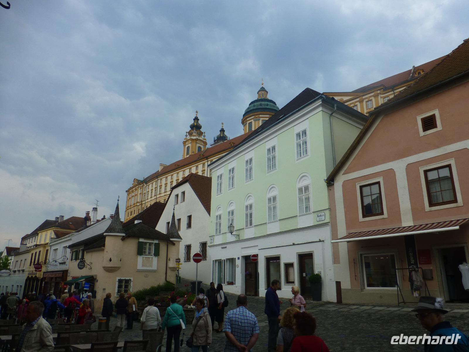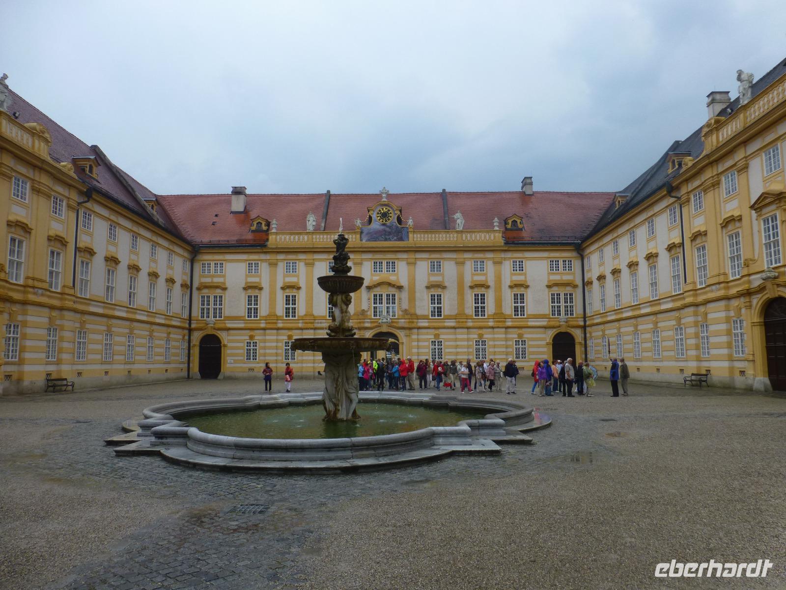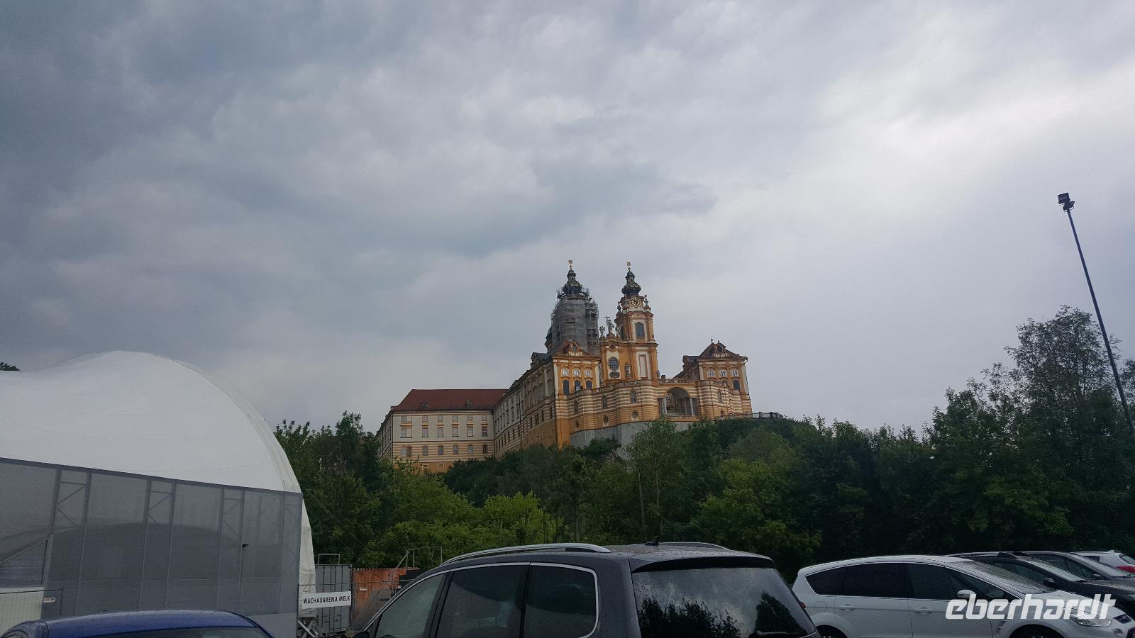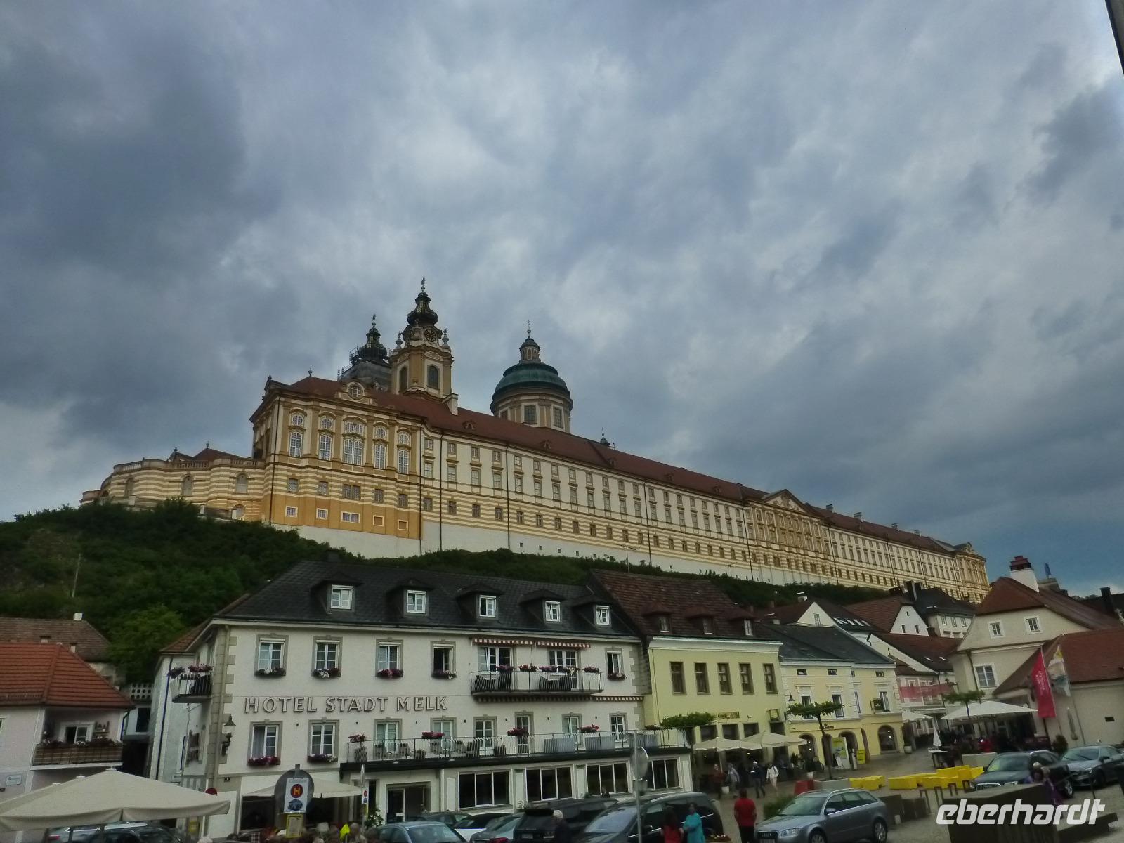 Ein gr0ßer Teil der Gruppe entscheidet sich für den Spaziergang vom Schiff aus nach Dürnstein.Von weiten können wir schon den blauen Kirchturm des Augustiner-Chorherrenstifts erkennen. Auf den Weg dahin spazieren wir entlang der Donau und an den Weinbergen vorbei. Unser Stadtführer erinnert mit Blick auf die Burgruine , dass hier der englische König Richardt Löwenherz gefangen war. Zeit bleibt uns um in den unterschiedlichsten Geschäften den Marillenlikör,-saft,-Marmelade und vieles mehr zu probieren.Weiter fahren wir an der Donau entlang nach Melk. Dominant zeigt sich das Stift Melk hoch über den Ort. In der Anlage des Stifts müssen wir uns erst einmal unterstellen. Ein starker Regen zwingt uns dazu. Anschließend beruhigt sich das Wetter wieder und wir können der Führung gut folgen. Wir erfahren, dass die Stiftskirche, der Marmorsaal und die Bibliothek mit rund 100000 wertvollen Bänden etwas Einmaliges sind. Für die Gäste die noch etwas laufen möchten, besuchen wir noch den Ort, wiederum mit einem Regenschauer.(!!!)