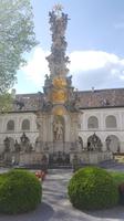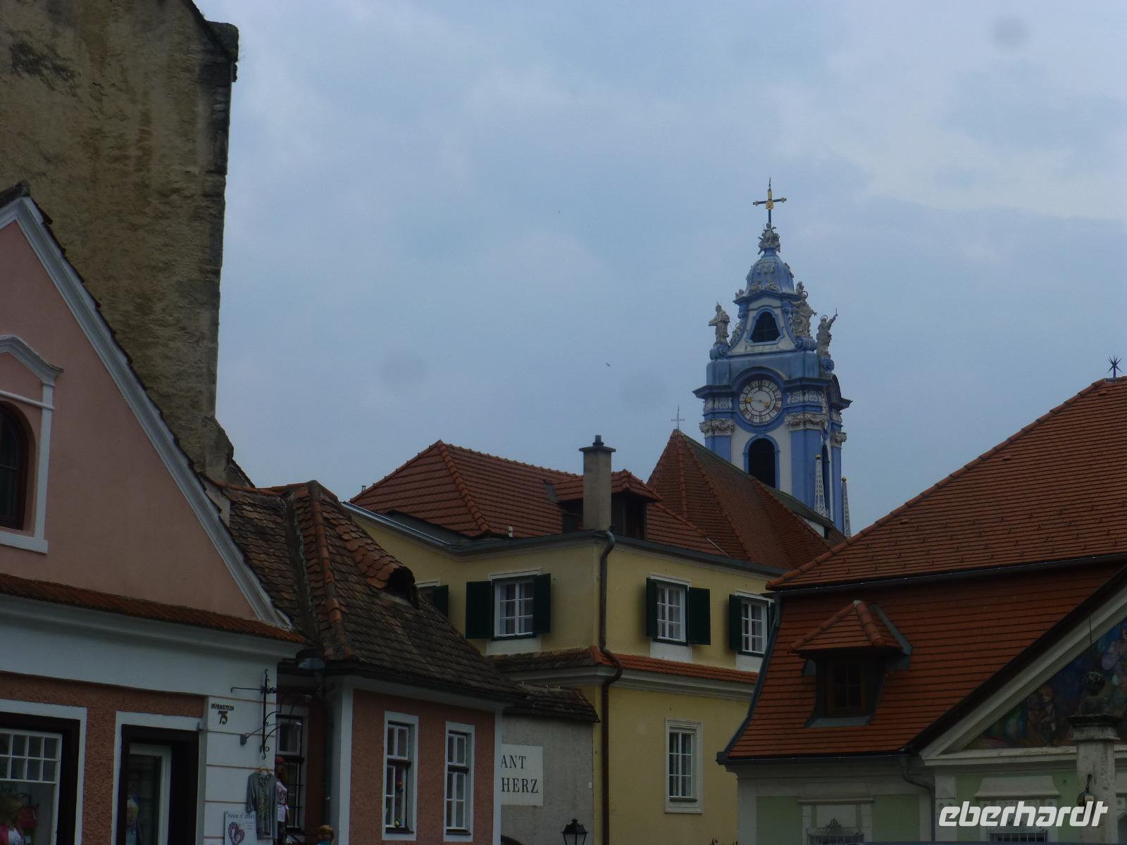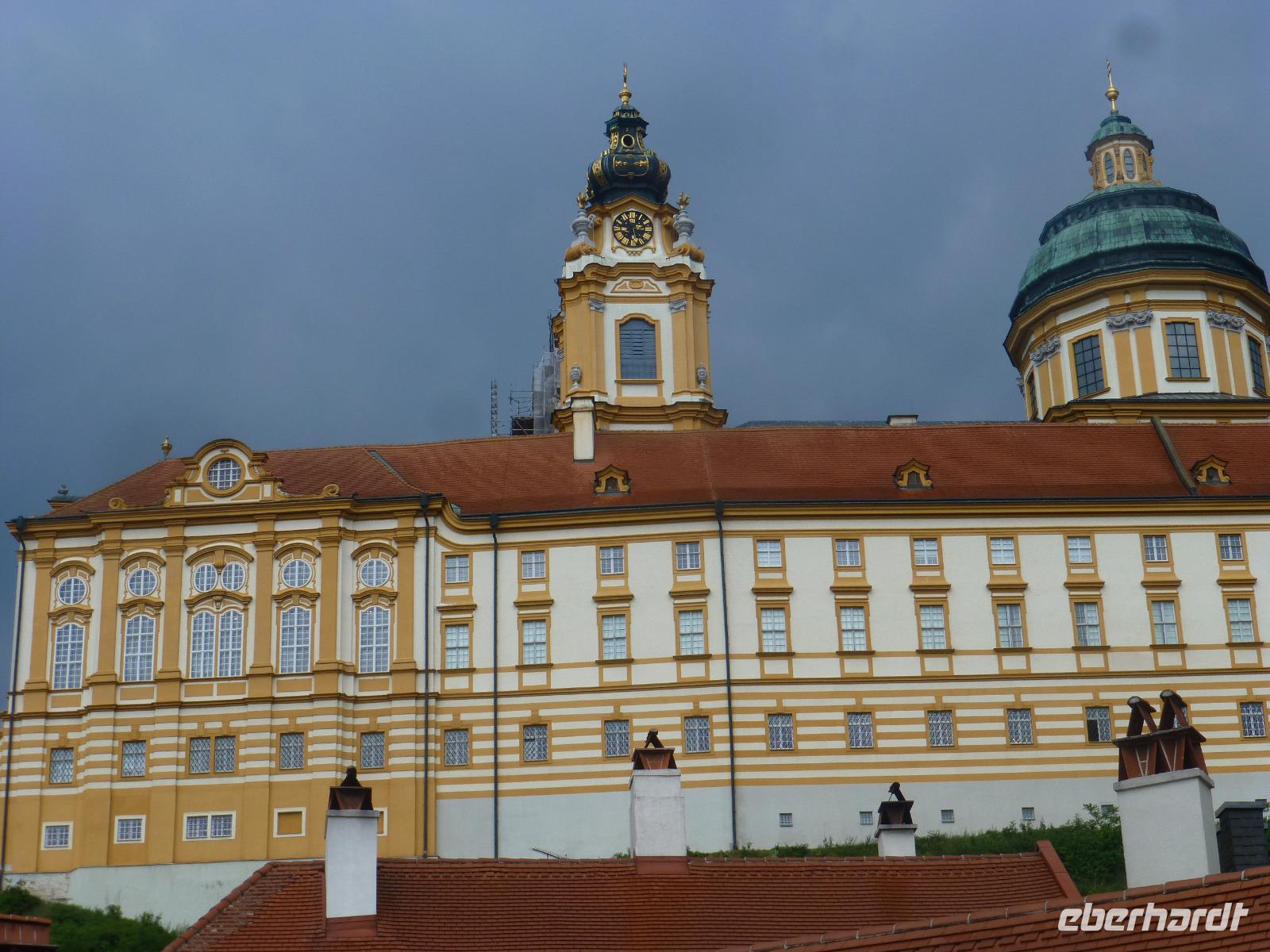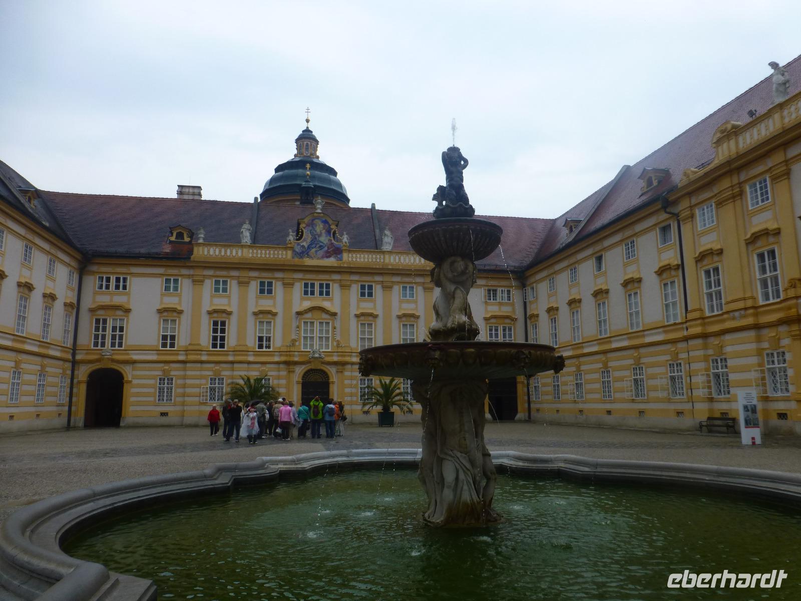 Ein gr0ßer Teil der Gruppe entscheidet sich für den Spaziergang vom Schiff aus nach Dürnstein.Von weiten können wir schon den blauen Kirchturm des Augustiner-Chorherrenstifts erkennen. Auf den Weg dahin spazieren wir entlang der Donau und an den Weinbergen vorbei. Unser Stadtführer erinnert mit Blick auf die Burgruine , dass hier der englische König Richardt Löwenherz gefangen war. Zeit bleibt uns um in den unterschiedlichsten Geschäften den Marillenlikör,-saft,-Marmelade und vieles mehr zu probieren.Weiter fahren wir an der Donau entlang nach Melk. Dominant zeigt sich das Stift Melk hoch über den Ort. In der Anlage des Stifts müssen wir uns erst einmal unterstellen. Ein starker Regen zwingt uns dazu. Anschließend beruhigt sich das Wetter wieder und wir können der Führung gut folgen. Wir erfahren, dass die Stiftskirche, der Marmorsaal und die Bibliothek mit rund 100000 wertvollen Bänden etwas Einmaliges sind. Für die Gäste die noch etwas laufen möchten, besuchen wir noch den Ort, wiederum mit einem Regenschauer.(!!!)