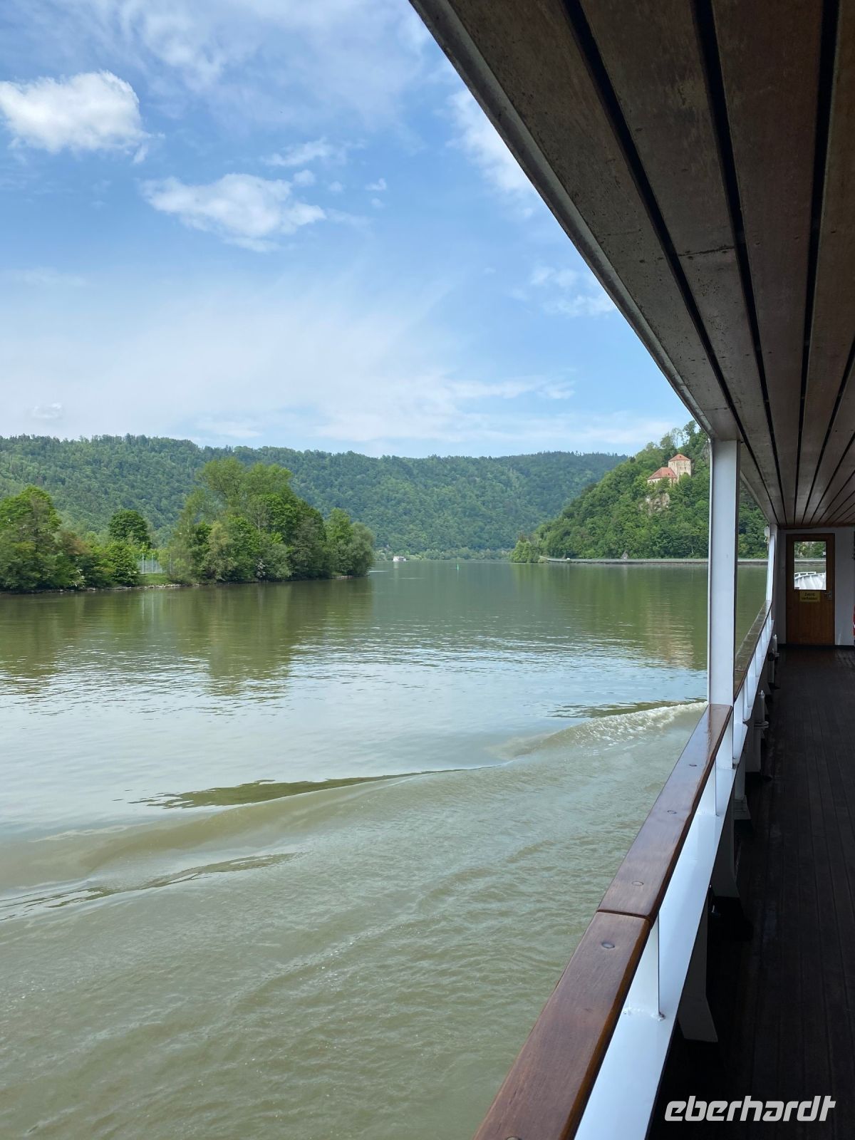 Dann bringt uns der Bus noch auf die andere Donauseite zur 2 Kilometer entfernten Anlegestelle Lindau. Hier wartet schon unser schwimmendes Hotel, die MS Rossini. 15 Uhr heißt es dann „Leinen los“ – unsere Kreuzfahrt beginnt. In der Panoramabar hat man bereits Kaffee und Kuchen für uns vorbereitet. Dann wird es spannend, denn wir fahren in die erste Schleuse ein. Von der Reling aus beobachten wir interessiert den Schleusenvorgang. Bordreiseleiter Jozef gibt uns dazu interessante Informationen. 17 Uhr verlassen wir Deutschland. Zwischen dem Inn- und dem Mühlviertel fahren wir durch Oberösterreich weiter. Ein besonders schöner Streckenabschnitt folgt dann mit der Schlögener Schlinge.