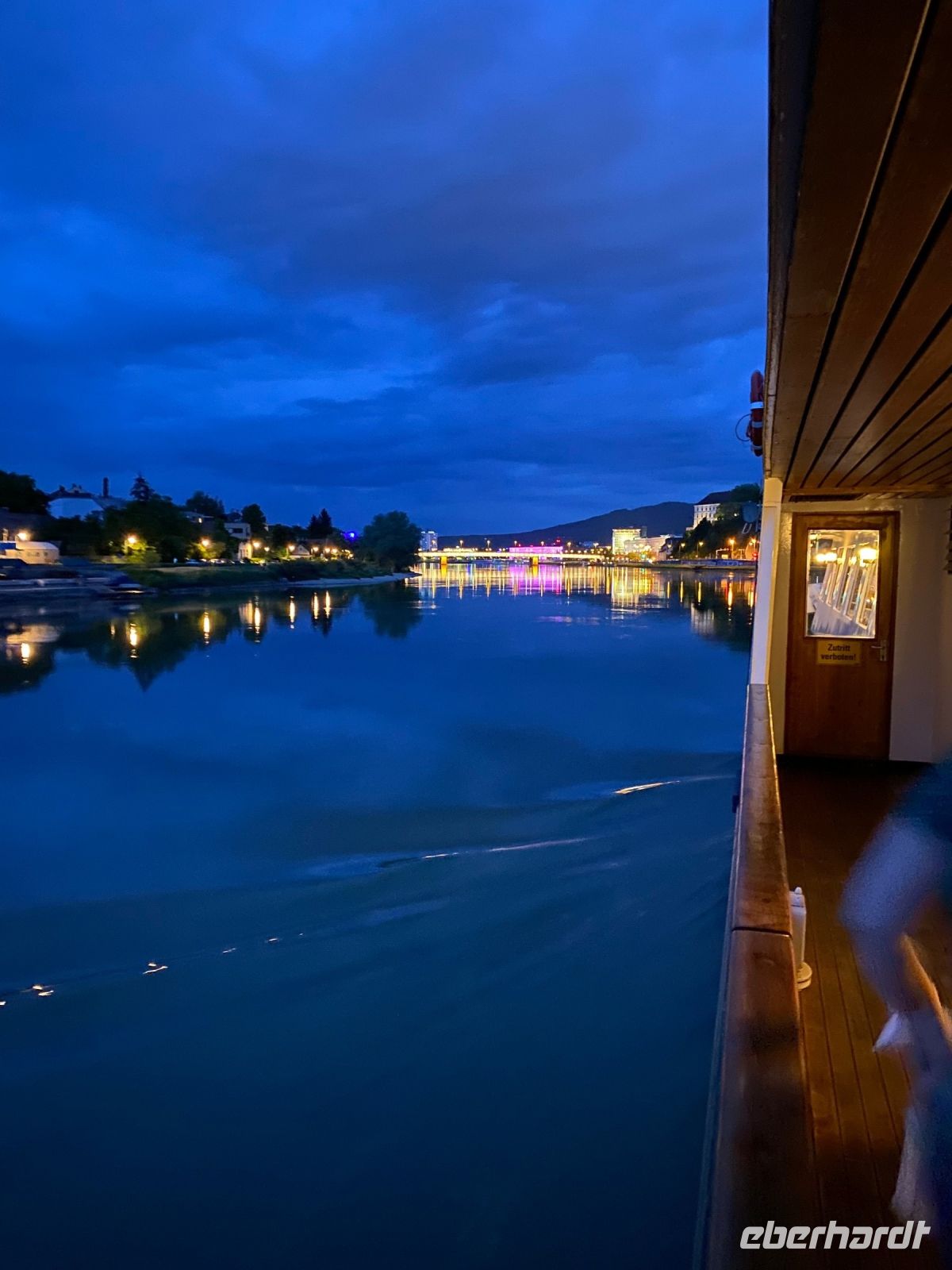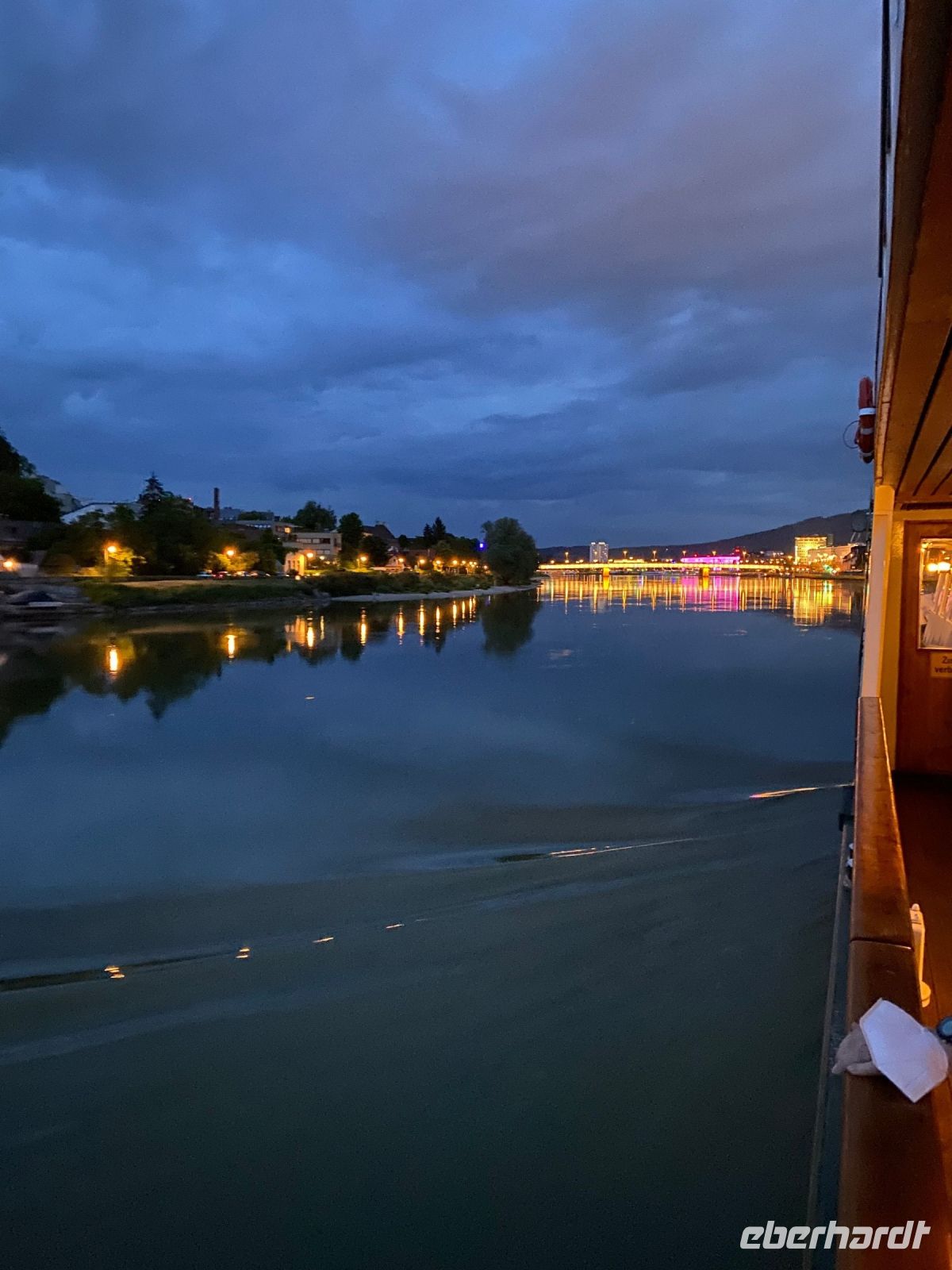 Am Abend treffen wir uns im Restaurant auf dem Salondeck. Wir lernen den Kapitän und seine Crew kennen und stoßen mit Sekt auf eine erlebnisreiche Reise an. Danach wir uns ein köstliches 4-Gang-Menü serviert. Vor allem die Fotografen versammeln sich später noch an der Reling, um die abendlichen Impressionen von Linz im Bild festzuhalten. Mit Musik klingt unser erster Tag in der Panoramabar aus.
