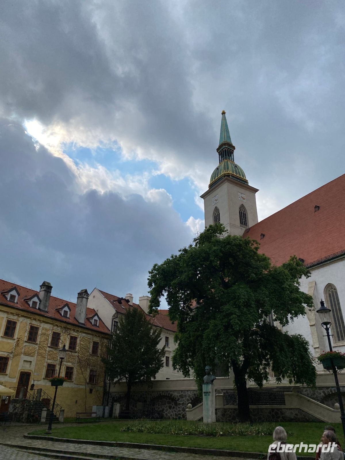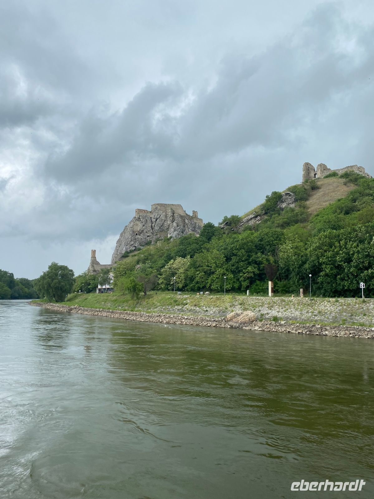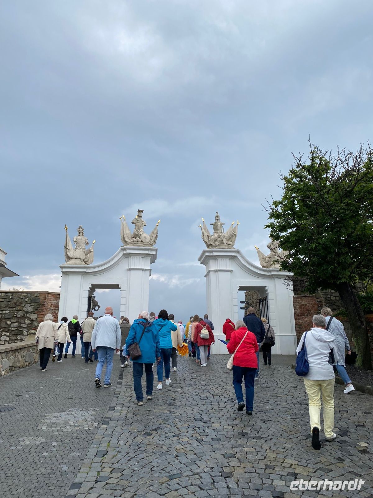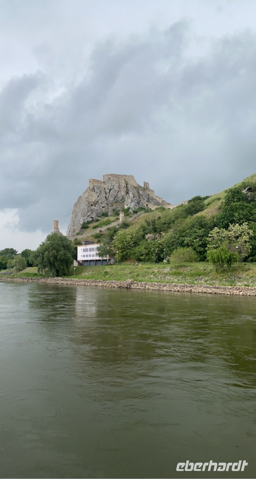 Während wir durch die Donauauen des Nationalparks Donau-March fahren, wird das Mittagessen serviert, das mit einer leckeren Schokoroulade endet. Gut gestärkt erreichen wir die Grenze zur Slowakischen Republik und wenig später die Hauptstadt Bratislava. Hier stehen die Busse mit den örtlichen Reiseleitern für uns schon bereit. In der Nähe der imposanten Schrägseilbrücke mit dem einem UFO ähnelnden Turmrestaurant beginnt unsere Stadtrundfahrt. Sie führt uns vorbei am Einkaufscenter „Eurovea“, an der ältesten slowakischen Universität, am Nationalmuseum, am schönsten Rokokohaus der Stadt, am Kapuzinerkloster und am Präsidentenpalais. Dann geht es hinauf zum Prestigeviertel von Bratislava, wo Prominente aus Film und Fernsehen, Politiker und Botschafter wohnen und wir einen tollen Blick über die Stadt bis nach Österreich haben. Unser nächstes Ziel ist die Pressburg. Nach einem kleinen Rundgang bringt der Bus uns wieder hinunter. Zu Fuß erkunden wir nun die Altstadt mit der Krönungskathedrale, dem alten Rathaus und den vielen kleinen Gassen und Plätzen. Dabei begegnen wir u.a. Hans Christian Andersen, „Brüderchen und Schwesterchen“, Franz Liszt und zum Schluss noch dem Kanalarbeiter Cumil, der uns lachend aus einem Gully beobachtet. Wir streicheln seine Mütze, denn das soll Glück bringen. Als sich unser Rundgang dem Ende nähert und wir das Nationaltheater an der Promenade erreichen, öffnet der Himmel plötzlich alle Schleusen und wir flüchten uns zurück aufs Schiff.