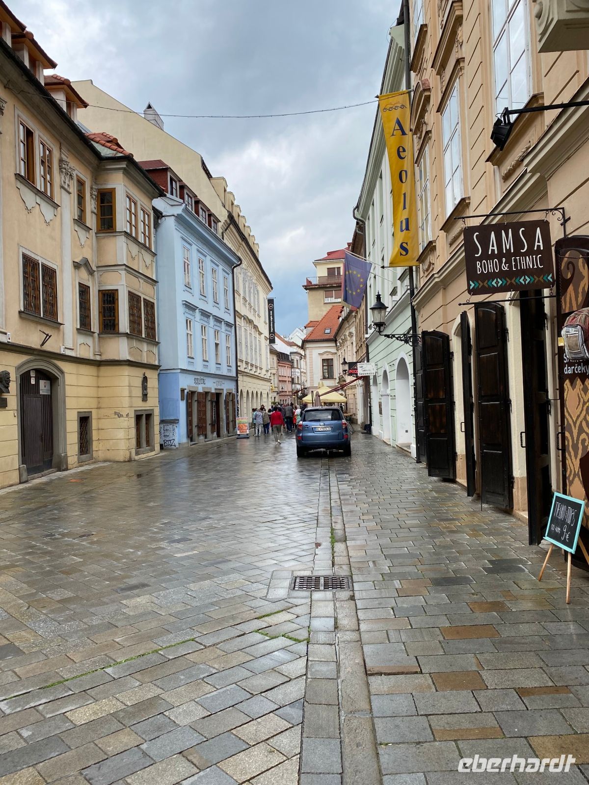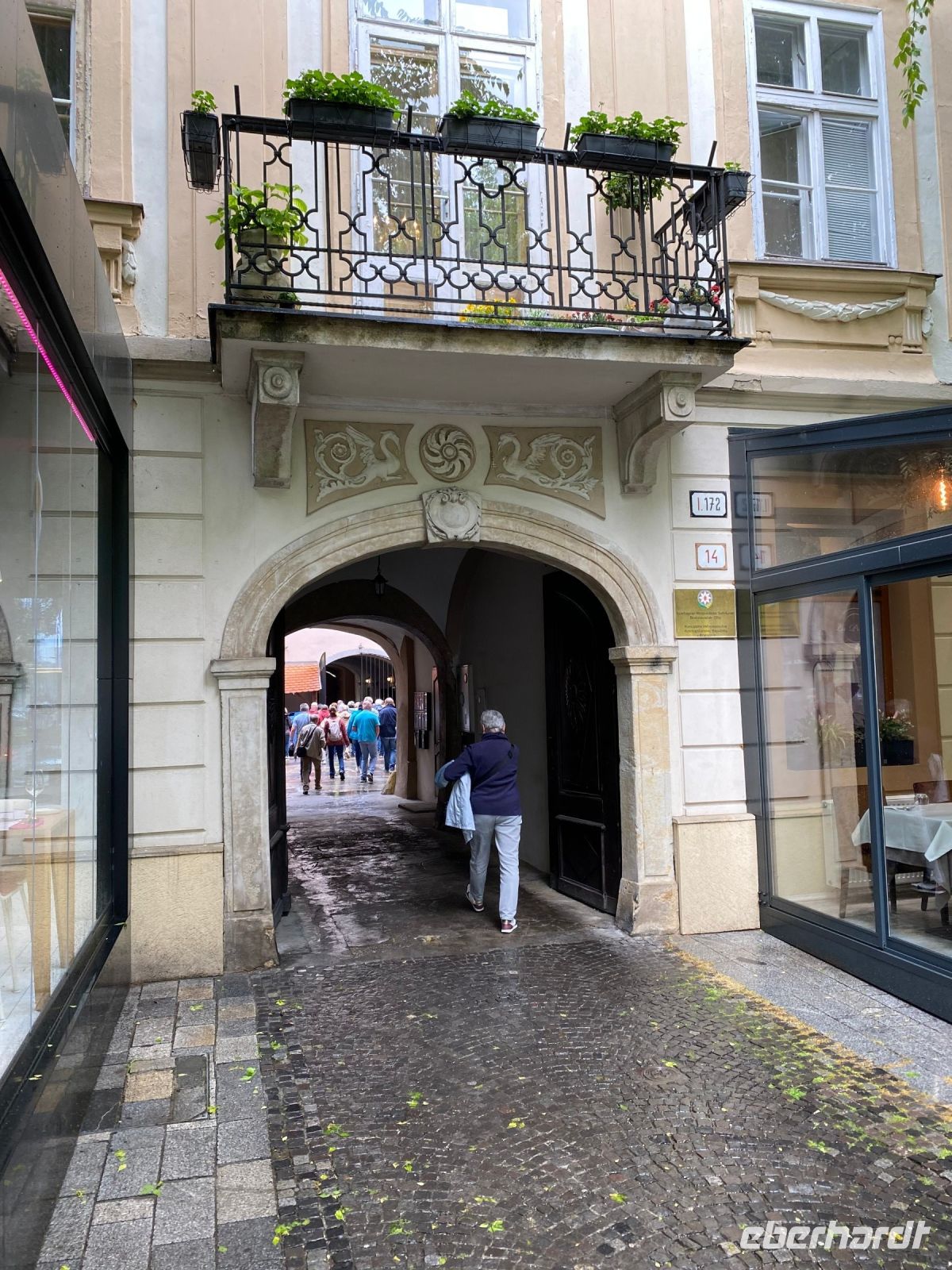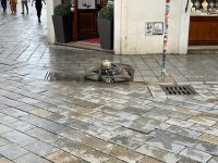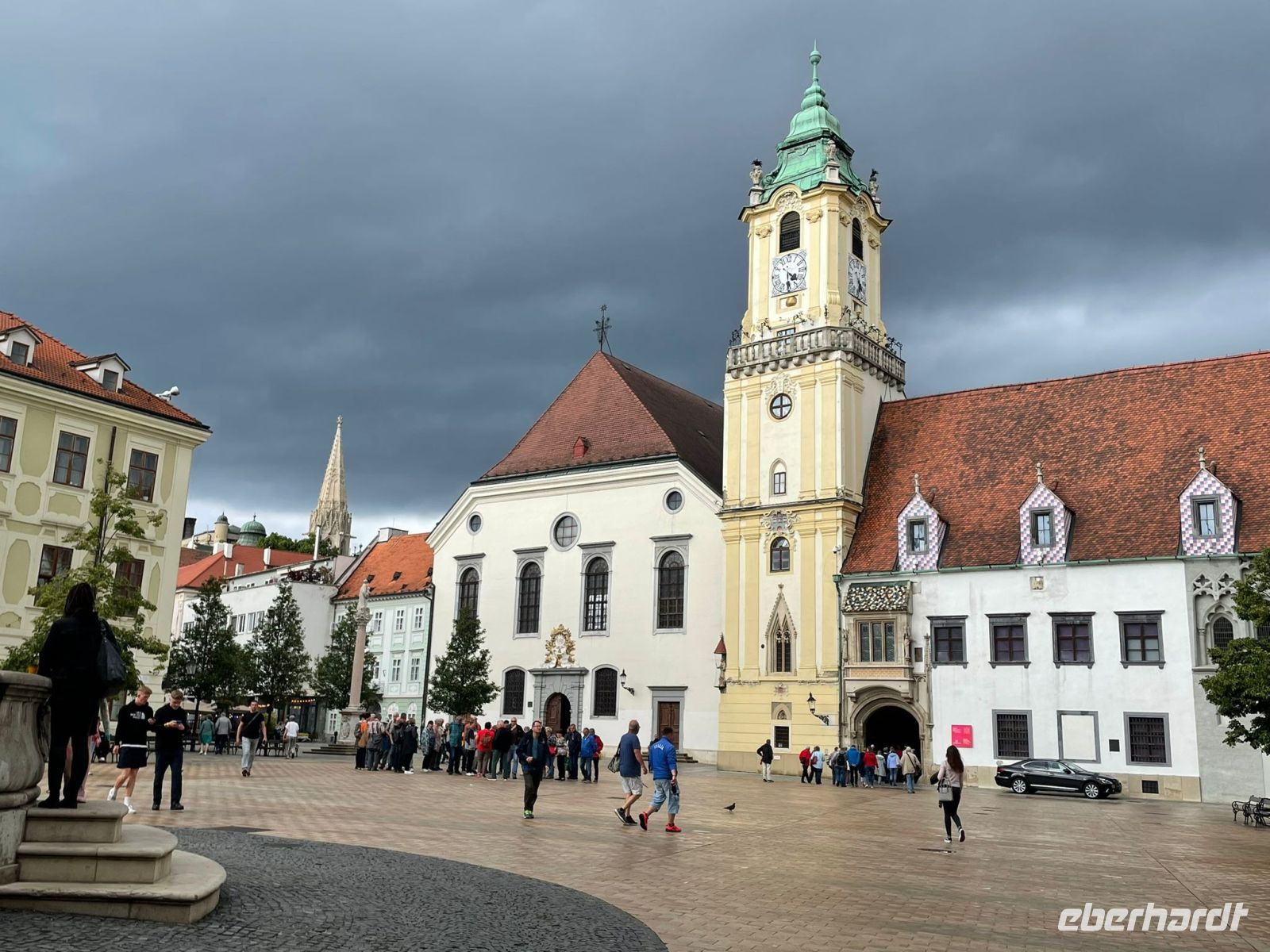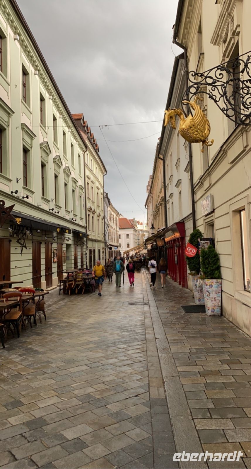 Während wir durch die Donauauen des Nationalparks Donau-March fahren, wird das Mittagessen serviert, das mit einer leckeren Schokoroulade endet. Gut gestärkt erreichen wir die Grenze zur Slowakischen Republik und wenig später die Hauptstadt Bratislava. Hier stehen die Busse mit den örtlichen Reiseleitern für uns schon bereit. In der Nähe der imposanten Schrägseilbrücke mit dem einem UFO ähnelnden Turmrestaurant beginnt unsere Stadtrundfahrt. Sie führt uns vorbei am Einkaufscenter „Eurovea“, an der ältesten slowakischen Universität, am Nationalmuseum, am schönsten Rokokohaus der Stadt, am Kapuzinerkloster und am Präsidentenpalais. Dann geht es hinauf zum Prestigeviertel von Bratislava, wo Prominente aus Film und Fernsehen, Politiker und Botschafter wohnen und wir einen tollen Blick über die Stadt bis nach Österreich haben. Unser nächstes Ziel ist die Pressburg. Nach einem kleinen Rundgang bringt der Bus uns wieder hinunter. Zu Fuß erkunden wir nun die Altstadt mit der Krönungskathedrale, dem alten Rathaus und den vielen kleinen Gassen und Plätzen. Dabei begegnen wir u.a. Hans Christian Andersen, „Brüderchen und Schwesterchen“, Franz Liszt und zum Schluss noch dem Kanalarbeiter Cumil, der uns lachend aus einem Gully beobachtet. Wir streicheln seine Mütze, denn das soll Glück bringen. Als sich unser Rundgang dem Ende nähert und wir das Nationaltheater an der Promenade erreichen, öffnet der Himmel plötzlich alle Schleusen und wir flüchten uns zurück aufs Schiff.