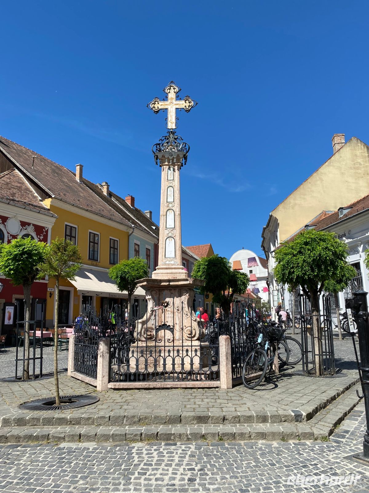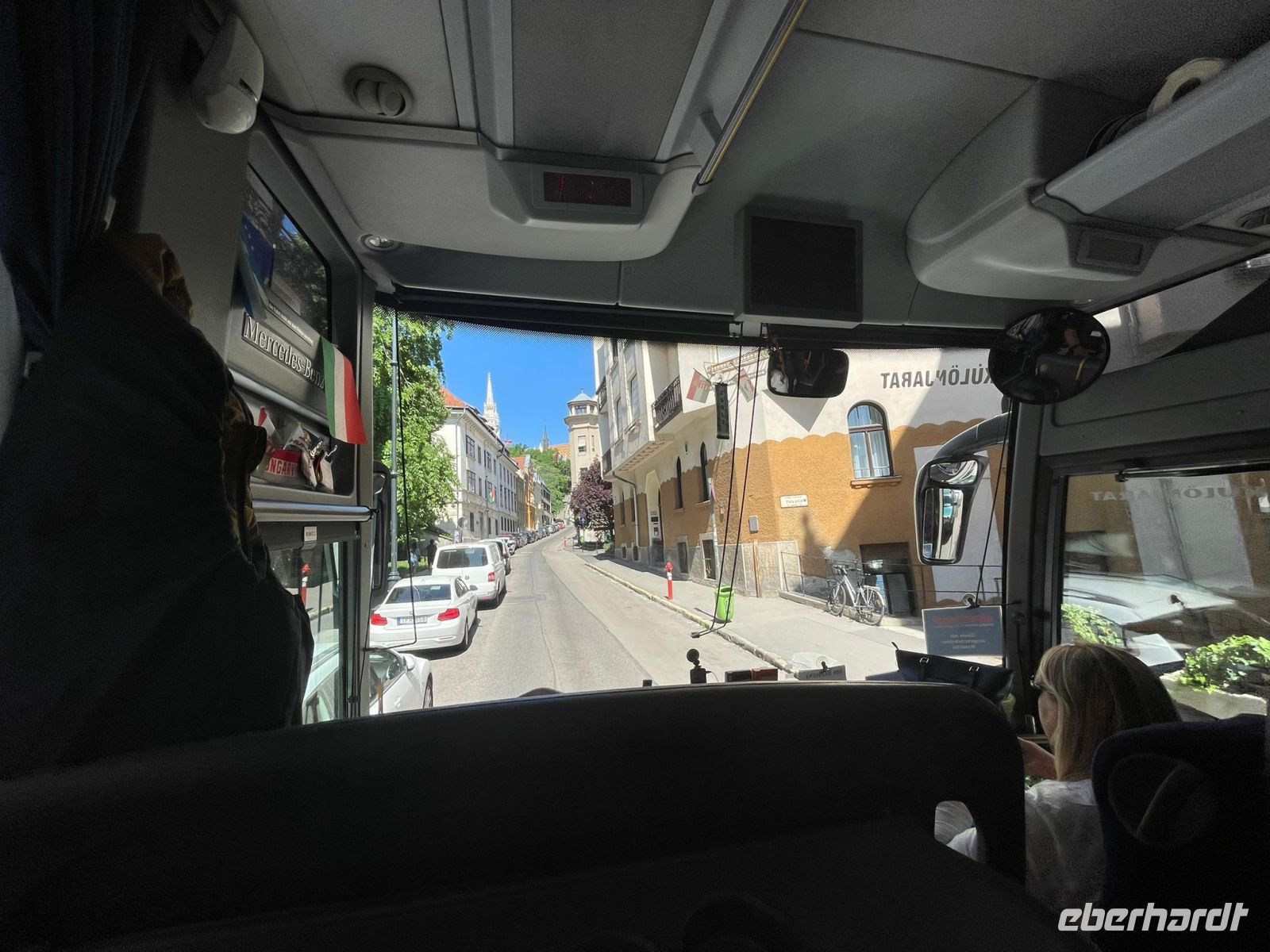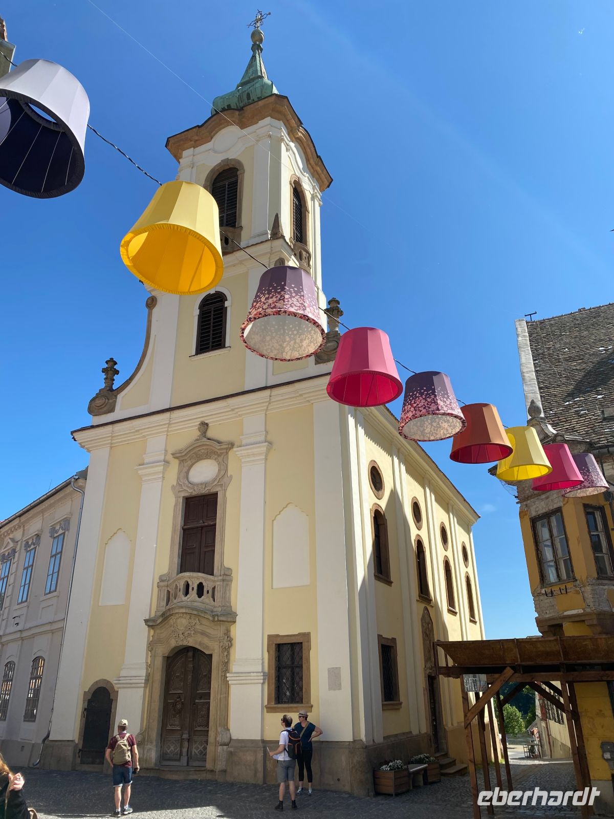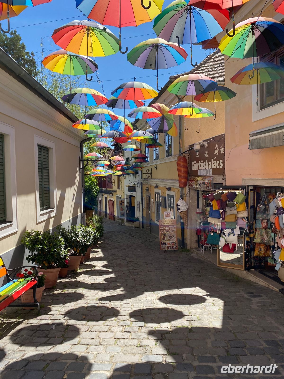 Nachdem unser Schiff in Esztergom angelegt hat und wir beim Frühstück waren wollen wir bei einem Ausflug die Region am Donauknie erkunden. Unser erstes Ziel, die Basilika von Esztergom, können wir schon vom Schiff aus sehen. Der Bus bringt uns hinauf und wir genießen zunächst den Blick von der Aussichtsterrasse über die Donau bis in die Slowakei. Dann besuchen wir die größte Kirche Ungarns. Sie beeindruckt mit ihrer riesigen Kuppel, den Statuen, Fresken und Altarbildern. Noch ein Abstecher in den Souvenirladen, dann geht es weiter entlang der Donau. Bald durchfahren wir Visegrad am Donauknie. So bezeichnet man den Durchbruch der Donau zwischen den Vulkangebirgen von Pilis und Börzsenöy, wo sich die Donau nach Süden wendet. Hoch über dem Ort thront die Burg. Nach knapp einer Stunde erreichen wir das kleine Künstlerstädtchen Szendendre mit seinem mediterranen Flair. Wir bummeln durch die malerischen Gassen entlang der bunten Häuser und zahlreichen kleinen Geschäften. Zum Bus kommt dann fast jeder Gast mit einem Beutelchen zurück. Den Paprikaprodukten, dem leckeren Marzipan, der Wurst und den schicken Handtaschen konnte man einfach nicht widerstehen. Vorbei an der Insel Szendendre, die für ihre Erdbeerprodukte bekannt ist, geht es auf schöner Strecke wieder zum Schiff zurück. Unterwegs sehen wir, dass schon die Hollunderbüsche, die Akazienbäume und die Rosenstöcke blühen. Unsere örtliche Reiseleiterin erzählt uns derweil so manch Interessantes über kulinarische Spezialitäten ihres Landes. Das hat uns Appetit gemacht und so begeben wir uns auf dem Schiff gleich in den Speisesaal.