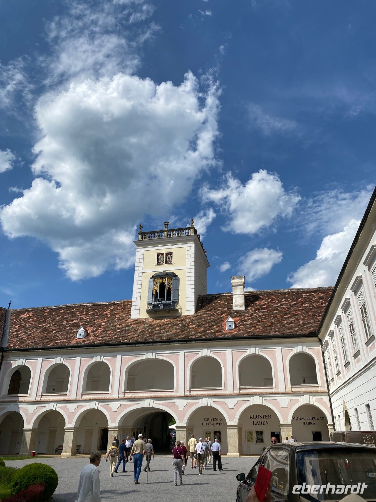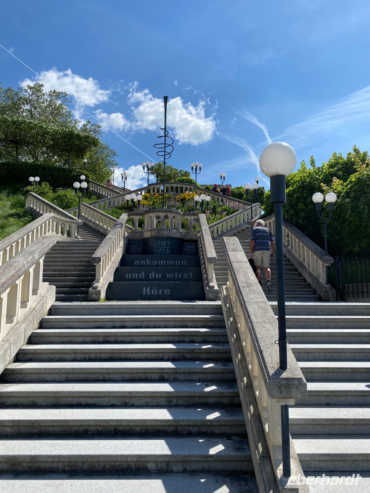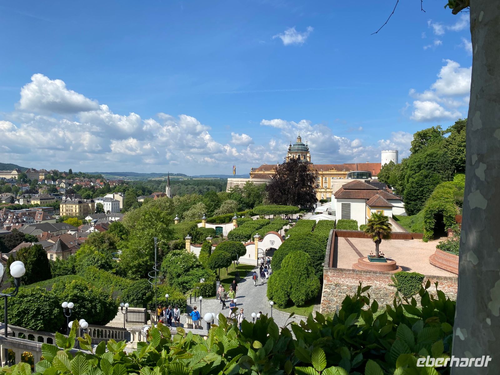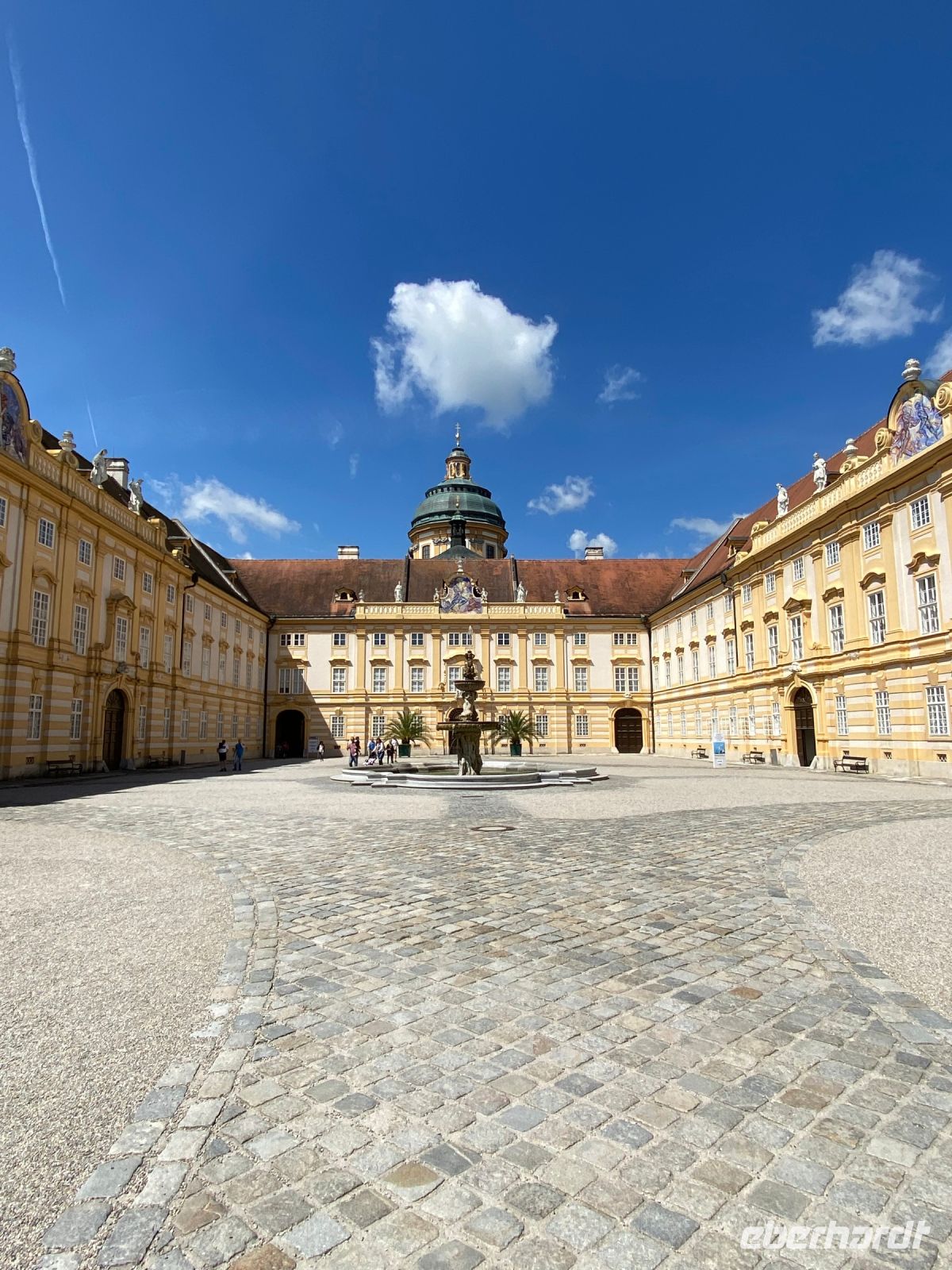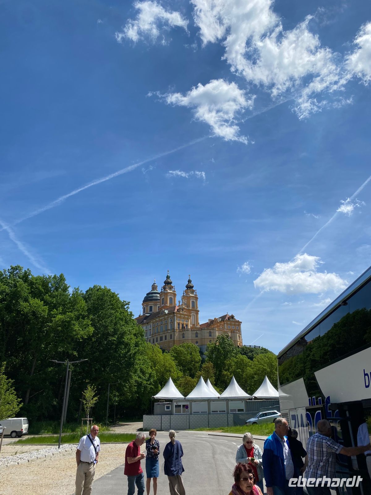 Weiter geht die abwechslungsreiche Reise bei schönstem Wetter vorbei an kleinen Dörfern, Marillenhainen, Weinbergen und mächtigen Burgen. Gegen Mittag erreichen wir Melk. Schon von weitem ist das hoch über der Donau liegende Stift Melk mit der majestätischen Kuppel zu sehen. Es gilt als eine Meisterleistung barocker Baukunst. Maria Theresia sagte 1743. „Es reuete mich, so ich nit hier gweßn wer“. Die Gäste, die mit dem Bus unterwegs sind, haben die Möglichkeit, die Stiftshöfe, die Stiftskirche und die schöne Gartenanlage zu besuchen.