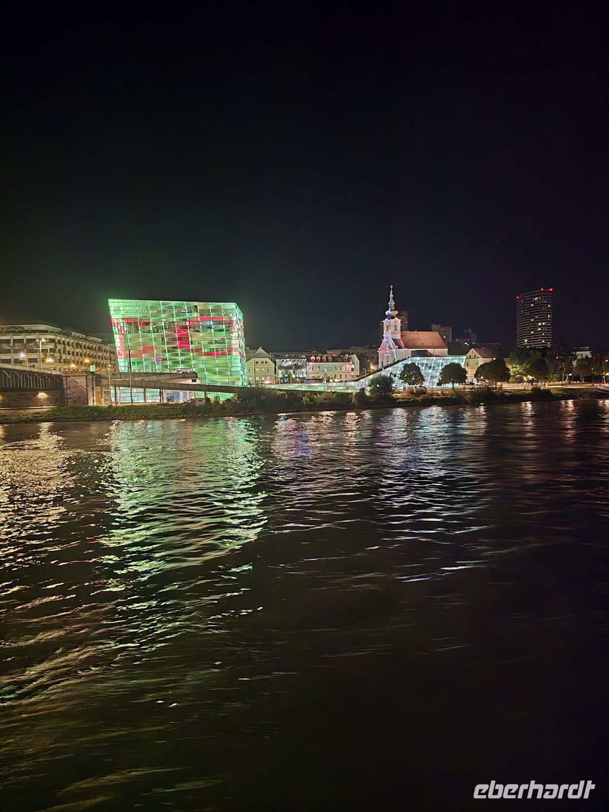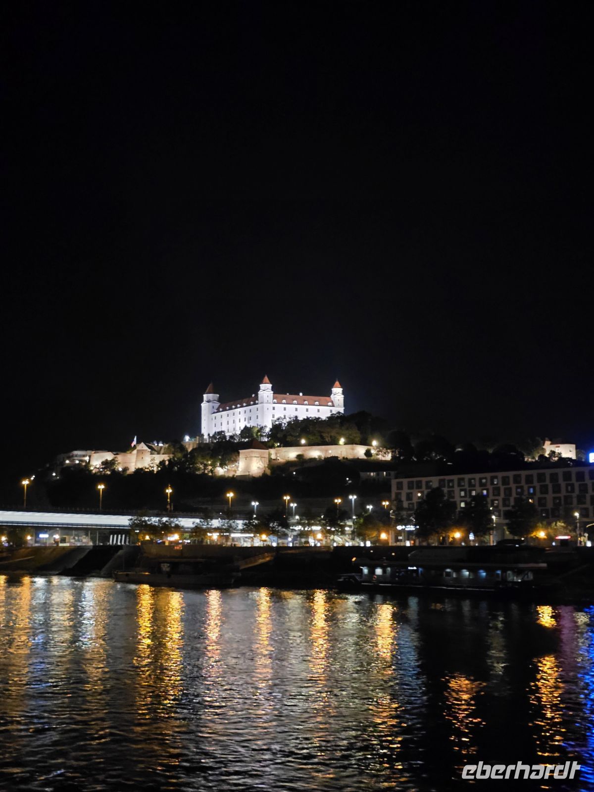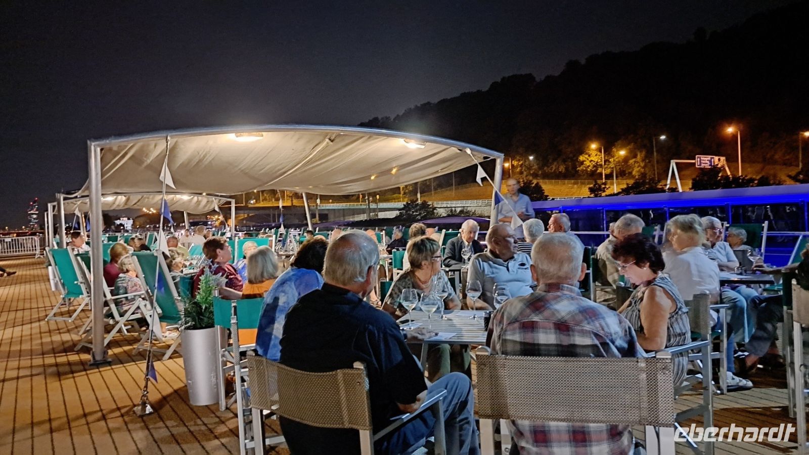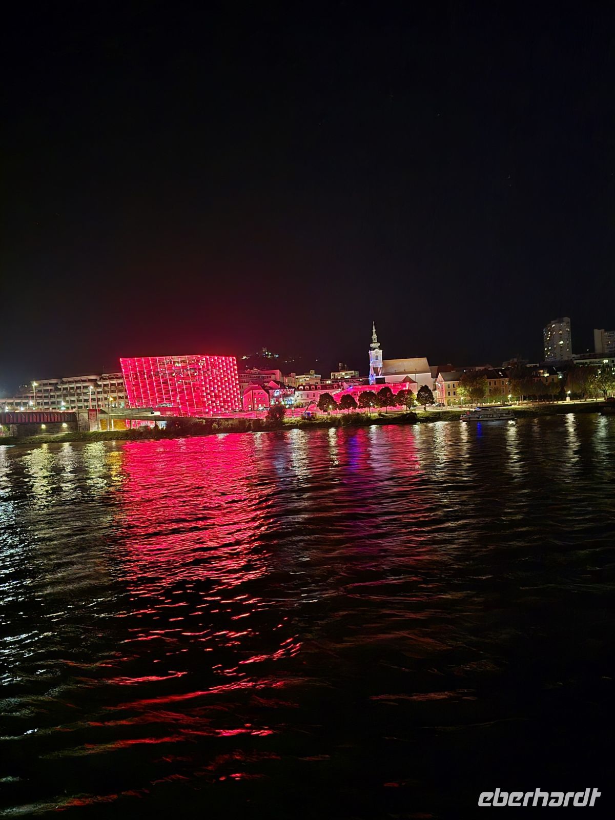 Nach etwas Freizeit schlenderten wir wieder zurück zur Donau und zu unserer MS Dutch Grace. Beeindruckend und ergreifend für uns war die Ausfahrt mit dem Schiff aus dem beleuchteten Bratislava, begleitet von zarten Violinenklängen, gespielt durch unsere Gastkünstlerin Katrin Wettin.