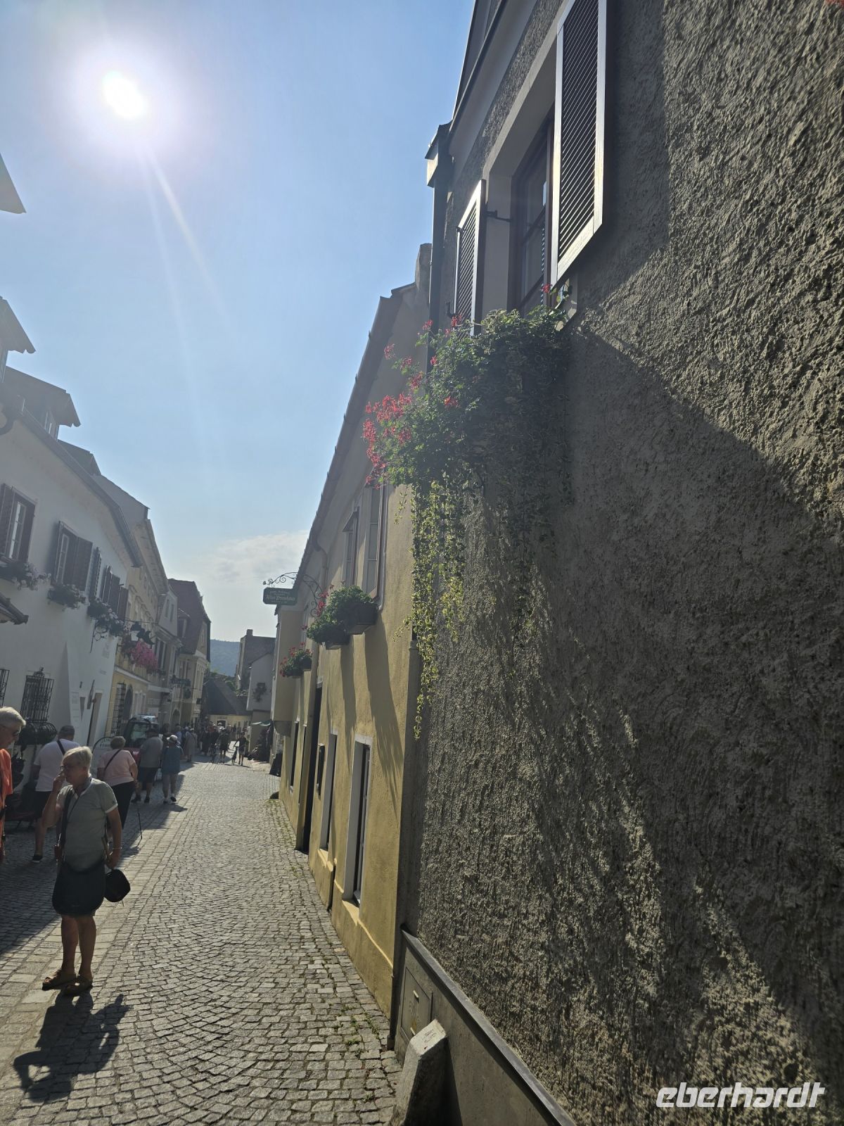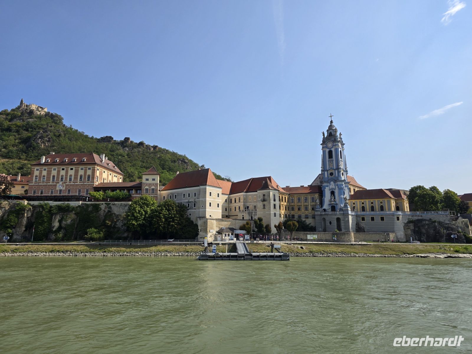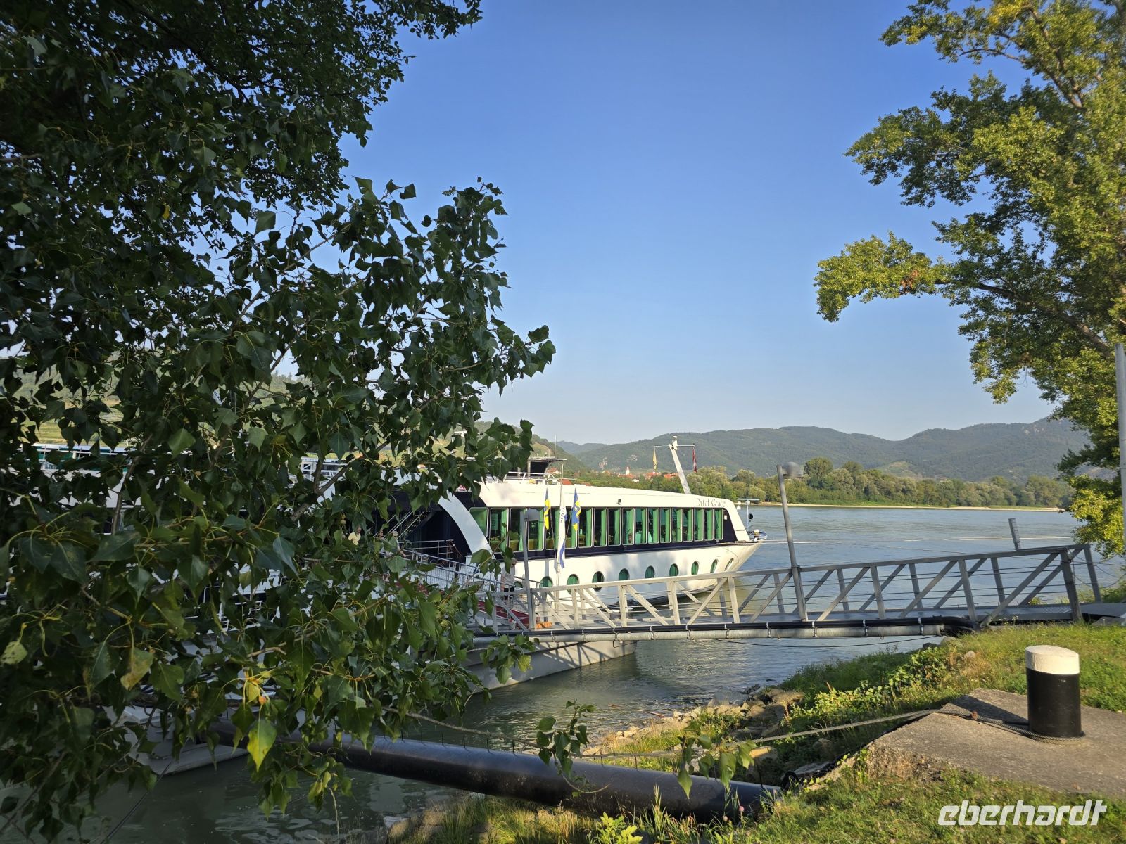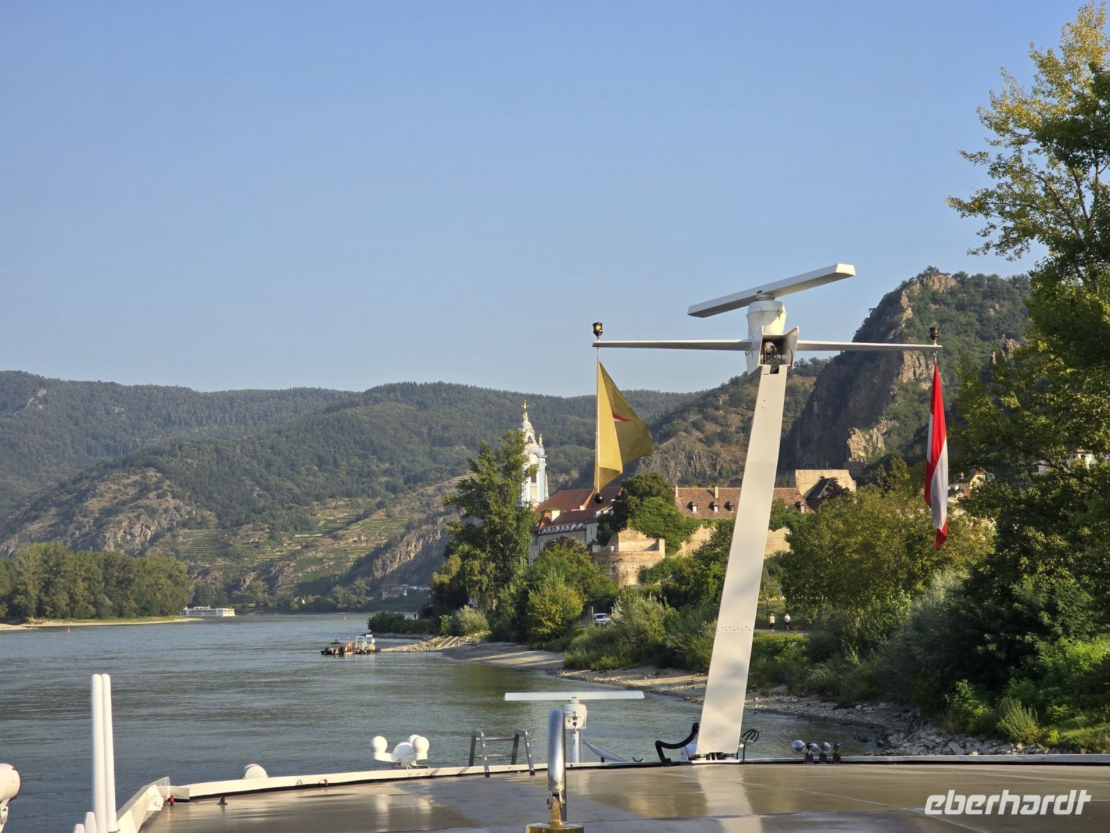 Heute brach bereits der vorletzte Tag unseres Besichtigungsprogramms an. Wir legten bei bestem Wetter, strahlend blauem Himmel und wieder hochsommerlichen Temperaturen, in Dürnstein, der Perle der Wachau, an. Einige Gäste spazierten auf eigene Faust durch die Gassen von Dürnstein und bestaunten das Stift mit dem blau-weißen Kirchturm, wo ein Museum eröffnet ist. Ganz Mutige nahmen den Weg bis zur Ruine der Burg Dürnstein (12. Jahrhundert), wo einst Richard Löwenherz gefangen gehalten wurde. Sein treuer Sänger Blondel hatte ihm das zuvor vereinbarte Lied am Fuße der Burg gesungen und der König antwortete, so die Sage. Richard Löwenherz konnte so gegen ein Lösegeld freigekauft werden. Von der Ruine eröffnete sich das Panorama des Donautales rund um Dürnstein. Viele Gäste nutzten die bequeme Fahrt mit den Zügen des Wachau-Expresses durch die Weinberge von Oberloipen und Dürnstein, wo besonders Weißwein, darunter der Grüne Veltliner, angebaut wird. Durch das Kremser Tor erreichten wir schließlich den Prangerplatz. Von hier spazierten wir durch die romantischen Gassen von Dürnstein, erfreuten uns an den schmucken Fassaden, kauften verschiedene Produkte der Winzer und der Bauern ein, darunter Erzeugnisse aus Marillen wie Marmelade oder Liköre. Gern hätten wir noch etwas in diesem gastlichen Örtchen verweilt, aber der Kapitän erwartete uns zurück an Bord. Also ging es mit dem Wachau-Express gemütlich zurück zum Schiff. Am Mittag und Nachmittag genossen wir die Passage durch das Donautal vorbei an den kleine Orten Weißenkirchen mit der Wehrkirche, die dem Ort den Namen gab, Spitz mit dem Tausendeimerberg, der Burgruine Aggstein, dem Kloster Schönhübel bis nach Melk. Diese 30 Kilometer gelten als einer der romantischsten Flussabschnitte in Österreich.