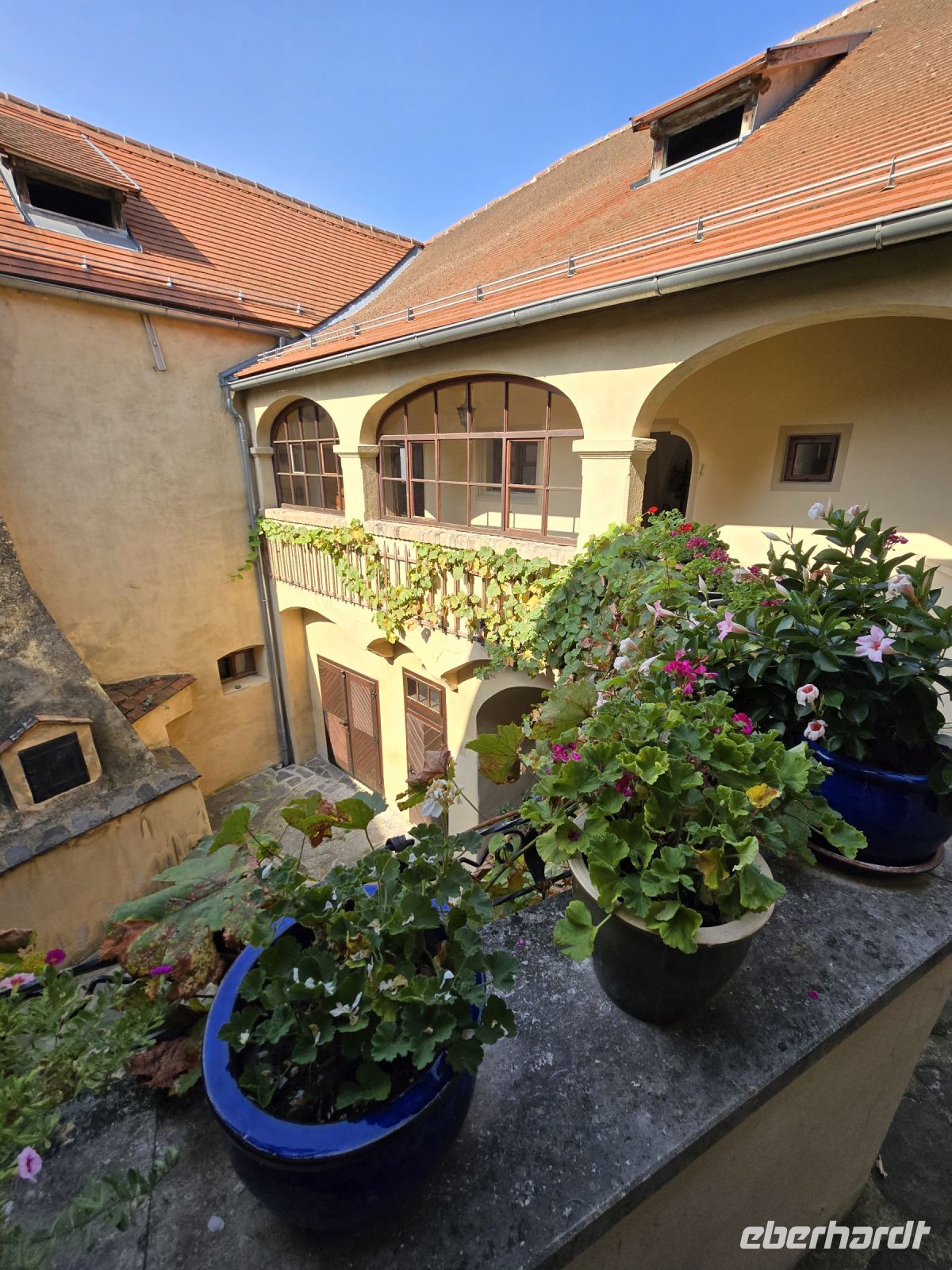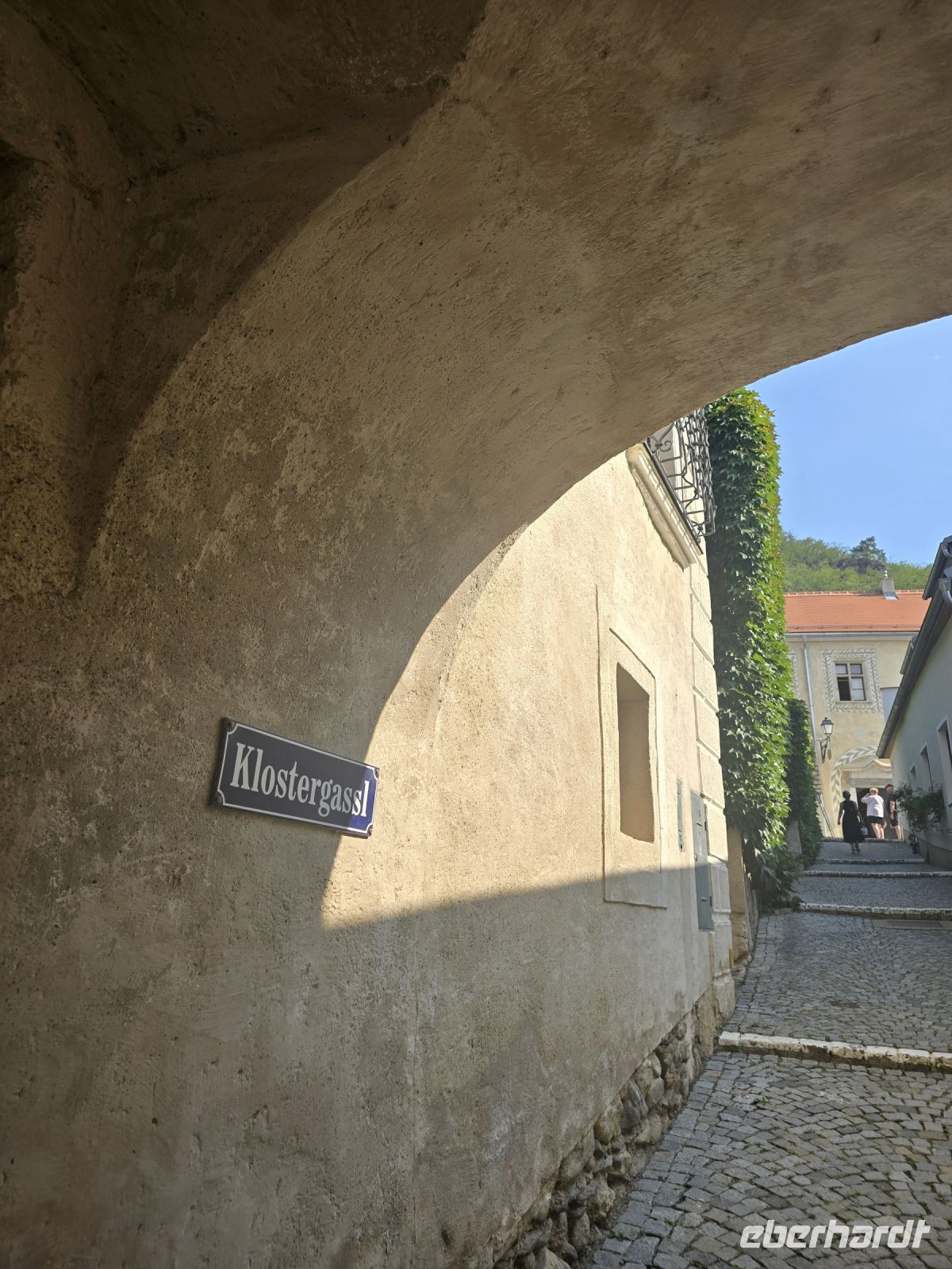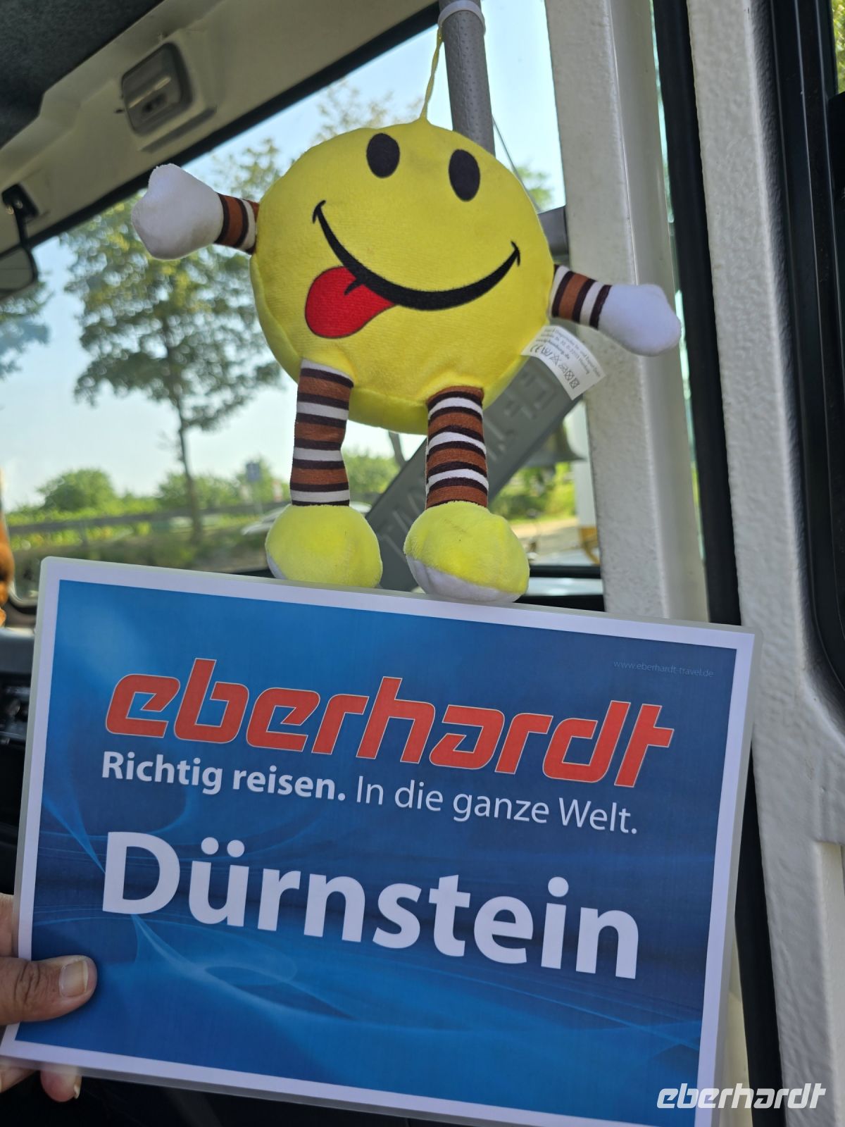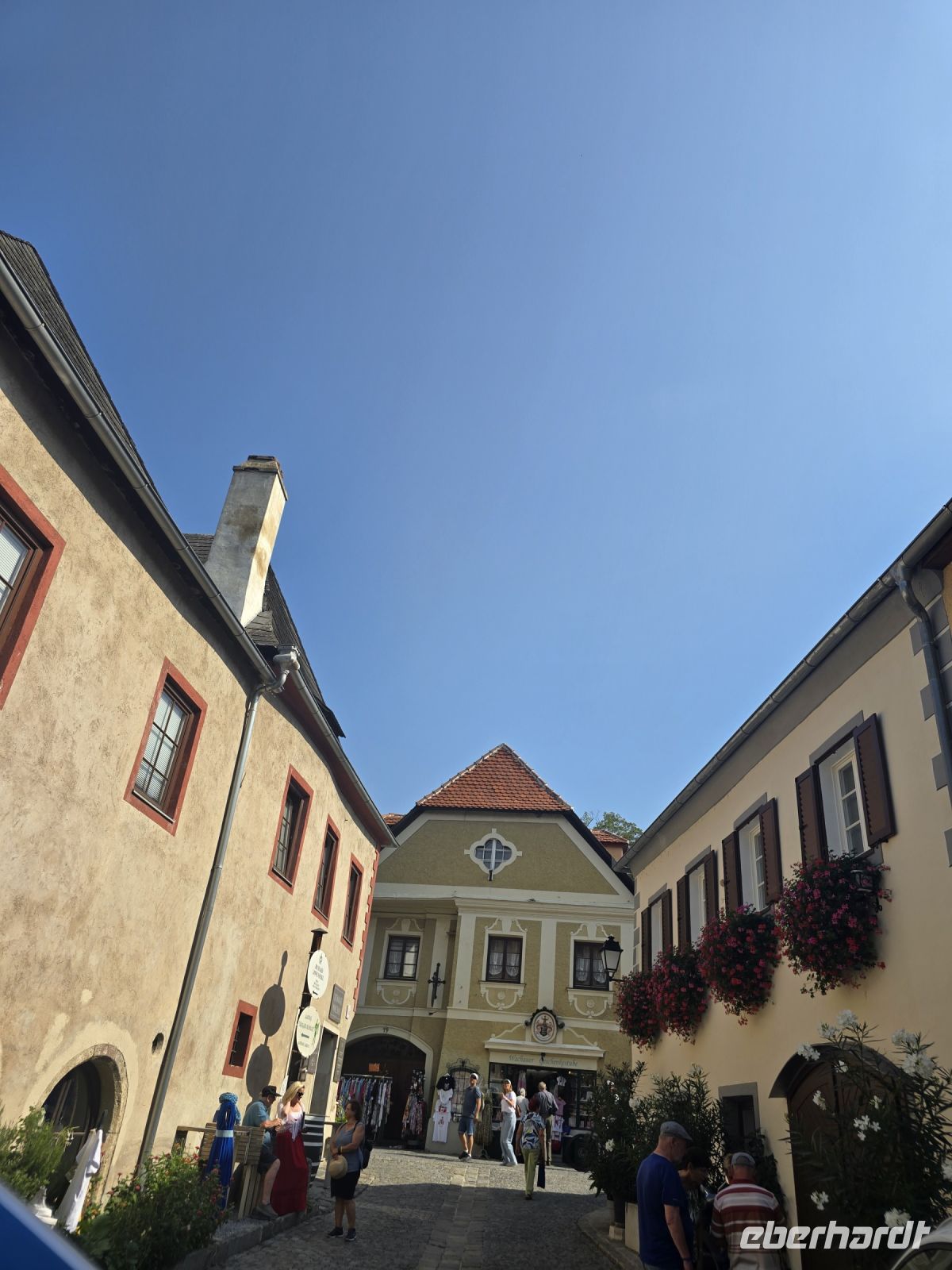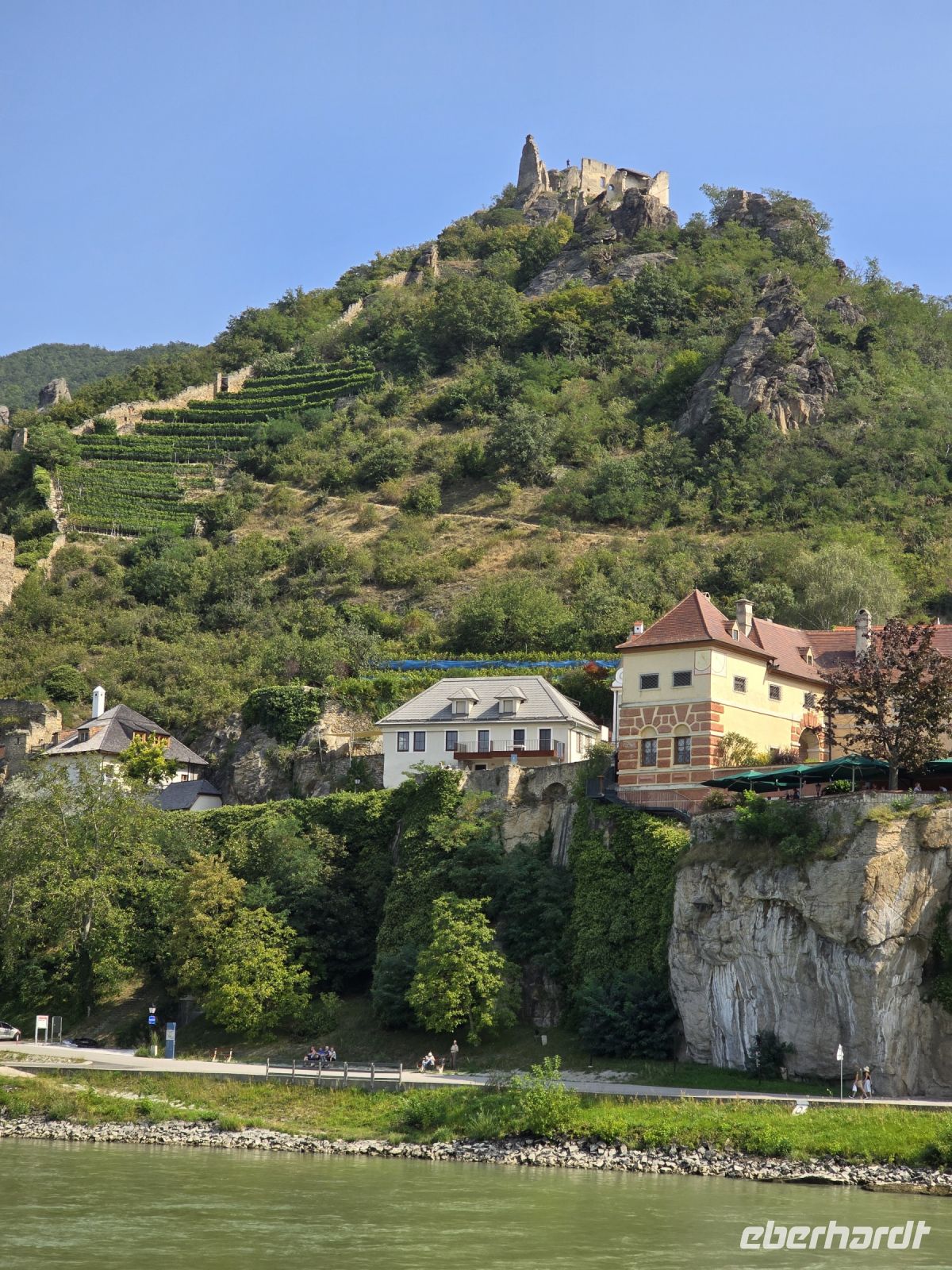 Heute brach bereits der vorletzte Tag unseres Besichtigungsprogramms an. Wir legten bei bestem Wetter, strahlend blauem Himmel und wieder hochsommerlichen Temperaturen, in Dürnstein, der Perle der Wachau, an. Einige Gäste spazierten auf eigene Faust durch die Gassen von Dürnstein und bestaunten das Stift mit dem blau-weißen Kirchturm, wo ein Museum eröffnet ist. Ganz Mutige nahmen den Weg bis zur Ruine der Burg Dürnstein (12. Jahrhundert), wo einst Richard Löwenherz gefangen gehalten wurde. Sein treuer Sänger Blondel hatte ihm das zuvor vereinbarte Lied am Fuße der Burg gesungen und der König antwortete, so die Sage. Richard Löwenherz konnte so gegen ein Lösegeld freigekauft werden. Von der Ruine eröffnete sich das Panorama des Donautales rund um Dürnstein. Viele Gäste nutzten die bequeme Fahrt mit den Zügen des Wachau-Expresses durch die Weinberge von Oberloipen und Dürnstein, wo besonders Weißwein, darunter der Grüne Veltliner, angebaut wird. Durch das Kremser Tor erreichten wir schließlich den Prangerplatz. Von hier spazierten wir durch die romantischen Gassen von Dürnstein, erfreuten uns an den schmucken Fassaden, kauften verschiedene Produkte der Winzer und der Bauern ein, darunter Erzeugnisse aus Marillen wie Marmelade oder Liköre. Gern hätten wir noch etwas in diesem gastlichen Örtchen verweilt, aber der Kapitän erwartete uns zurück an Bord. Also ging es mit dem Wachau-Express gemütlich zurück zum Schiff. Am Mittag und Nachmittag genossen wir die Passage durch das Donautal vorbei an den kleine Orten Weißenkirchen mit der Wehrkirche, die dem Ort den Namen gab, Spitz mit dem Tausendeimerberg, der Burgruine Aggstein, dem Kloster Schönhübel bis nach Melk. Diese 30 Kilometer gelten als einer der romantischsten Flussabschnitte in Österreich.
