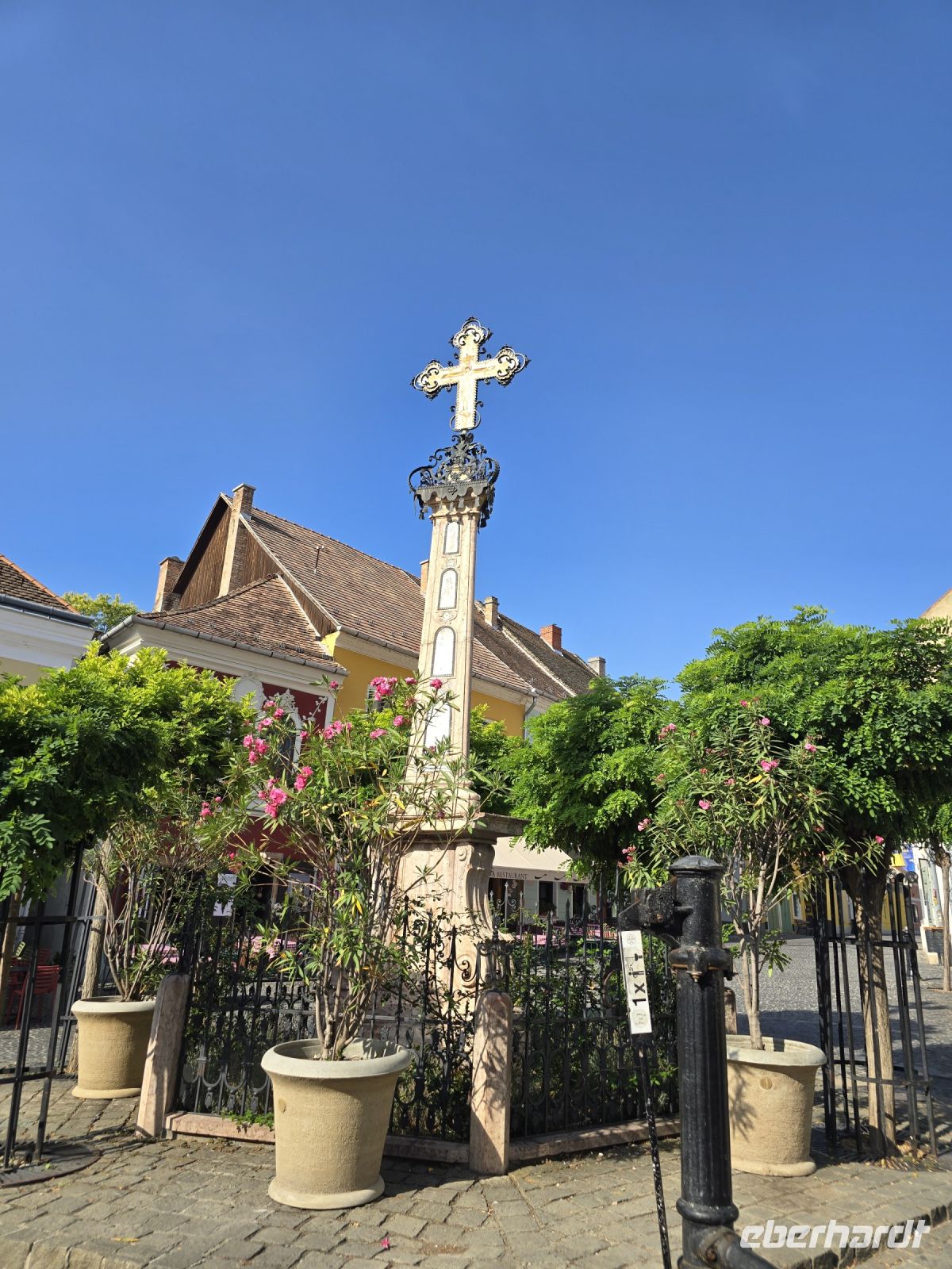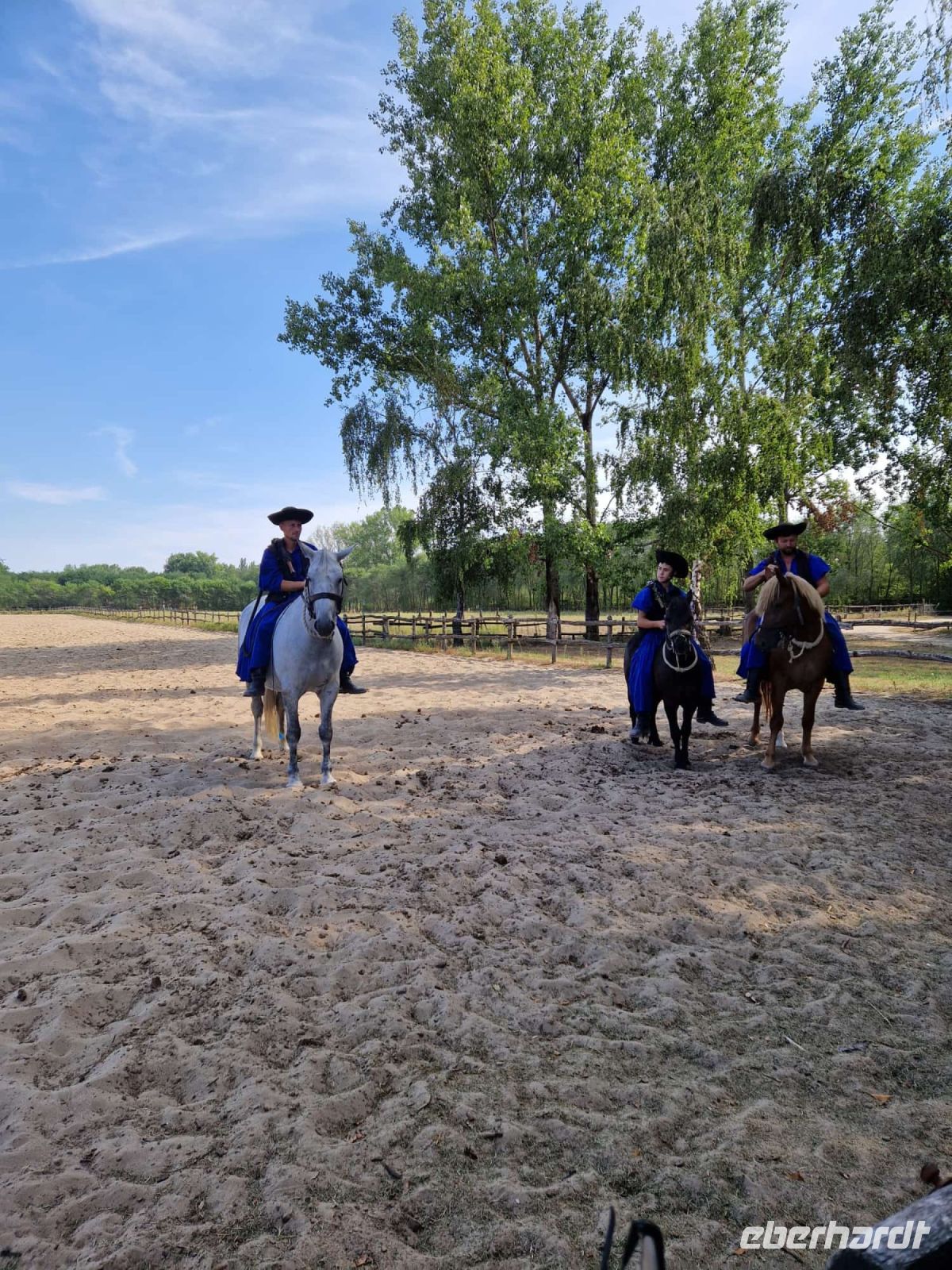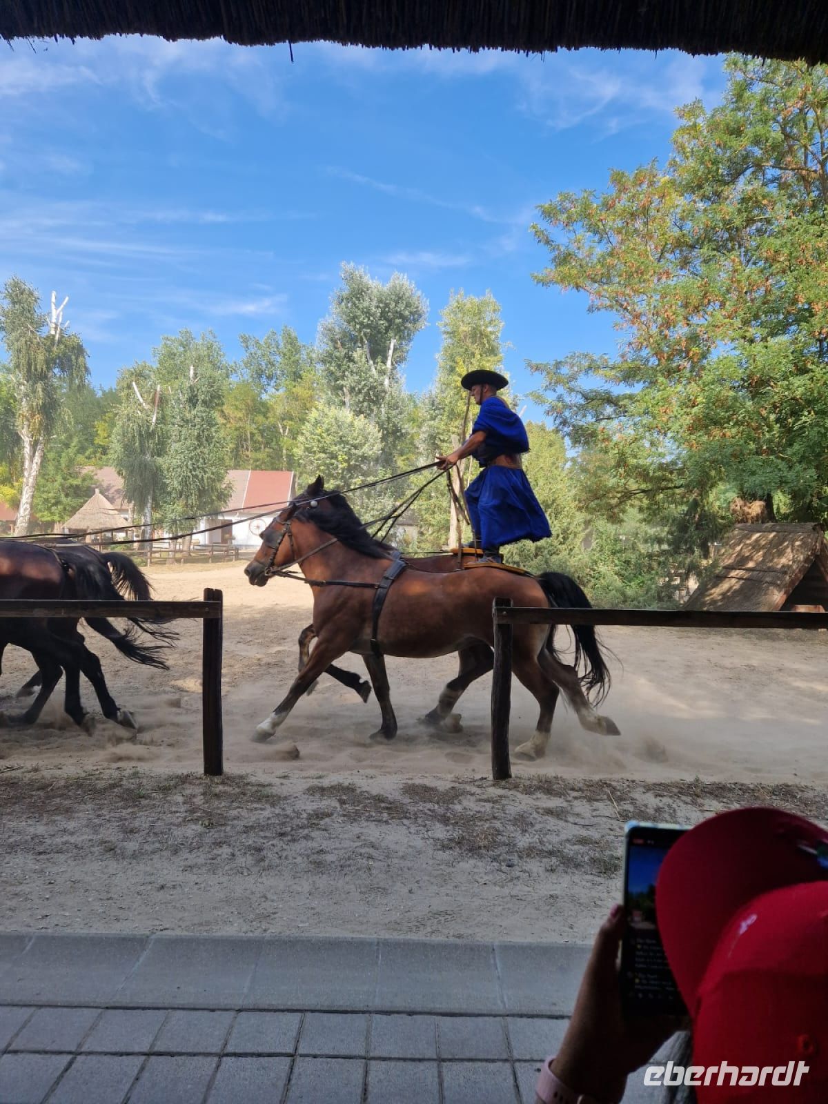 Ein Ganztages-Ausflug führte in die Puszta, in die ungarische Steppenlandschaft. Dort angelangt, wurden wir von einem Viehhirten „Csikos“ begrüßt und zur Tanyacsarda begleitet. Palinka und Schmalzgebäck gehört einfach zum Willkommen dazu. Egeszsegedre – das lernten wir schnell. Danach begaben wir uns auf eine rasante Kutschfahrt entlang der Weiden zum landwirtschaftlichen Betrieb. Mittlerweile hatten die Pferdehirten ihre Tiere zusammengetrieben und aus einer Wolke von Sand galoppierte die Herde über die große Weide. Das war noch nicht alles. Jetzt wurden uns die Kunststücke, in einer extra Arena, einstudiert von Reiter und Pferd, vorgeführt. Der Höhepunkt war die ungarische Post. Die Idee dazu hatte der Maler Ludwig Koch. Er träumte von einem stehend berittenen fünfer Gespann. Heute immer noch die große Kunst der Csikos, die nicht jeder reiten kann. Im Anschluss wurden wir mit der guten ungarischen Küche verwöhnt – Kesselgulasch! Wir setzten unseren Ausflug fort und gelangten ins kleine Städtchen Kecskemet. Unter der türkischen Herrschaft gewachsen, da es an einer wichtigen Handelsstraße lag. Das vielleicht schönste Gebäude, das im ungarischen Jugendstil erbaute Rathaus, besuchten wir zuerst. Das Dach, gedeckt mit Majolika-Kacheln, glänzte in der Sonne. Nun wurde es Zeit für die Rückfahrt zum Schiff.