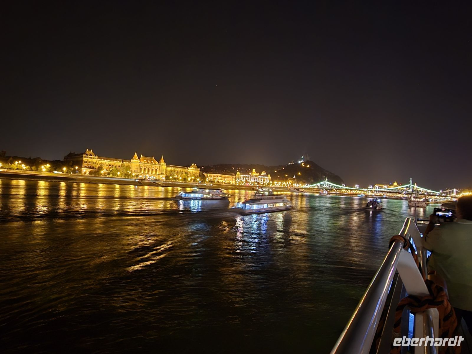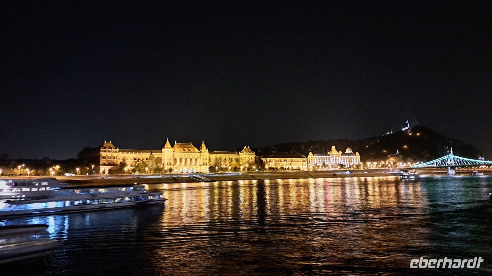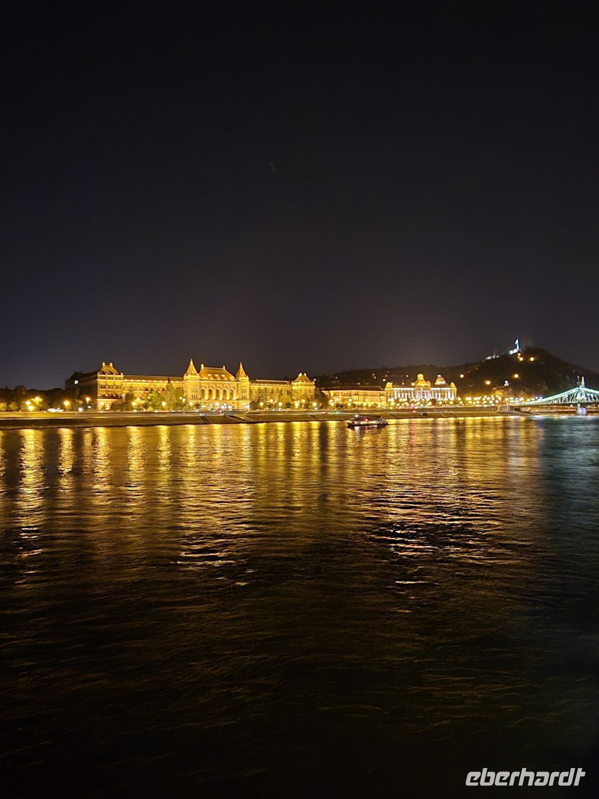 Der Abend hatte sich herabgesenkt, wir gestärkt vom Abend-Essen, die Sonne war hinter dem Horizont verschwunden und ein eigenartiges Blau umgab den Himmel. Zu dieser Stunde waren wir erneut unterwegs, um Impressionen der besonderen Art zu genießen. Wie hatte sich die Stadt zu dieser Zeit verändert? Ttausende von Lichtern reflektierten im dunklen Band der Donau. Angestrahlt lagen die Brücken über dem Strom und über allem zeigte sich ein goldenes Funkeln, ja, das ist Budapest bei Nacht. Die meisten Fassaden sind dezent angestrahlt, ebenso Straßen und Plätze und die Stadtführer hatten interessante Details parat, über welche wir nur staunen konnten. Doch wie immer im Leben, die schönen Stunden vergehen viel zu schnell! An Bord zurück genehmigten wir uns ein gutes Gläschen Wein. Eine geruhsame Nacht liegt vor uns! Die Dutch Grace ankert heute über Nacht in Budapest.