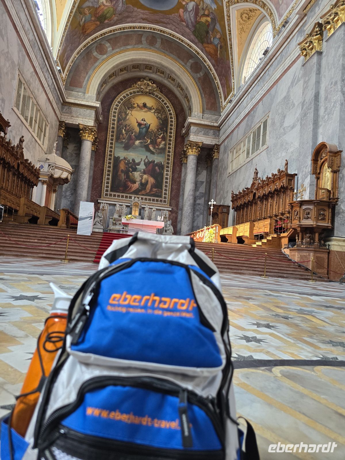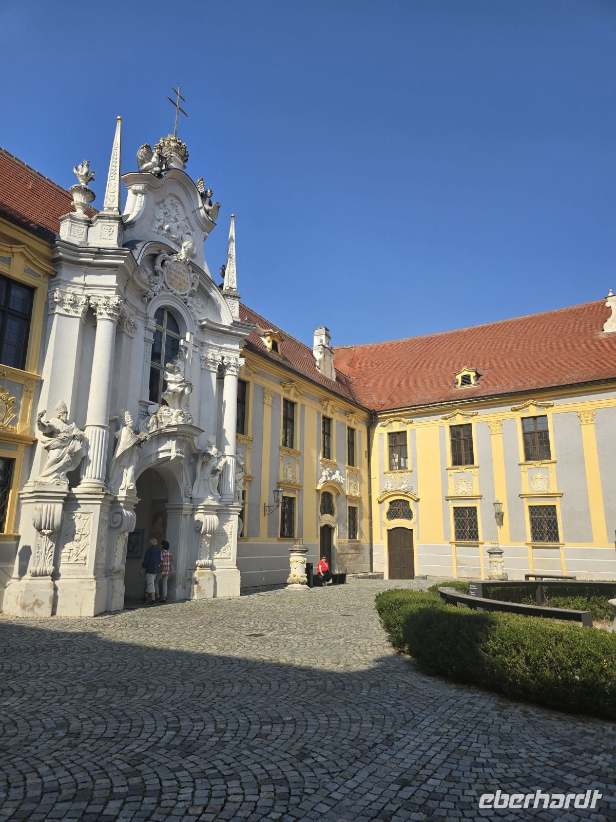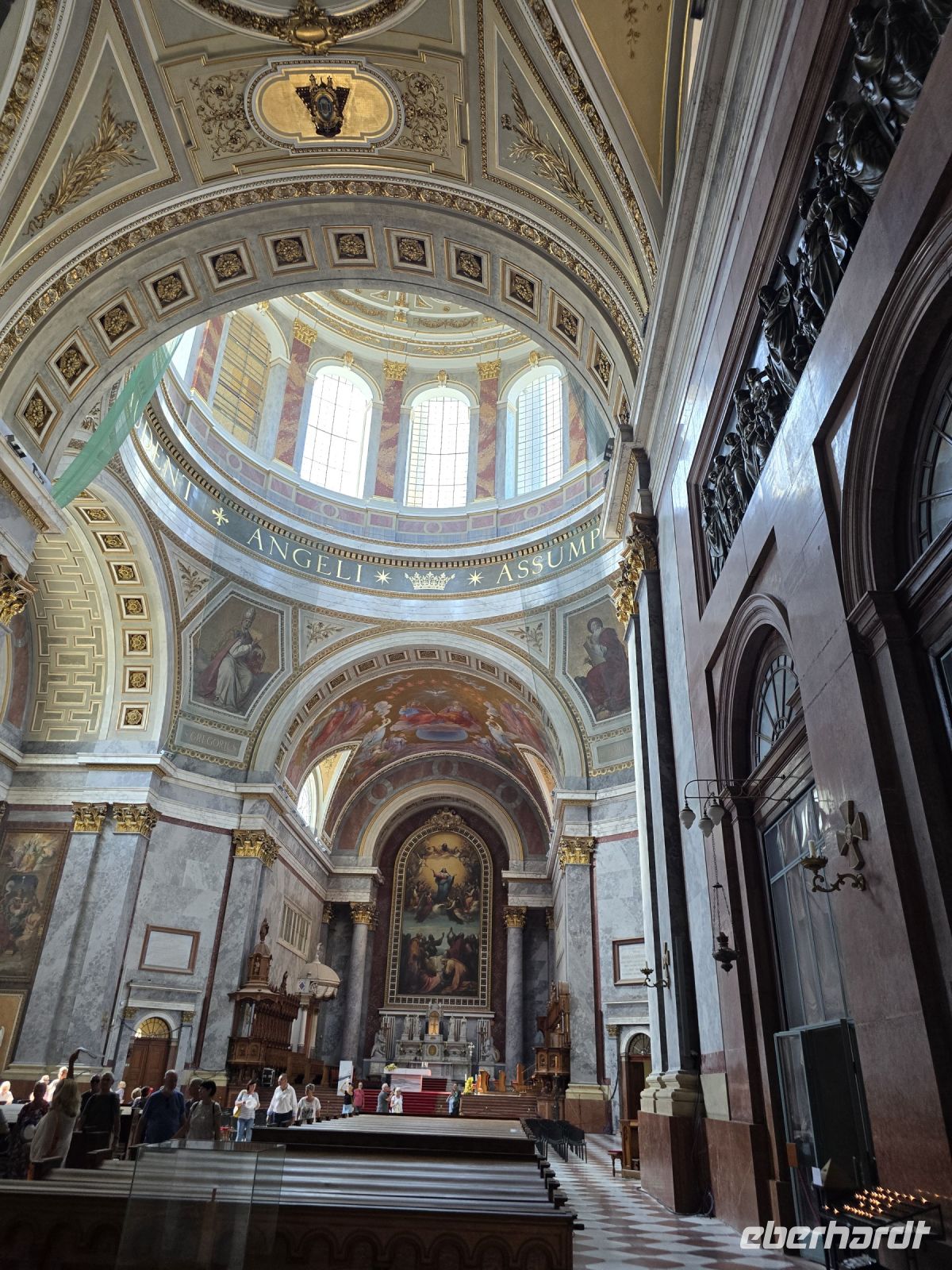 die Lebensgeister und wenig später waren wir bereit, um trotz des heißen Wetters unsere Entdeckungsreise an der Donau fortzusetzen. Punkt 8 Uhr heißt es: Leinen eingeholt, dann legt die Dutch Grace ab, um anderen Schiffen, das Anlegen schon am frühen Vormittag zu ermöglichen. Wir verabschiedeten uns von der ungarischen Metropole. Unser Ausflug führte uns entlang der Donau zuerst in das Künstlerstädtchen Szentendre, das Tor zum Donauknie, das durch sein barockes Stadtbild begeistert. Wir spazierten durch die engen Gassen vorbei an den Auslagen der Künstler und Kunsthandwerker zum Hauptplatz. Die Freizeit nutzten wir zum Stöbern in den Ateliers, Geschäften und bei den Souvenirhändlern. Weiter reisten wir vorbei an Visegrad mit seiner geschichtsträchtigen, die Szene überragenden Burgruine nach Esztergom. Schon von Weitem war die mächtige Kuppel der Kathedrale Unserer Lieben Frau und des Heiligen Adalbert zu erblicken. Der einstigen Krönungskirche der Könige Ungarns galt unser nächster Besuch an diesem Tag. Per Bus gelangten wir hinauf auf den Schlossberg und staunten beim Weg über den Stephansplatz über die mächtigen Ausmaße der majestätischen Kuppelkirche, die zugleich katholischer Bischofssitz ist. Ehrfurchtsvoll betraten wir dieses Gotteshaus, wo König Stephan zum 1. König Ungarns gekrönt wurde. Es gilt als die Mutterkirche Ungarns und über der Hauptfront ist die Inschrift Haupt, Mutter und Lehrerin der ungarischen Kirchen zu lesen. Wir bestaunten über dem Hochaltar das größte auf Leinwand gemalte Bild der Welt: Michelangelo Grigoletti schuf die Darstellung der Mariä Aufnahme in den Himmel nach dem bekannten Werk von Tizian in den Jahren von 1846 – 1854. Die Zeit reichte für einen kurzen Blick auf die Donau und hinüber auf die östlichste Stadt des slowakischen Donaulandes, nach Sturovo. Zurück an Bord stärkten wir uns beim Mittagessen. Unser Schiff hatte nun in Richtung Wien abgelegt. Den Nachmittag und den Abend nutzten wir zum Entspannen an Bord.