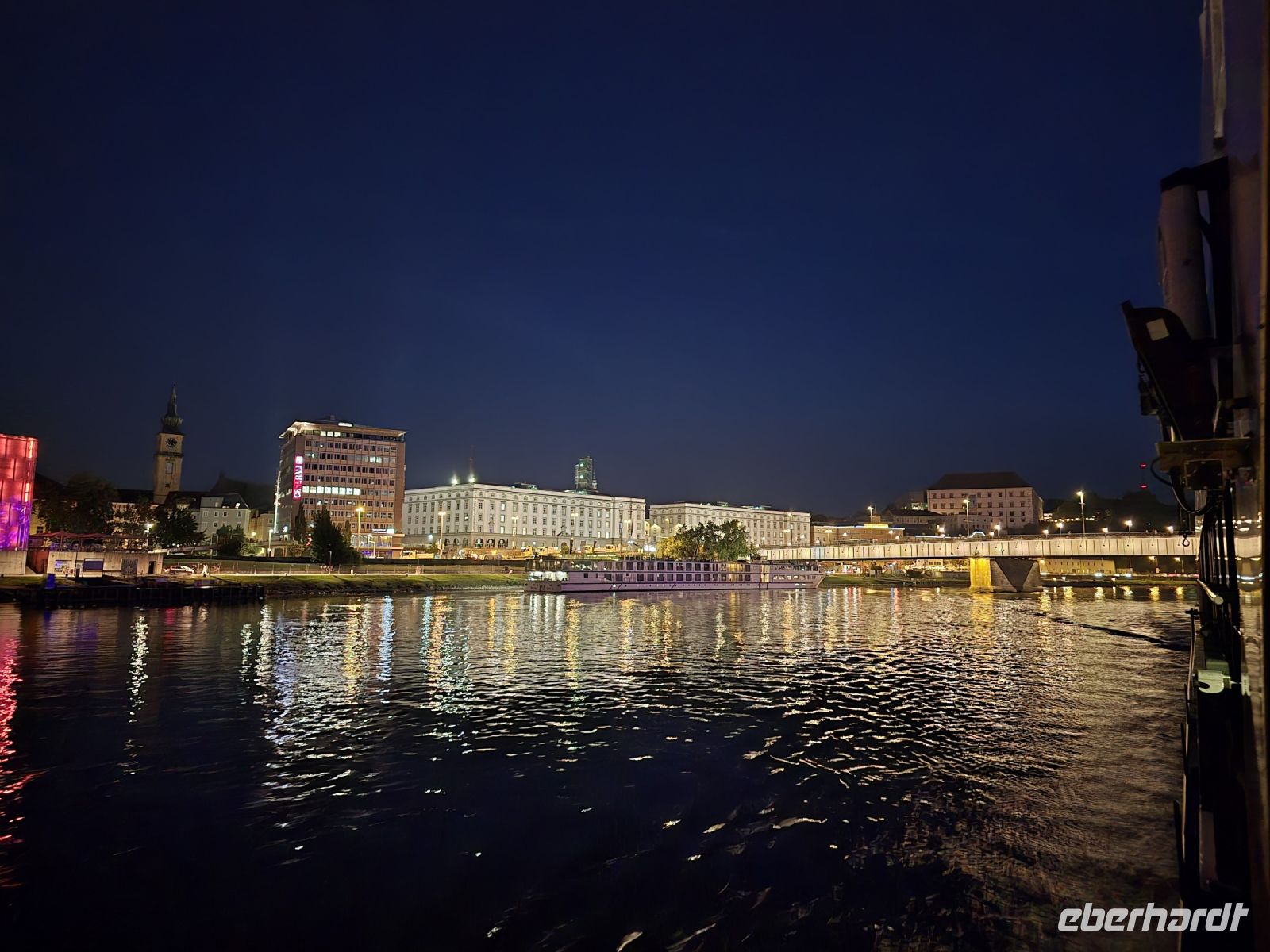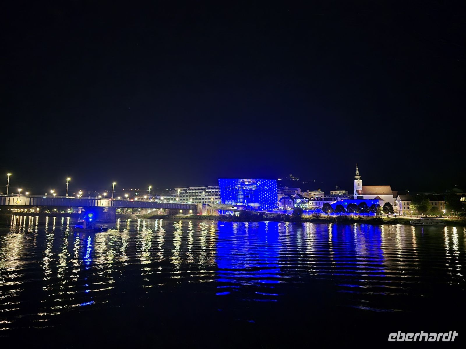 Den letzten Abend unserer Fluss-Kreuzfahrt verbrachten wir in Linz. Hier fand gerade das Brucknerfest statt. Der Komponist erblickte 1824 das Licht der Welt. Zu seinem 200. Geburtstag gab es eindrucksvolle Konzerte und Klangwelten. Wir erlebten heute die Generalprobe der Linzer Klangwolke 2024 unter dem Motto „52 Hz Pioneers“: Acht Pionier:innen und ihre Visionen, ihre Forschungen, ihre Expertisen, ihr Entdeckerdrang und ihr Mut standen im Zentrum, darunter Mileva Maric (die spätere, erste Ehefrau von Albert Einstein), Gustav Klimt, Marie Curie, Johannes Kepler und anderen. Zudem lud uns der Kapitän zum Abschieds-Dinner ein. Wer wollte, konnte den Tag und die Reise beim Tanzabend mit Katrin Wettin ausklingen lassen. Pünktlich nahm unser Schiff Kurs auf Passau.