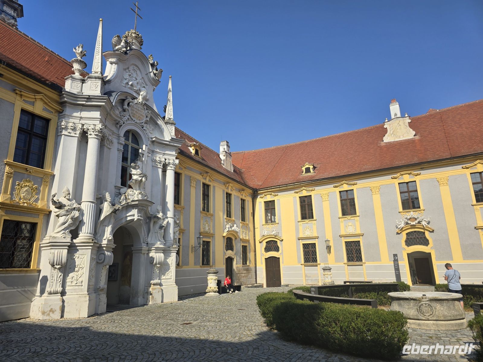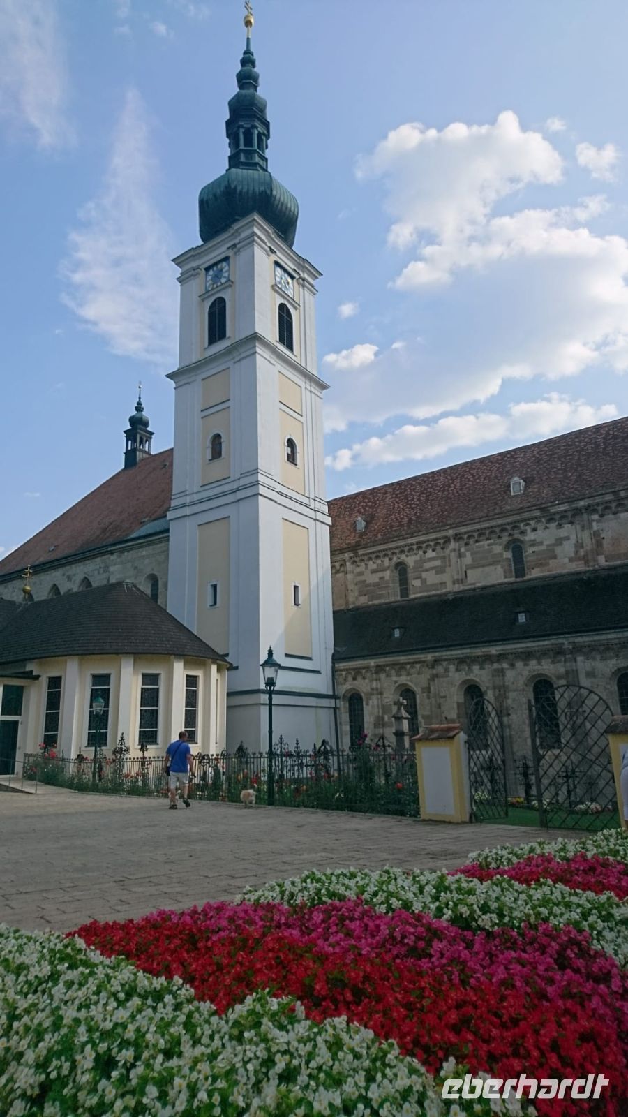 Der nachmittägliche Ausflug führte in den Wiener Wald. Er liegt ca. 50 km südwestlich von Wien und ist ein beliebtes Naherholungsgebiet. Unseren ersten Halt machten wir am weltweit zweitältesten Zisterzienserkloster Stift Heiligenkreuz. Es besteht ohne Unterbrechung seit seiner Gründung im Jahr 1133. Wir besichtigten den romanisch-gotischen Kreuzgang mit einem liebevoll gepflegten Garten und abschließend die Kirche, in der die Heiligen Messen stattfinden. Nach etwas Freizeit fuhren wir weiter zum Kurort Baden. Wir spazierten durch die Gassen der Stadt bis zum Kurpark und Casino. Schon die Römer bauten in der Region um Baden Wein an. Sie waren es auch, die die Thermen des