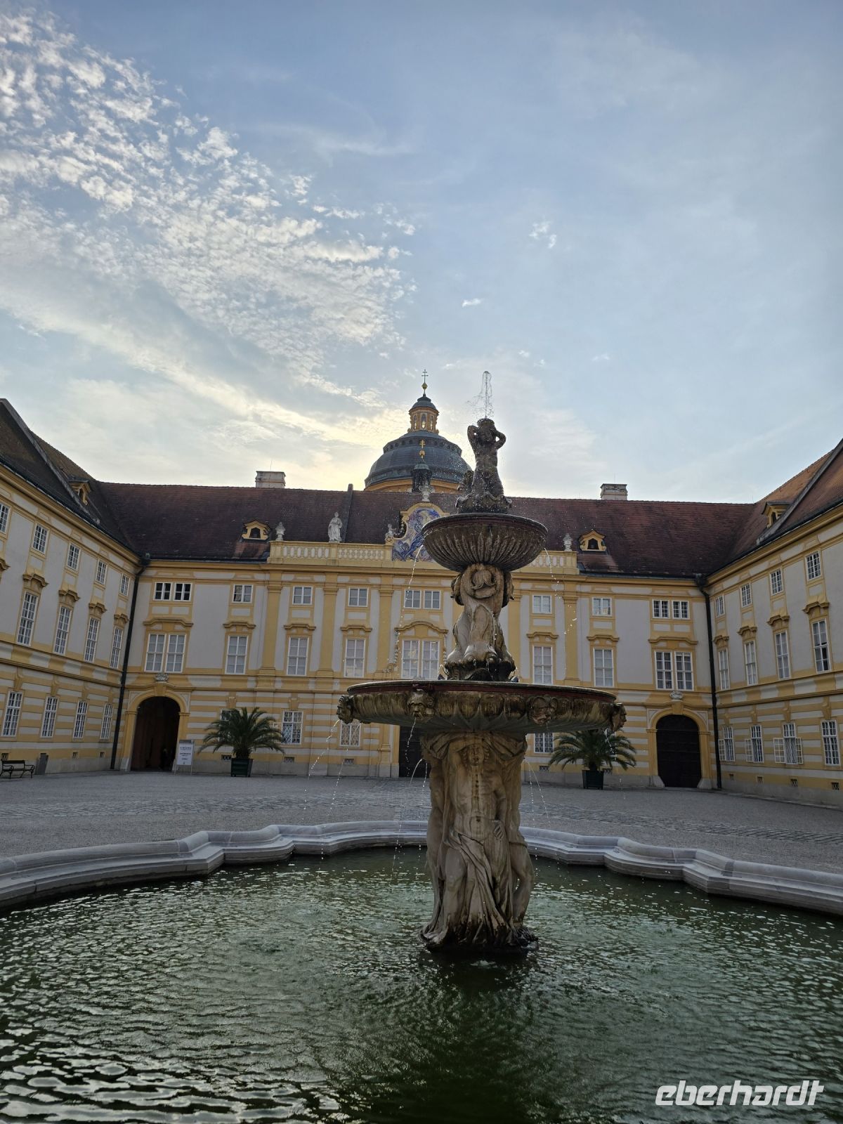 Schon von Weitem erblickten wir die gewaltige Anlage des Stiftes Melk, die größte barocke Klosteranlage Österreichs mit der Stiftskirche, dem Marmorsaal, der Stiftsbibliothek, dem Stiftsgymnasium und dem Stiftspark. Gäste, die sich für den Besuch des Stiftes entschieden hatten, fuhren mit dem Bus hinauf und erfreuten sich an einer Führung im Inneren. In der Stiftsbibliothek erhielten Sie einen kleinen Einblick: Insgesamt sind es 12 Räume mit 100.000 Bänden, wo das Wissen von Jahrhunderten vereint ist. Es blieb Zeit für einen Blick in den Prälatenhof und einen Spaziergang im Garten des Stiftes. Am späten Nachmittag erreichten alle Gäste den Schiffsanleger unterhalb des Stiftes. Wir lagen in der zweiten Reihe, denn natürlich hatten weitere Kreuzfahrtschiffe hier einen Stopp. Die MS Dutch Grace nahm über Nacht Kurs auf Linz.