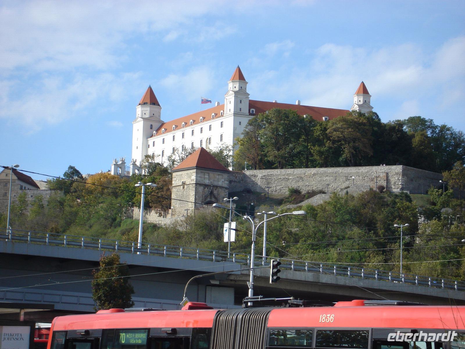 In Bratislava ankerte unser Schiff unterhalb der Burg nahe der Neuen Brücke mit dem bekannten UFO-Restaurant. Das Wahrzeichen Bratislavas, die monumentale Burg mit ihren 4 markanten Türmen, begrüßte uns in strahlendem Weiß. Unser örtlicher Reiseleiter Jan erwartete uns schon, denn wir hatten ein wenig Verspätung und wirklich nicht viel Zeit. Aber wir hatten die Sonne mitgebracht. Jedenfalls sagte das Jan, der sich für uns über das Wetter freute.