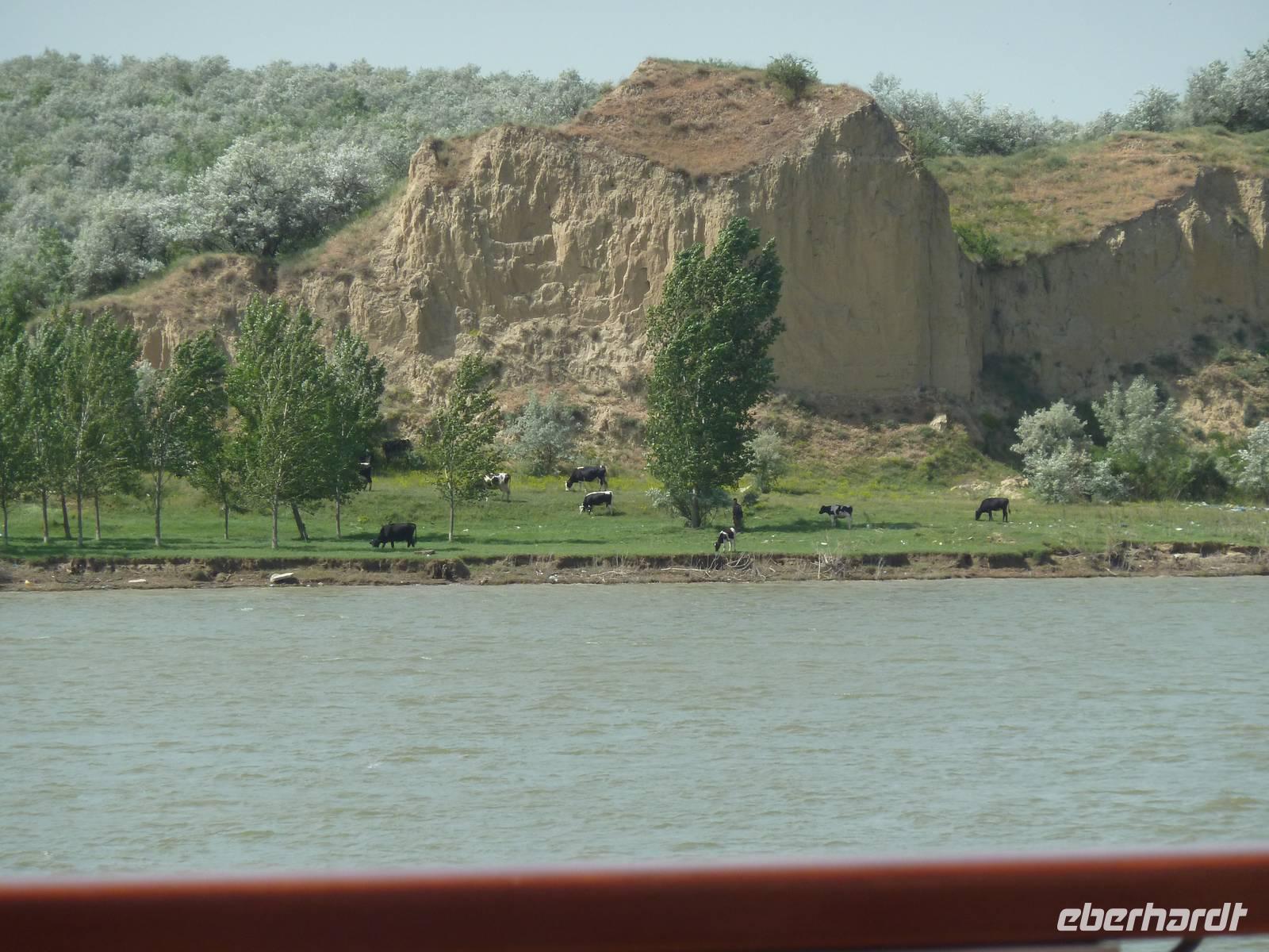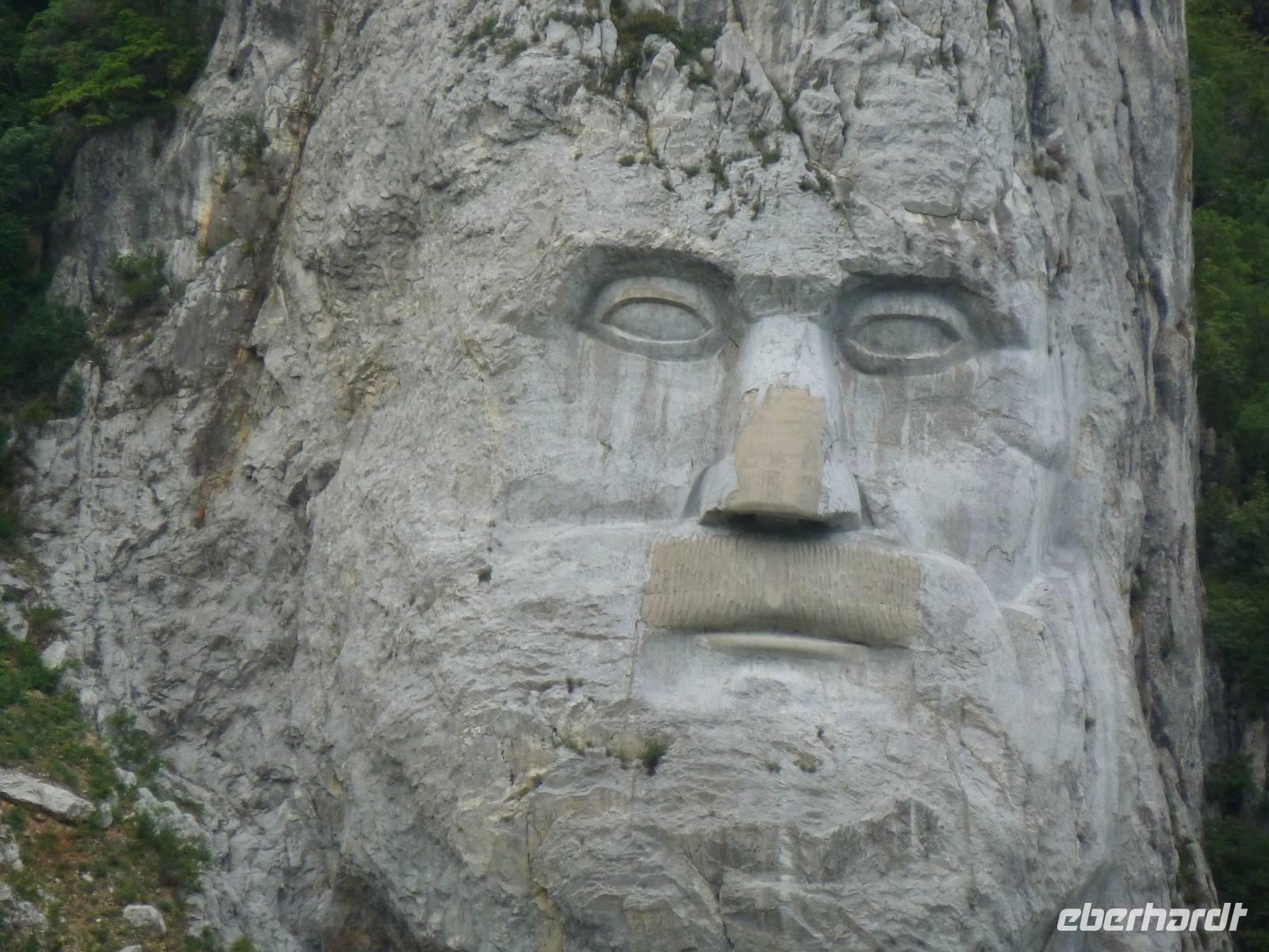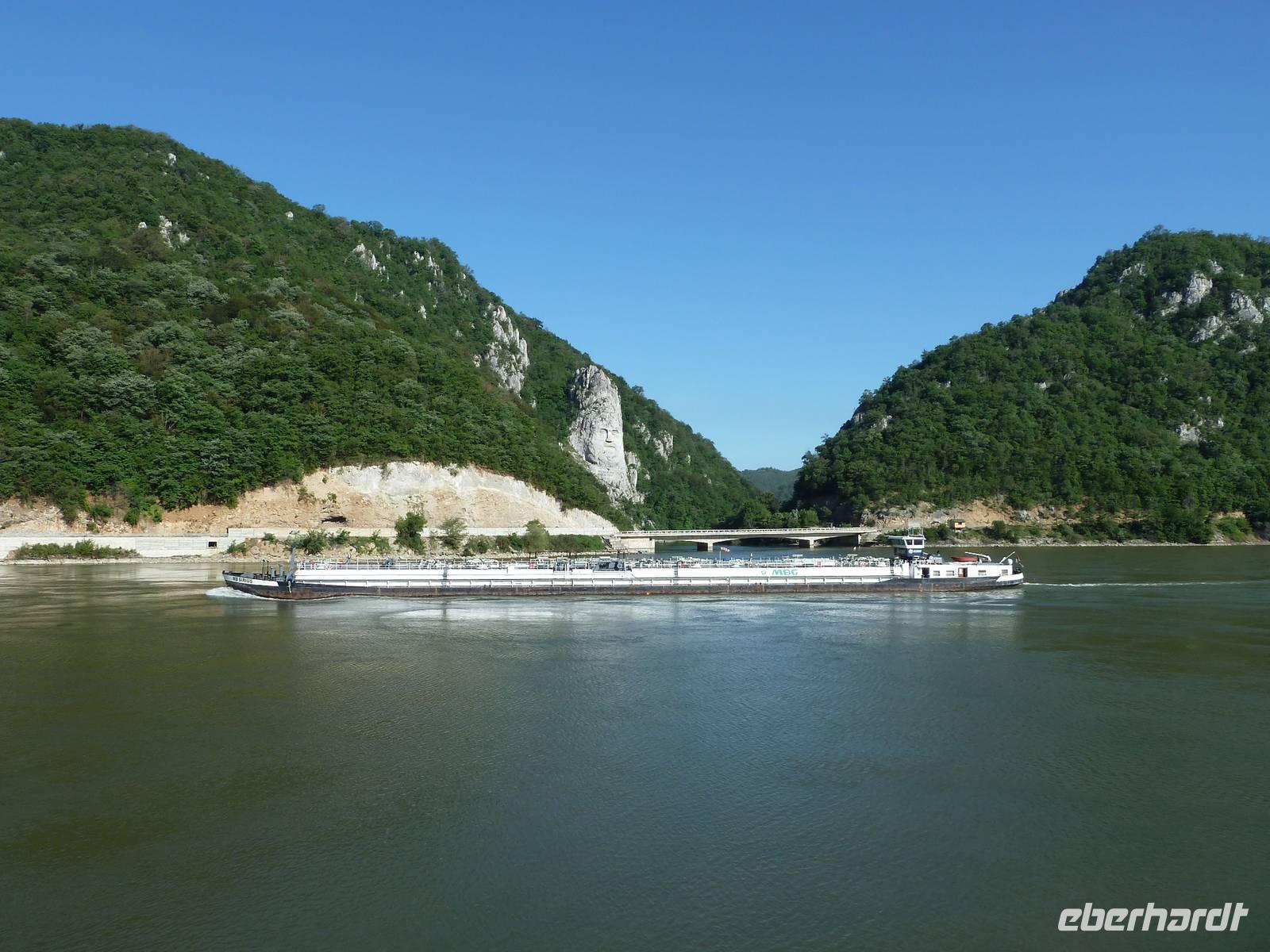 Der heutige Tag begann schon früh mit dem wohl imposantesten Abschnitt der Reise, die 130 km lange Kataraktenstrecke. Beiderseits der Donau ragen bizarre steile Felswände auf, die Ausläufer der Südkarpaten und des Westbalkans, daher nennt man es auch „Donau-Gibraltar". Die Fahrt bis zum „Eisernen Tor" beeindruckte uns durch das einmalige Landschaftsbild. Steile Schluchten im Wechsel mit Buchten und breiteren Flusspassagen waren eine landschaftliche Augenweide. Auch zahlreiche Zeugnisse aus der Geschichte entdeckten wir zu beiden Seiten des Ufers. Unter Kaiser Trajan wurde einst eine Römerstraße in die Felsen gehauen. Die verwitterte „Tabula Trajana" (Trajanstafel) auf der serbischen Seite erinnert an den Bau und wurde im Jahr 101 zu Ehren des römischen Kaisers angebracht. Am rumänischen Ufer sahen wir ein modernes, in den Fels geschlagenes Relief: Der letzte Dakerkönig Decebal, von Trajan besiegt, blickte streng auf die Donau herab. Am Nachmittag wurde die Donau zum Grenzfluss zwischen Rumänien und Bulgarien und trat in die große Ebene der Walachei ein.