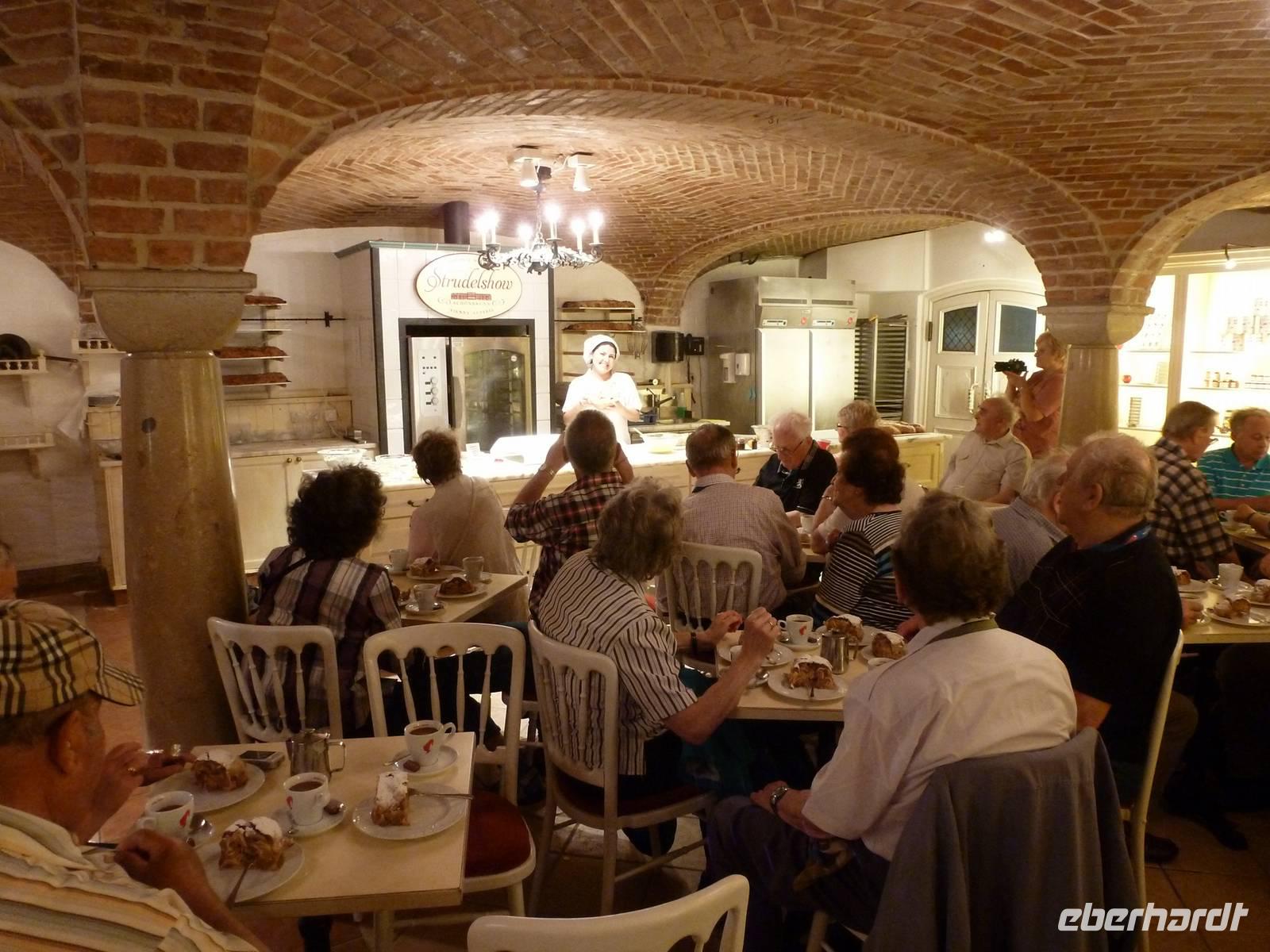 Nach der ersten schleusenreichen Nacht erreichte die A-ROSA MIA mittags Österreichs Hauptstadt Wien, leider bei Regen. Unser örtlicher Reiseleiter Wolfgang führte uns zum Bus für die Stadtrundfahrt. Wir sahen das berühmte Riesenrad am Prater und hörten die Geschichte zur Entstehung der Ringstraße samt deren Prachtbauten, die wir nun aus dem Bus bestaunten. Der Regen ließ nach und es schien die warme Sonne als wir auf dem Weg zum Stephansdom waren. Dank Wolfgang wissen wir jetzt genau, was es mit den Türmen des „Steffl" auf sich hat. Nun fuhren wir zum Schloss Schönbrunn. Die Zeit der KuK-Monarchie konnten wir während einer Führung durch die historischen Räume förmlich spüren. Seit der informativen und unterhaltsamen Apfelstrudelshow haben wir einen Fachmann für die Herstellung dieser Leckerei unter uns! Leider ging es schon wieder zum Schiff zurück. Am Abend stellten sich bei einem Willkommens-Drink der Kapitän, der Hotelmanager und alle Offiziere der A-ROSA MIA vor.