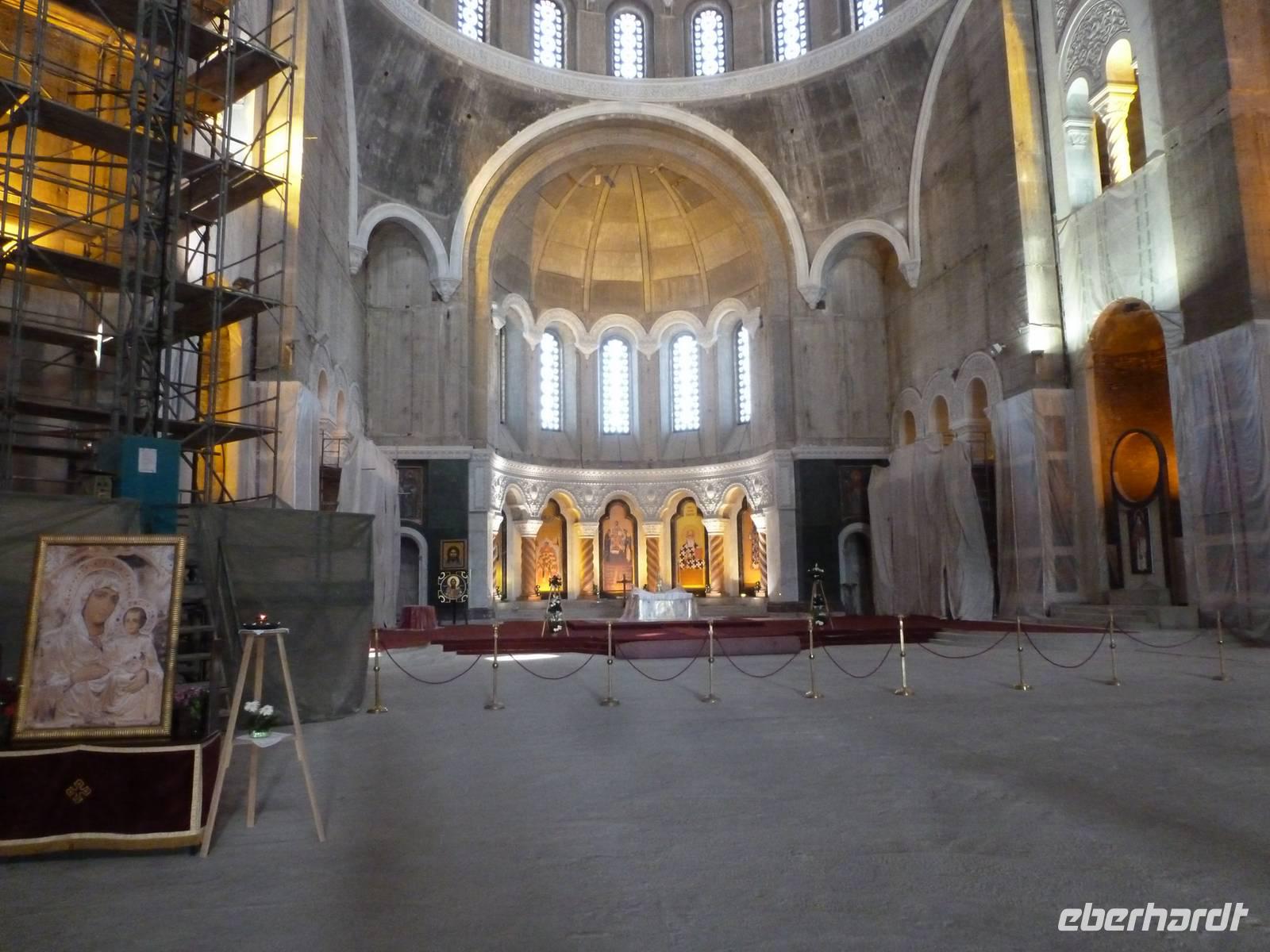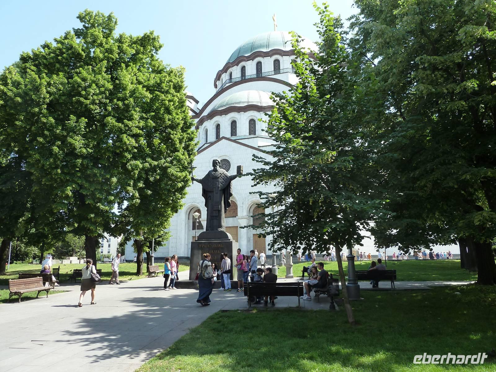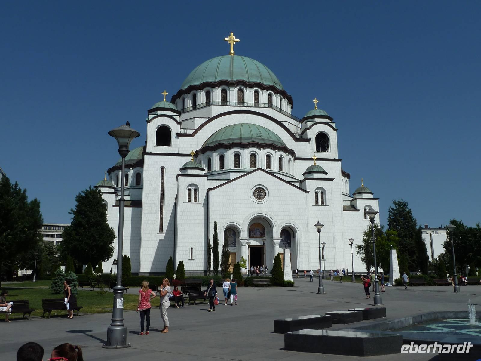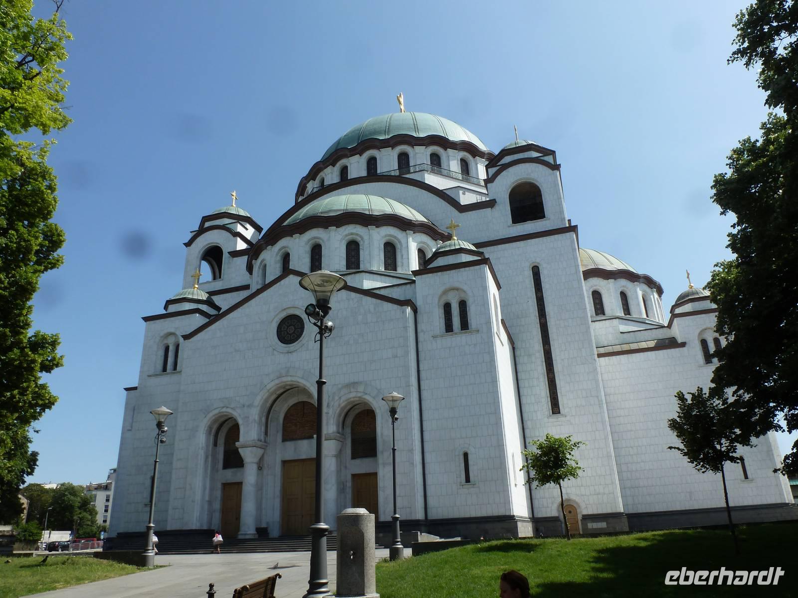 Heute Morgen stießen wir mit Sekt auf eine wunderschöne Reise an. Bereits am Vormittag erreichten wir Belgrad, die serbische Hauptstadt. Gleich nach dem Mittagessen standen schon die Reisebusse und Stadtführer bereit, um uns ihre Stadt zu zeigen. Zunächst kamen wir in einen Stau - wie in jeder Großstadt. Bei der orientierenden Rundfahrt zeigte uns Dima, unser Stadtführer, unter anderem das „Alte" und das „Neue Schloss", das Haus des „Cafe Fragezeichen" und dessen Geschichte, Botschaften, Tito-Museum und -Grabstätte. Dann besuchten wir die auf einem Hügel befindliche Kathedrale des Heiligen Sava. Die Grundsteinlegung war 1939, aber erst 1995 wurde der Bau mit der gewaltigen Kuppel beendet. Die Fertigstellung der Innenausstattung wird sicher noch einige Jahre dauern. Dann zeigte uns Dima den trubeligen Platz der Republik mit Nationalmuseum und Reiterstandbild sowie die Fußgängerzone. Im Anschluss ging es zur Festungsanlage mit Park Kalemegdan, ohne Zweifel die Sehenswürdigkeit Belgrads. Beim Siegesmonument bot sich ein weiter Rundblick auf die Donau, die Save, das gegenüberliegende Novi Beograd und das weite Land.