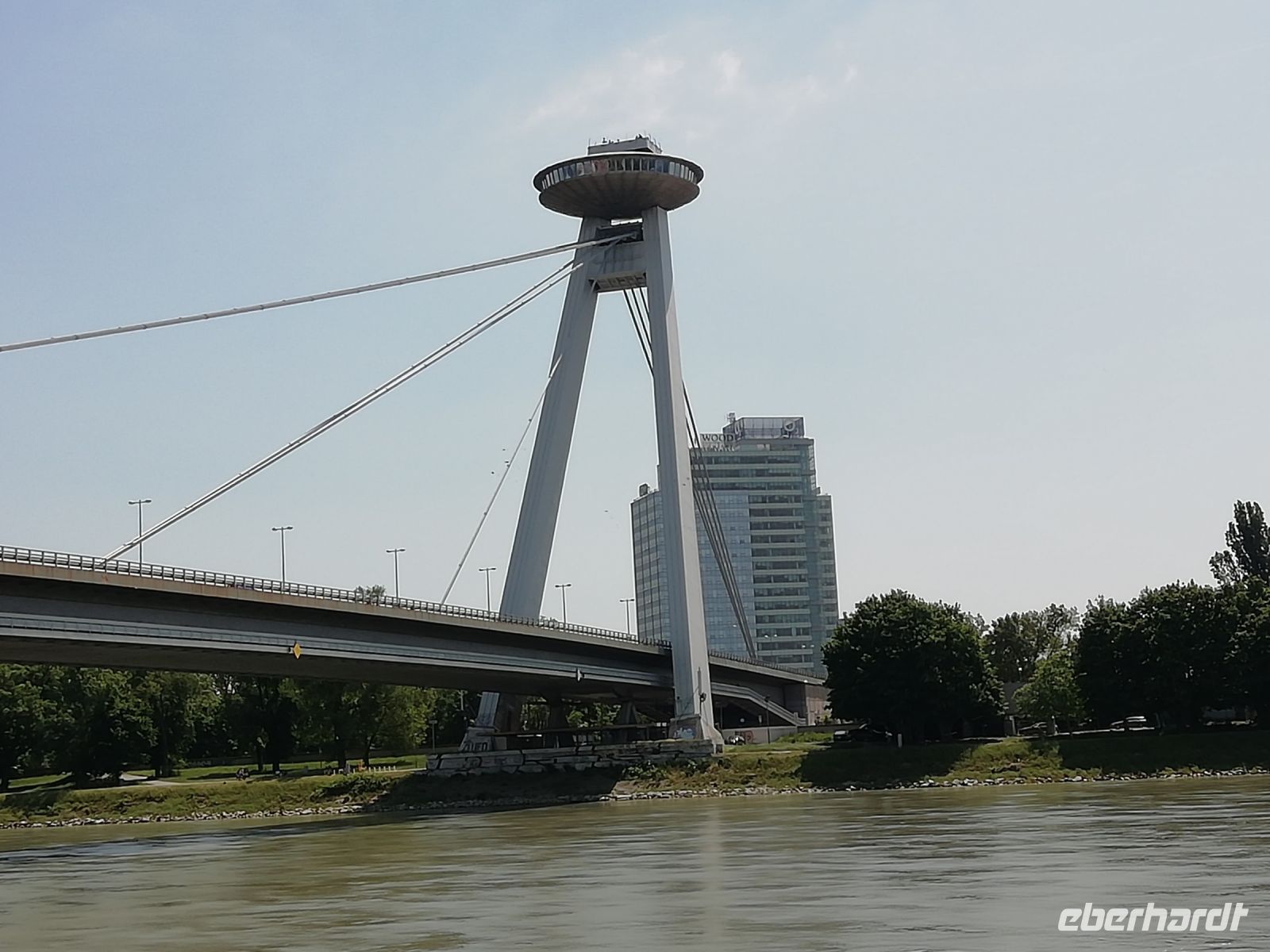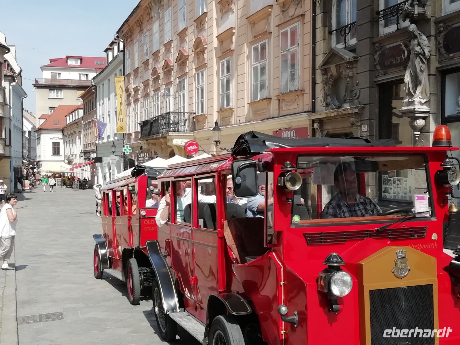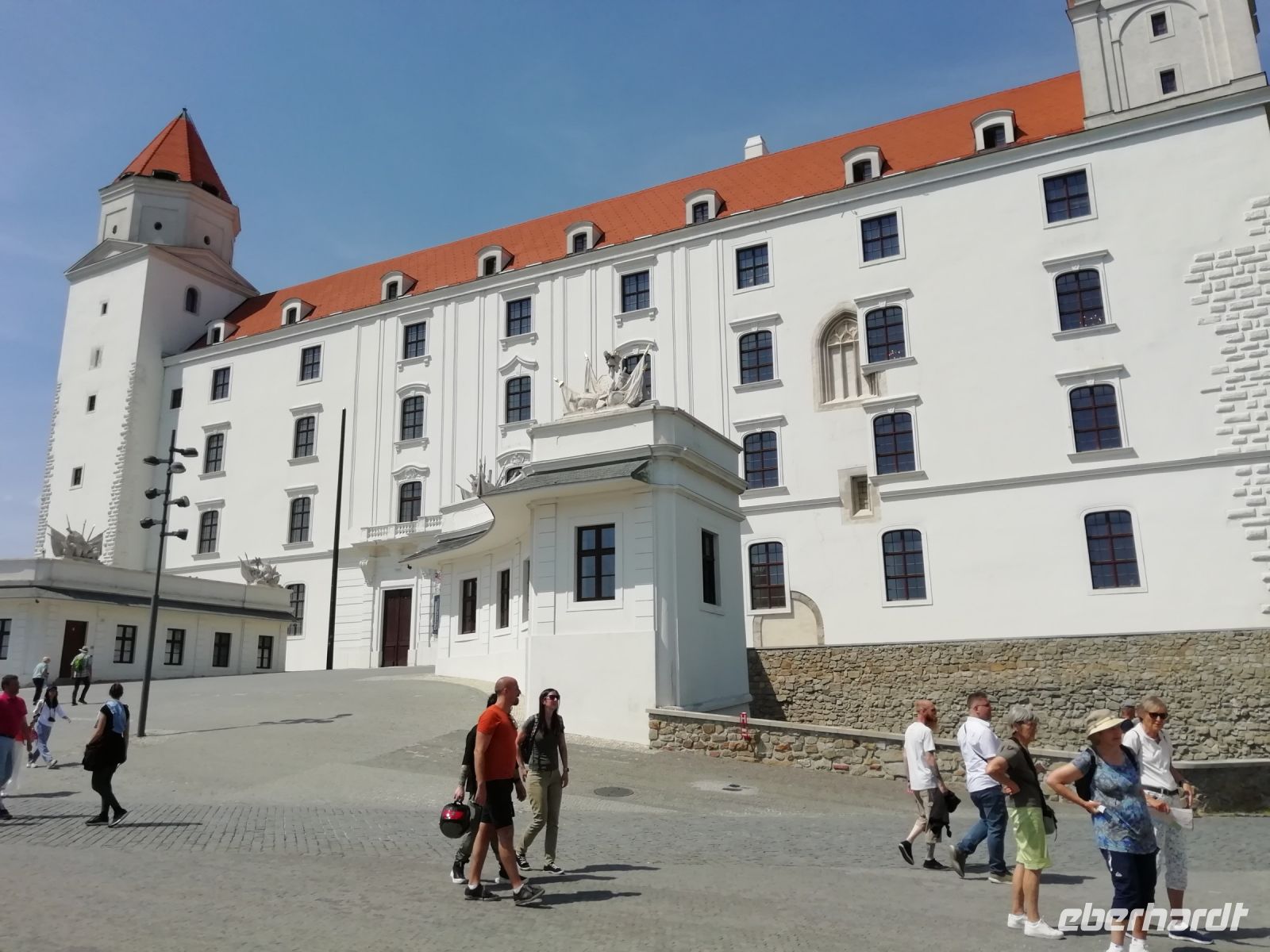 Nach dem Mittagsmenü erreichen wir sie slowakische Hautstadt Bratislava. Hier steht der Bus mit der örtlichen Stadtführerin für uns schon bereit. In der nähe der Schrägseilbrücke mit dem einem UFO ähnelnden Turmrestaurant beginnt unsere Stadtrundfahrt. Sie führt uns zuerst vorbei am Au-Garten hinauf zum Prestige-Viertel von Bratislava, wo Prominente aus Film und Fernsehen, politiker und Botschafter wohnen und wir einen tollen Blick über die Stadt haben. Unser nächstes Ziel ist die Pressburg, die im Volksmund auch "umgekehrter Tisch" genannt wird. Heute bedinet sich in der Burg das Nationalmuseum. Neben der Burg sehen wir das Parlament. Nach einer kleinen Führung bleibt Zeit zum Fotografieren, denn das Panorama ist phantastisch und der Blick reicht bis Österreich. Dann bringt der Bus uns wieder hinunter. zu Fuß erkunden wir nun die Altstadt. Von der Pestsäule geht es zum Dom St. Martin, wo Maria Theresie 1741 gekrönt wurde. Wir sehen u.a. das alte Rathaus, das Michaelertor, das Palais Grassalkovich, das Erzbischöfliche Sommerpalais und das Primitialpalais, kommen durch viele kleine Gassen und über schöne Plätze. Dem Kanalarbeiter Cumil, der uns lachend aus einem Gulli beobachtet, können wir nur von der gegenüberliegenden Seite zuwinken, denn auf der Straße findet gerade eine Kinderrallye statt. Außerdem sind zahlreiche Oldtimer in der Stadt. Am Nationaltheater endet der Rundgang. Bei den sommerlich-heißen Temperaturen suchen sich die meisten Gäste ein schattiges Plätzchen ein einem der vielen Straßencafes.