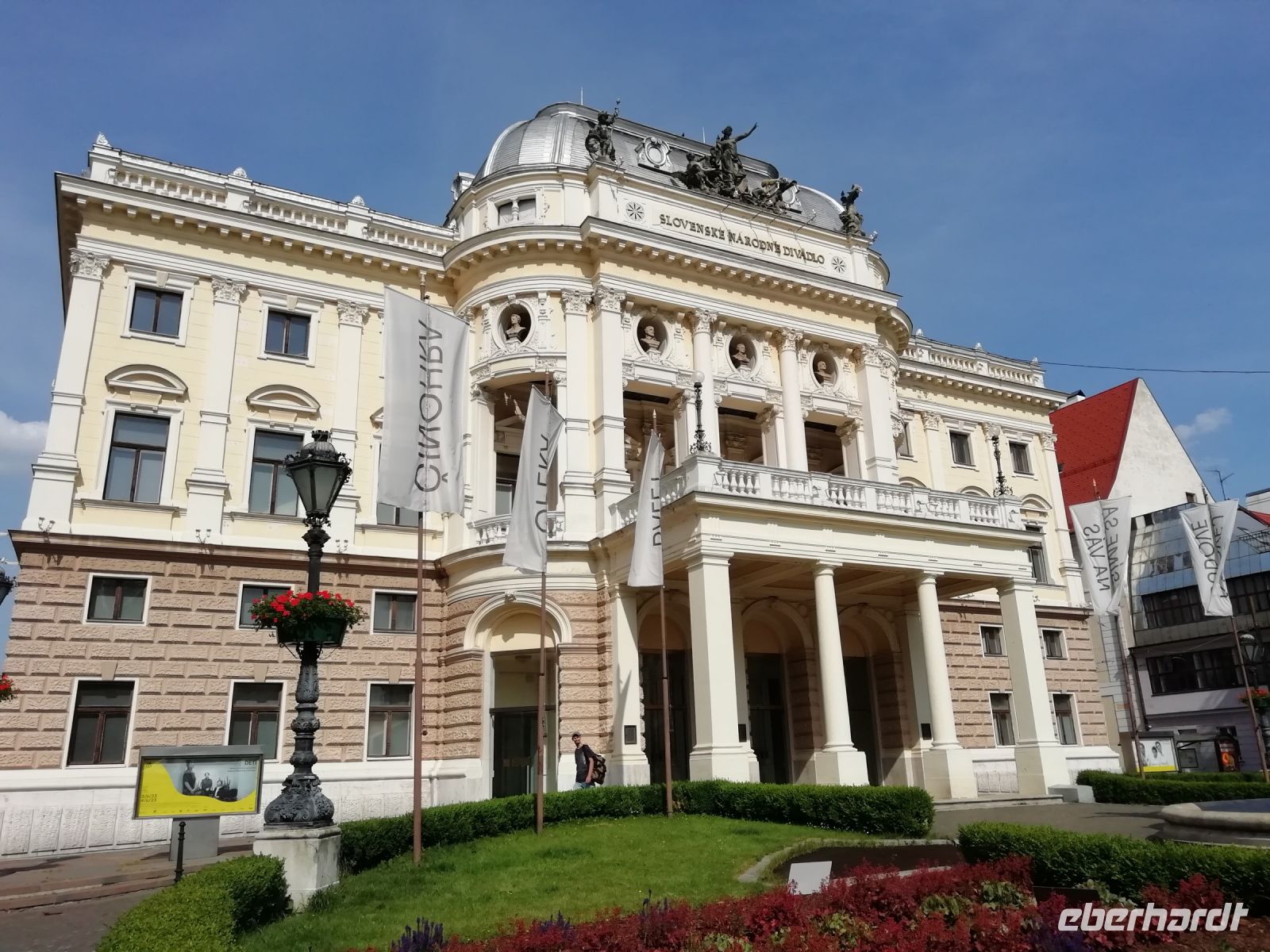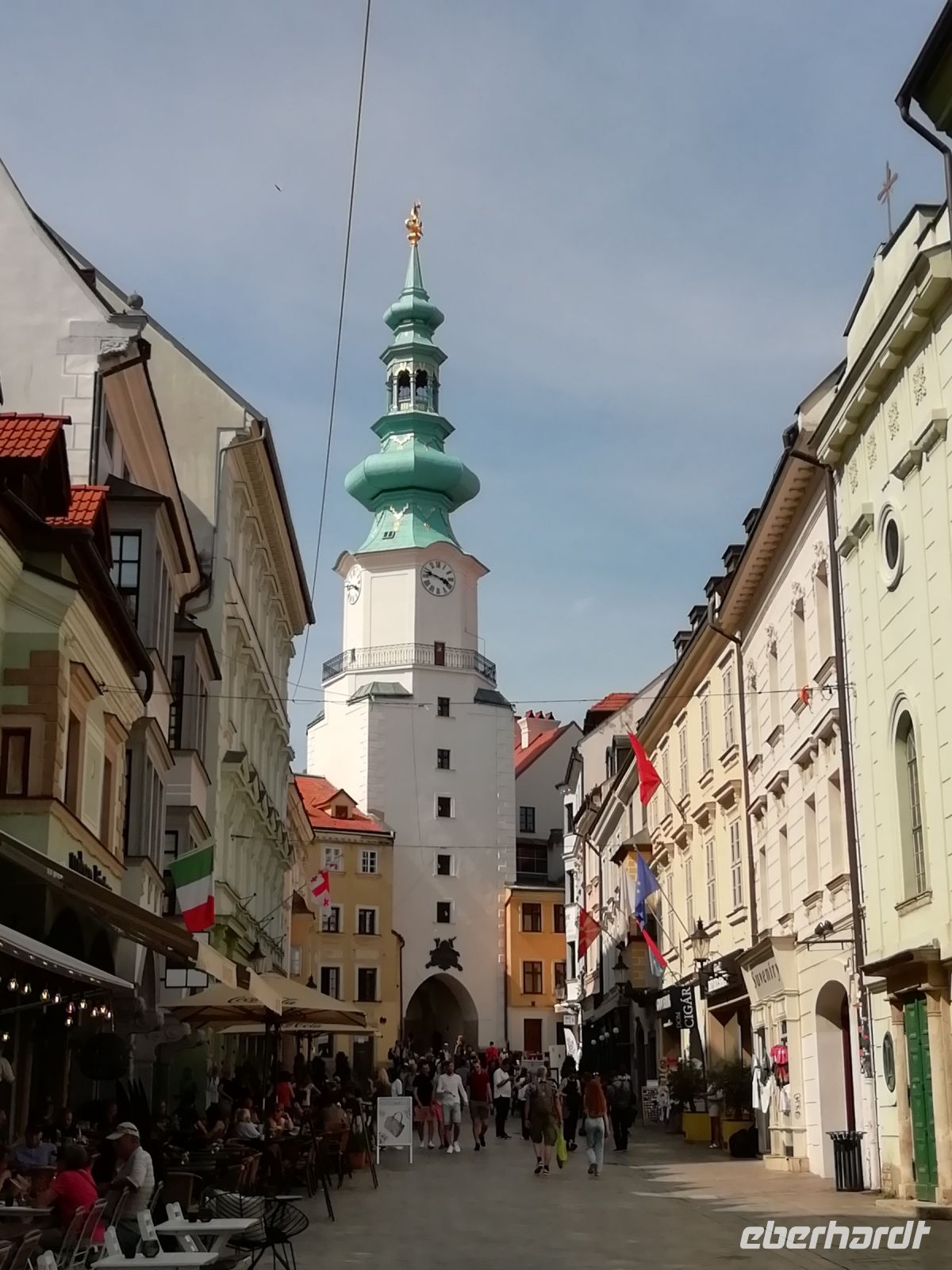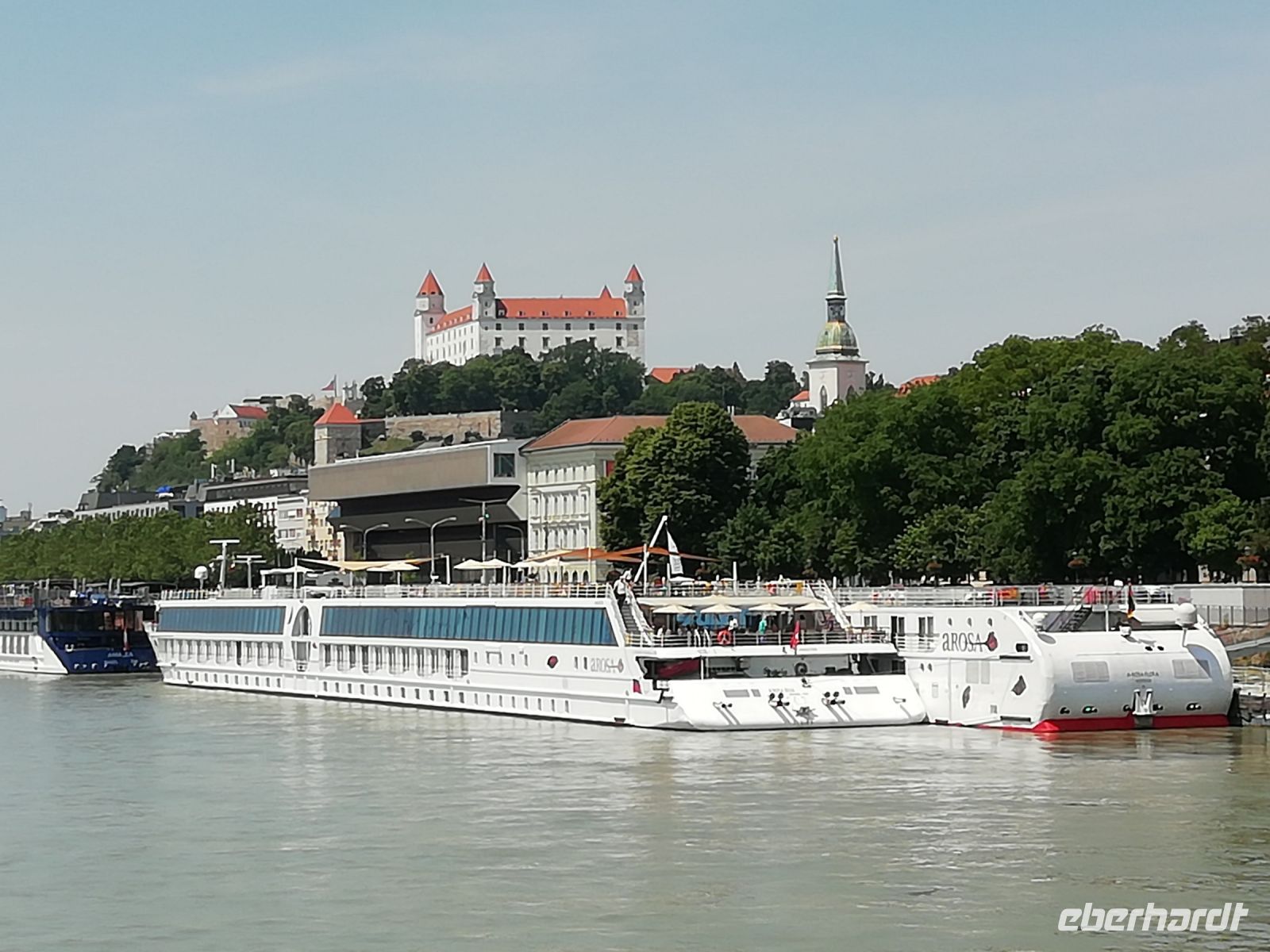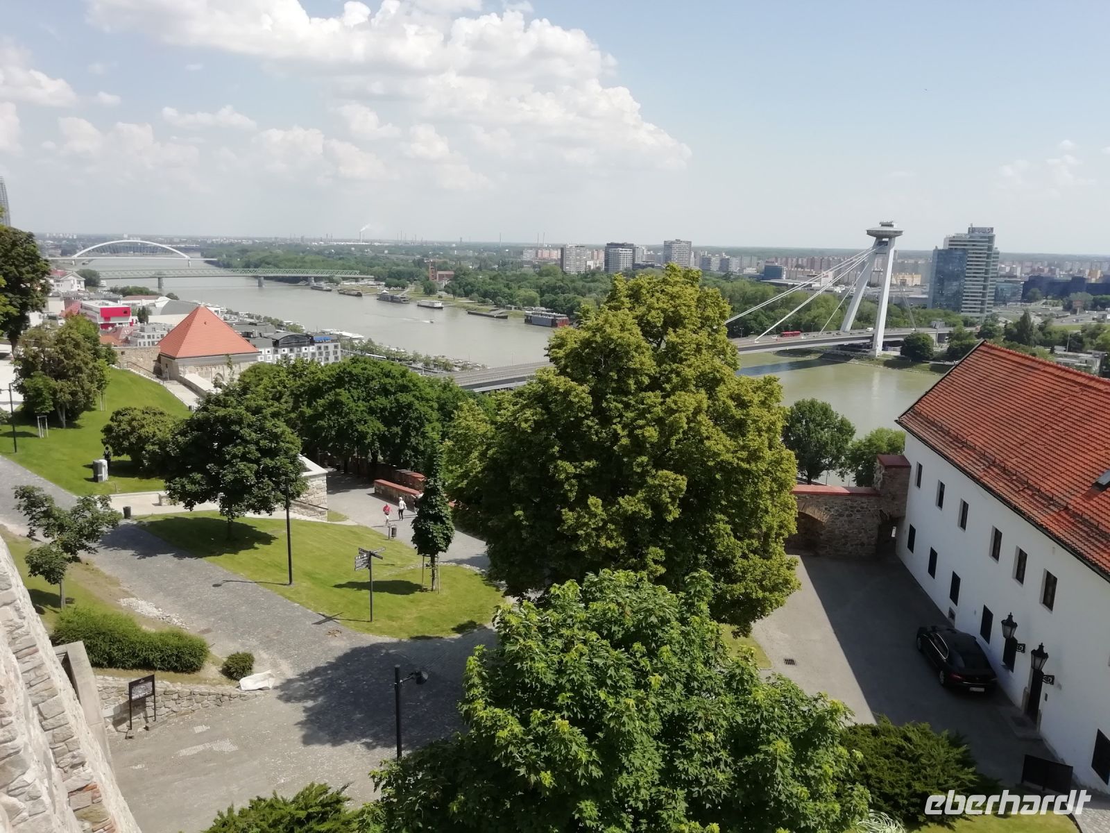 Nach dem Mittagsmenü erreichen wir sie slowakische Hautstadt Bratislava. Hier steht der Bus mit der örtlichen Stadtführerin für uns schon bereit. In der nähe der Schrägseilbrücke mit dem einem UFO ähnelnden Turmrestaurant beginnt unsere Stadtrundfahrt. Sie führt uns zuerst vorbei am Au-Garten hinauf zum Prestige-Viertel von Bratislava, wo Prominente aus Film und Fernsehen, politiker und Botschafter wohnen und wir einen tollen Blick über die Stadt haben. Unser nächstes Ziel ist die Pressburg, die im Volksmund auch "umgekehrter Tisch" genannt wird. Heute bedinet sich in der Burg das Nationalmuseum. Neben der Burg sehen wir das Parlament. Nach einer kleinen Führung bleibt Zeit zum Fotografieren, denn das Panorama ist phantastisch und der Blick reicht bis Österreich. Dann bringt der Bus uns wieder hinunter. zu Fuß erkunden wir nun die Altstadt. Von der Pestsäule geht es zum Dom St. Martin, wo Maria Theresie 1741 gekrönt wurde. Wir sehen u.a. das alte Rathaus, das Michaelertor, das Palais Grassalkovich, das Erzbischöfliche Sommerpalais und das Primitialpalais, kommen durch viele kleine Gassen und über schöne Plätze. Dem Kanalarbeiter Cumil, der uns lachend aus einem Gulli beobachtet, können wir nur von der gegenüberliegenden Seite zuwinken, denn auf der Straße findet gerade eine Kinderrallye statt. Außerdem sind zahlreiche Oldtimer in der Stadt. Am Nationaltheater endet der Rundgang. Bei den sommerlich-heißen Temperaturen suchen sich die meisten Gäste ein schattiges Plätzchen ein einem der vielen Straßencafes.
