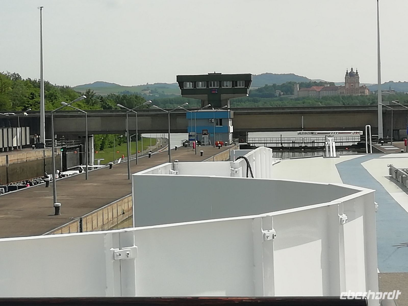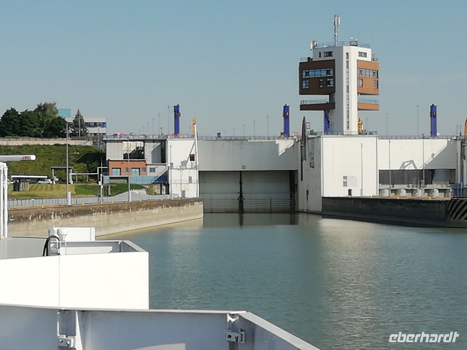 In der Nacht haben wir Bratislava passiert. Ab hier bildet die Donau auf ca. 150 Kilometern den Grenzfluss zwischen Ungarn und der Slowakei. Am Morgen erreichen wir die mit einer Länge von 275 Metern und einer Breite von 34 Metern größte Schleuse unserer Strecke, die Schleuse Gabcikovo, wo wir 20 Meter abgesenkt werden.