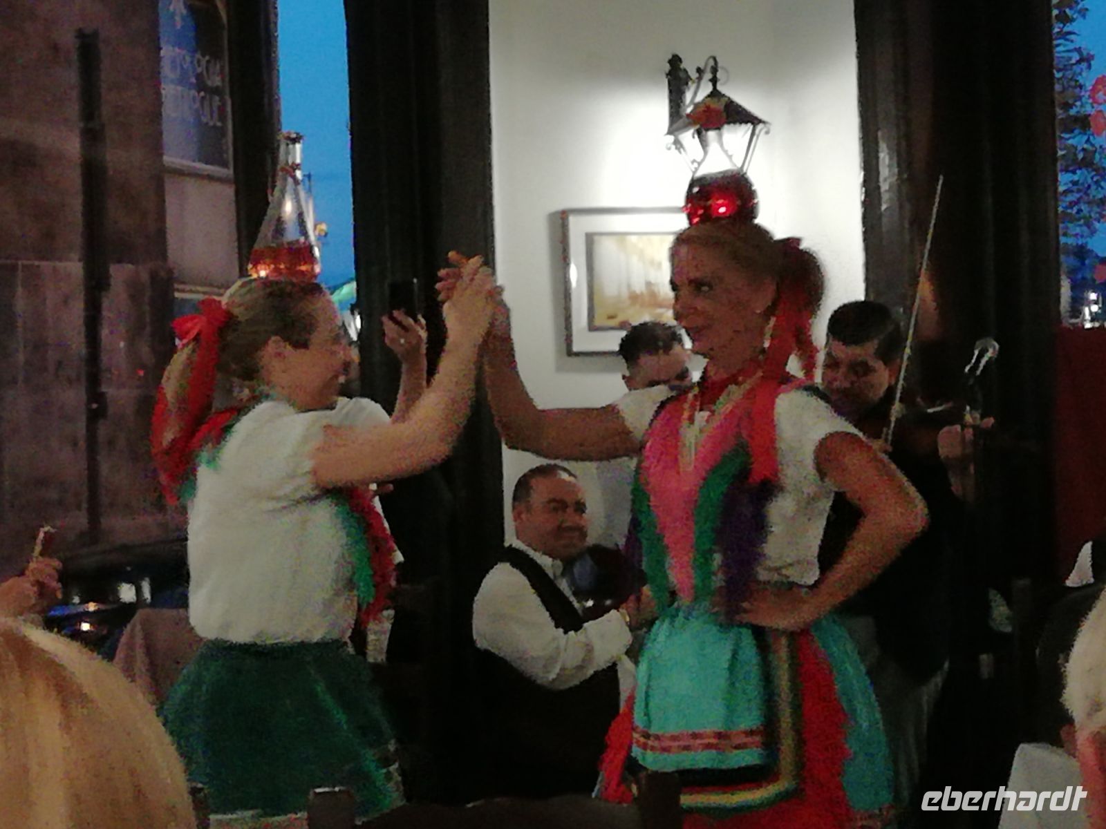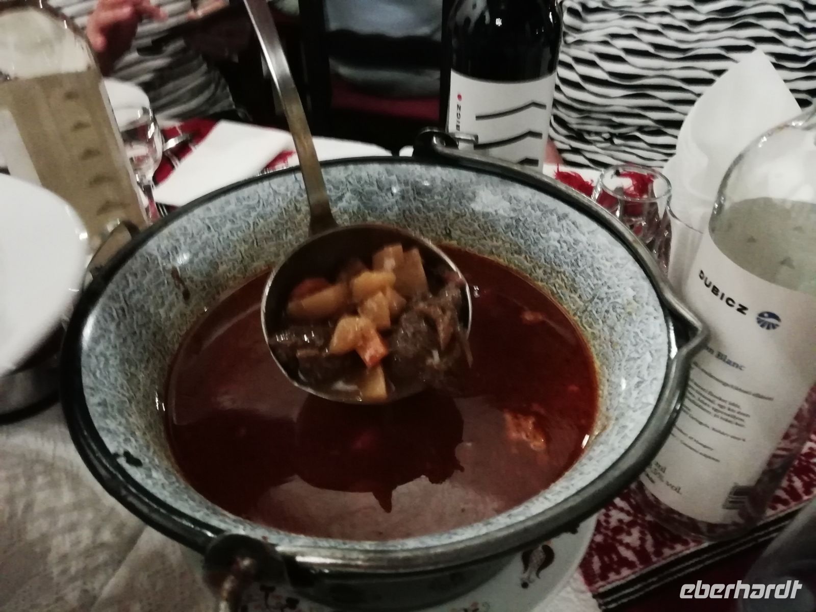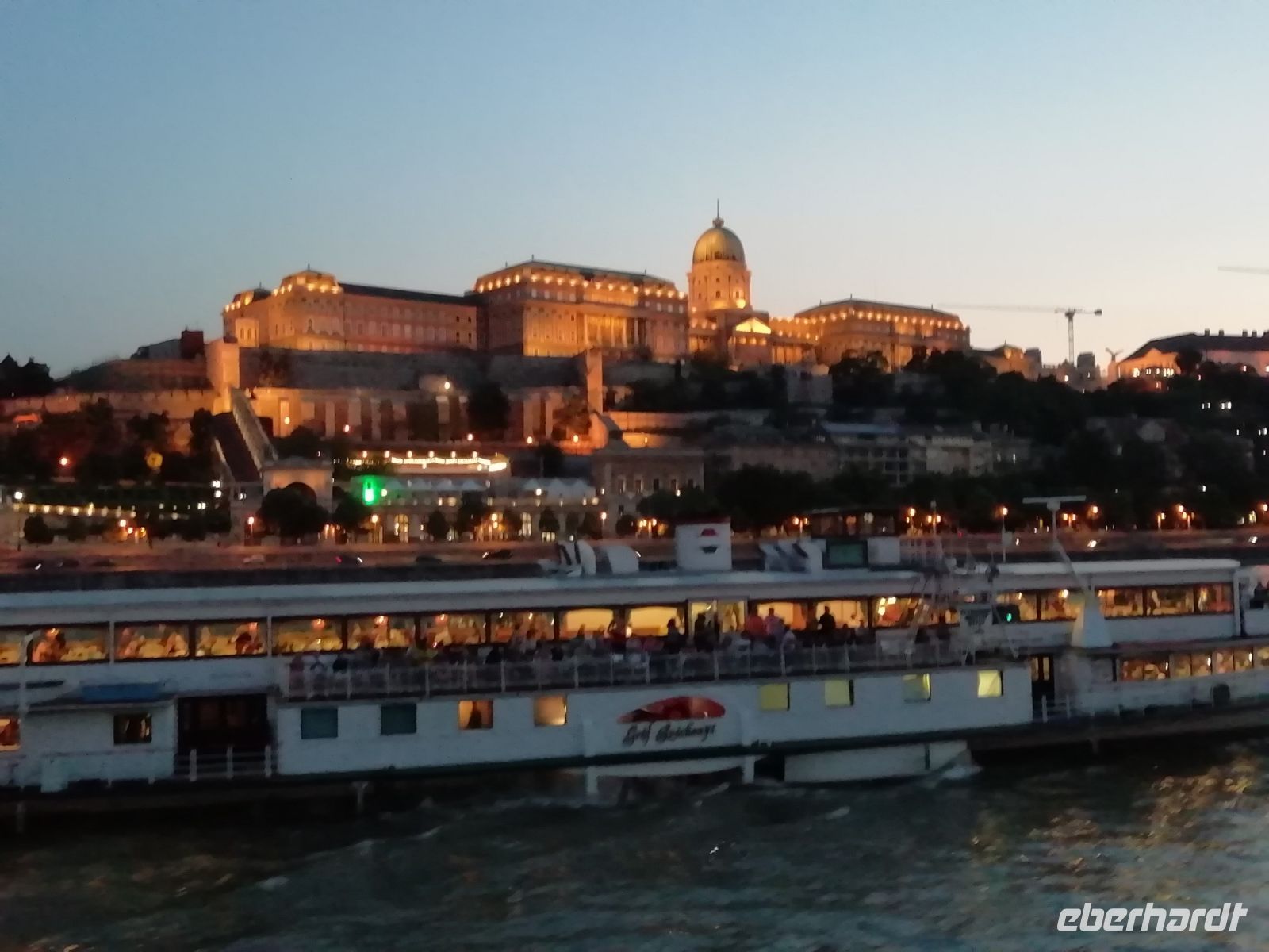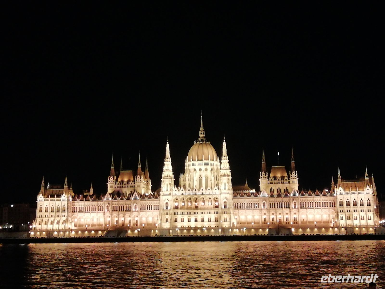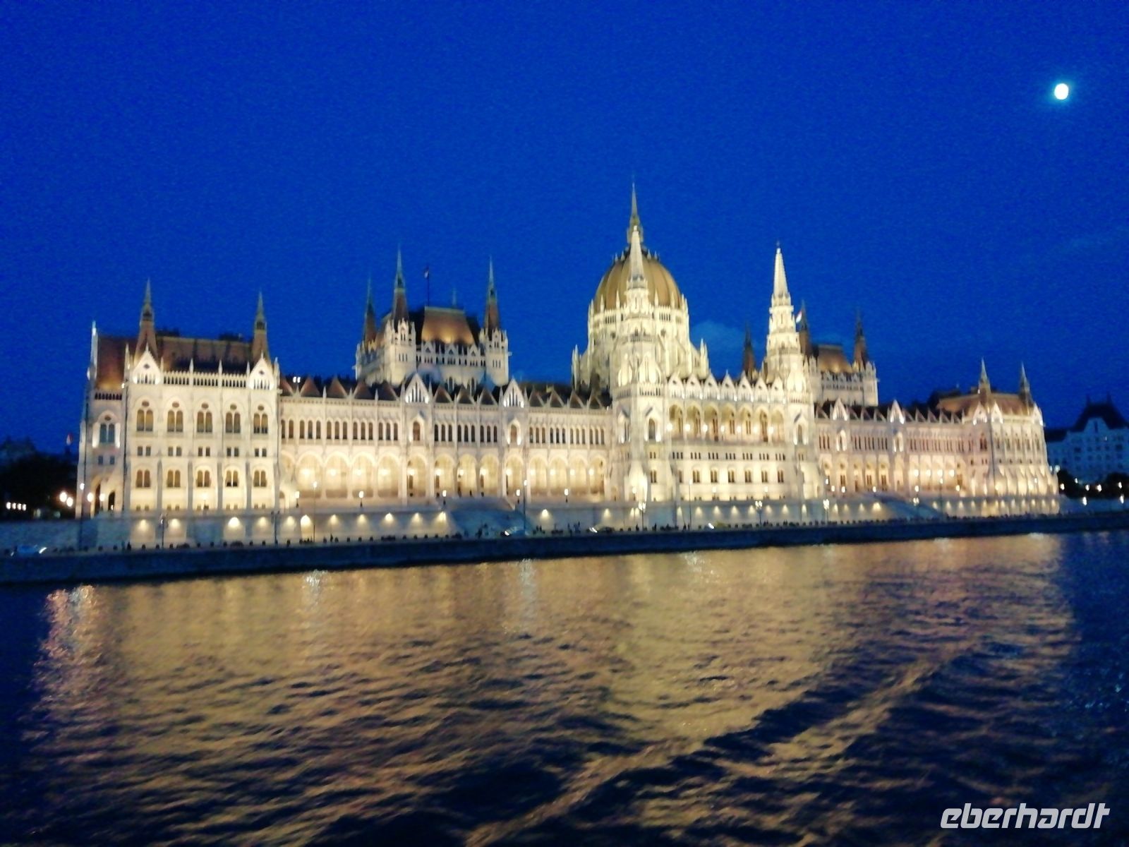 Zur Abendessenszeit legt das Schiff in der ungarischen Hauptstadt an und wir freuen uns schon auf den Ausflug "Budapest bei Nacht". Der Bus holt uns 20 Uhr ab und wir fahren auf die gegenüberliegende Donauseite. Gleich neben dem berühmten Hotel "Gellert" befindet sich das Restaurant "Szeged". Hier werden wir mit Palinka und Musik begrüßt. In geselliger Runde erleben wir temperamentvolle Hierten- und Zigeunertänze, lauschen der ungarischen Musik und dem Gesang. Zu Gulaschsuppe und Apfelstrudel lassen wir uns den Wein schmecken. Wenns am Schönsten ist, soll man ja bekanntlich aufhören. Nach dem "Radetzkymarsch" verlassen wir deshalb das "Szeged" und starten zu unserer Lichterfahrt durch Budapest. Alle großen Gebäude und die Brücken sind inzwischen beleuchtet und es gibt viel zu fotografieren. Besonders imposant präsentiert sich das ungarische Parlament, deshalb machen wir gegenüber noch einen Fotostopp. Mit tollen Eindrücken kehren wir in der Mitternachtsstunde zum Schiff zurück.