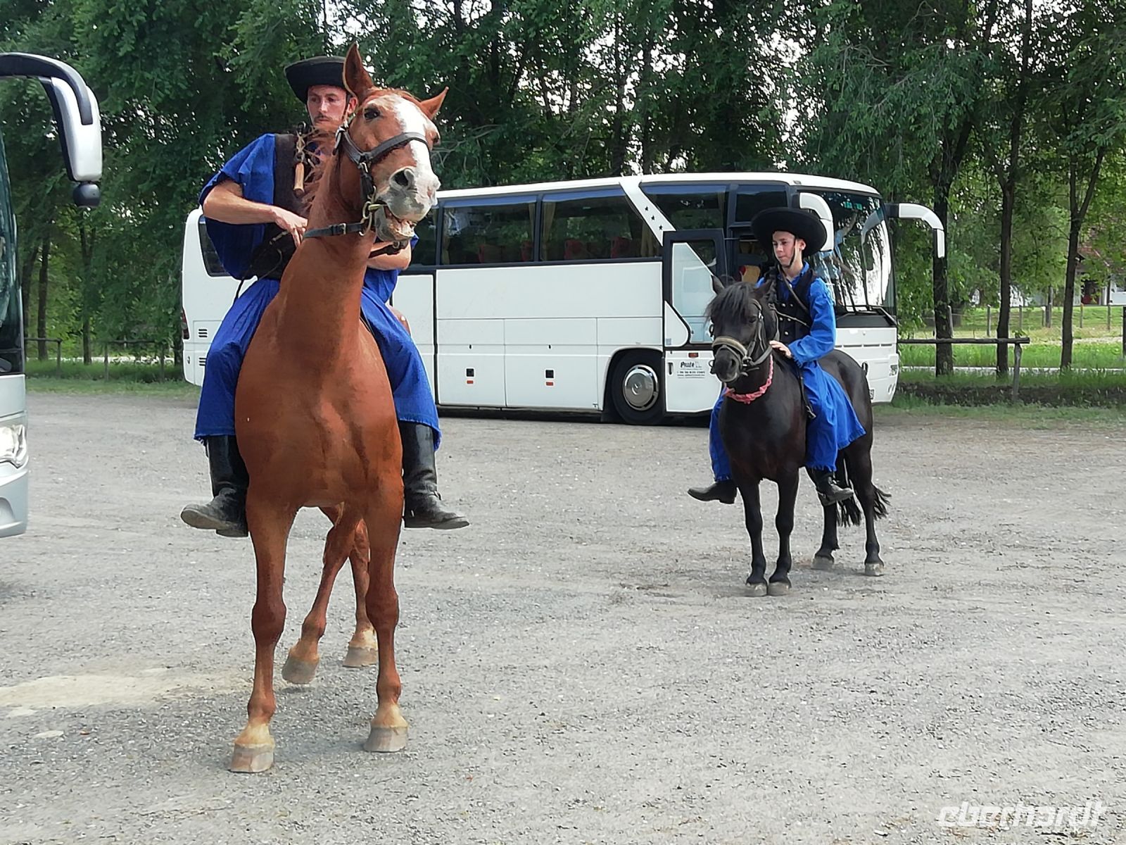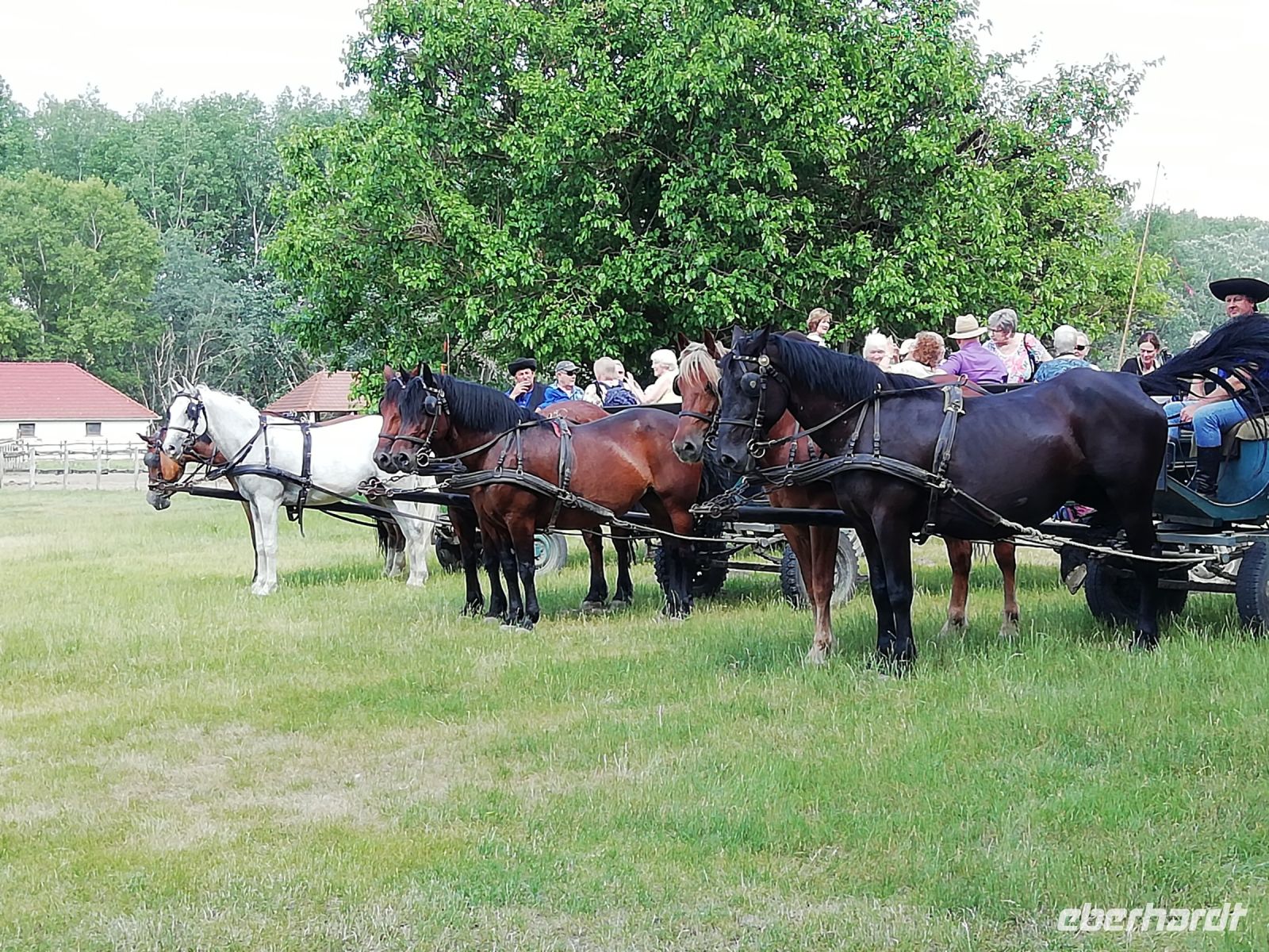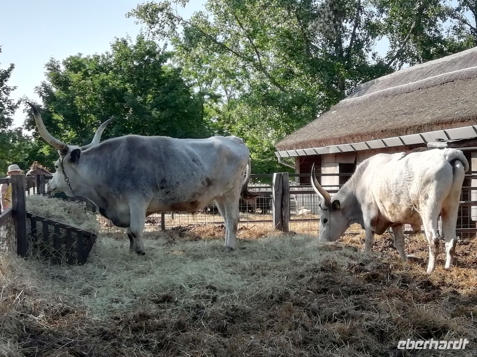 Am Nachmittag besteht die Möglichkeit, an einem Ausflug in die Puszta teilzunehmen. Von Budapest aus fahren wir mit dem Bus etwa eine Stunde Richtung Süden in die ungarische Tiefebene. Unser Ziel ist der Reiterhof Ludwigsdorf. 120 Pferd, darunter auch mehrere Lipizzaner, gehören zu diesem Gestüt. Bei Ankunft auf der Cszarda werden wir mit Schnaps und Salzgebäck empfangen. Danach unternehmen wir eine kleine Kutschfahrt und versammeln uns anschließend auf der Tribüne. Von hier aus verfolgen wir die rasanten Reitvorführungen der ungarischen Pferdehirten, der Csikos. Und wir sehen, dass Esel keineswegs dumm sind. Beim Peitschenknallen können die Gäste dann selbst ihr Geschick beweisen. Nach dem Besuch der Stallungen und dem Gehege mit den riesigen Graurindern und Wasserbüffeln sind wir eingeladen zu ungarischen Spezialitäten und Wein. Dann können noch ungarischen Souvenirs, Salami, Paprikaprodukte und Schnaps gekauft werden, bevor es wieder zum Schiff zurückgeht.