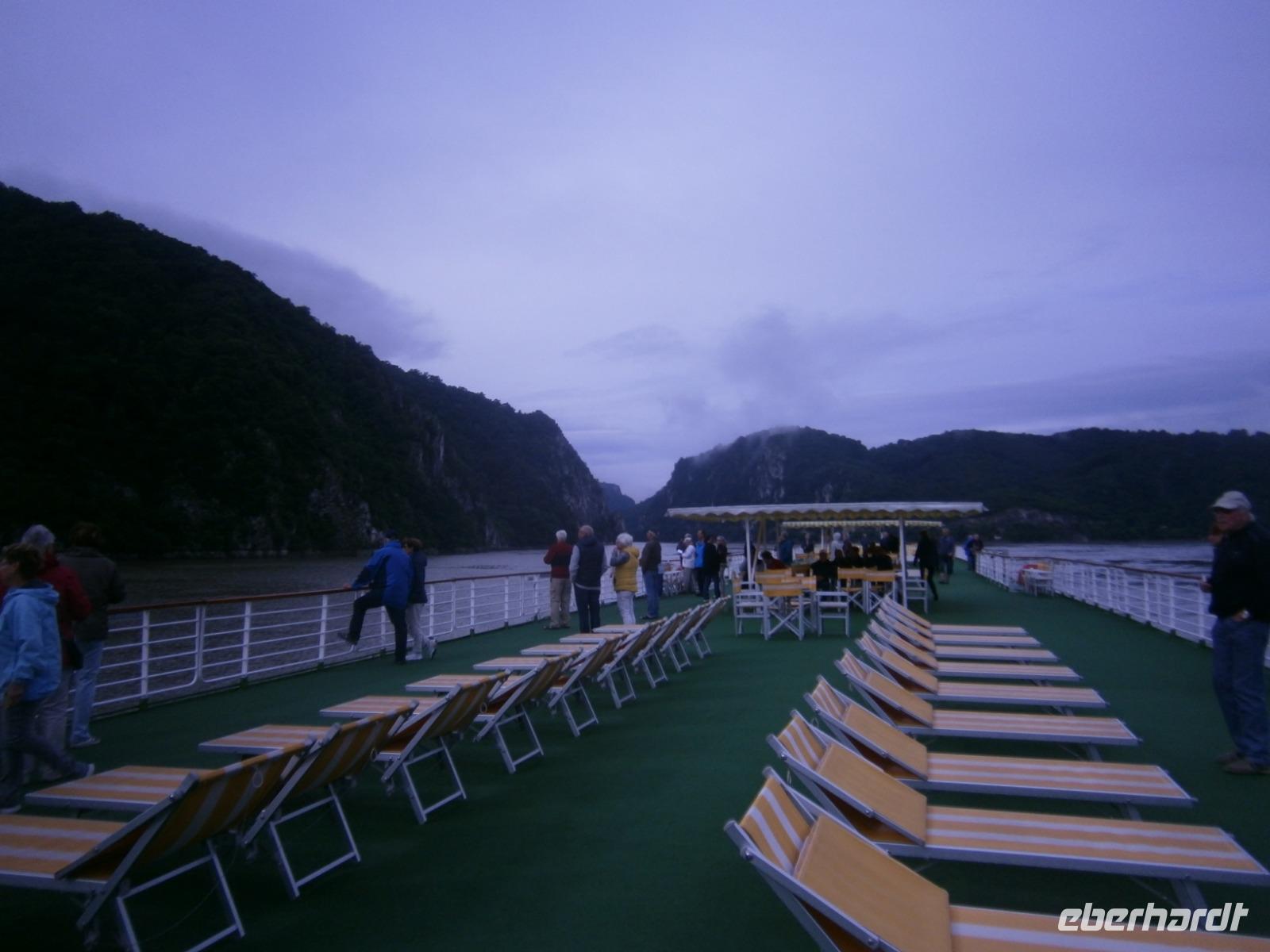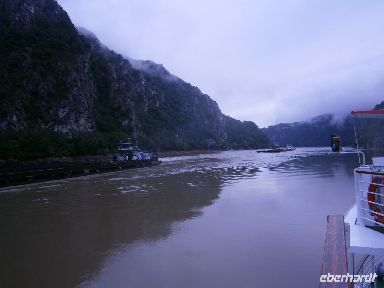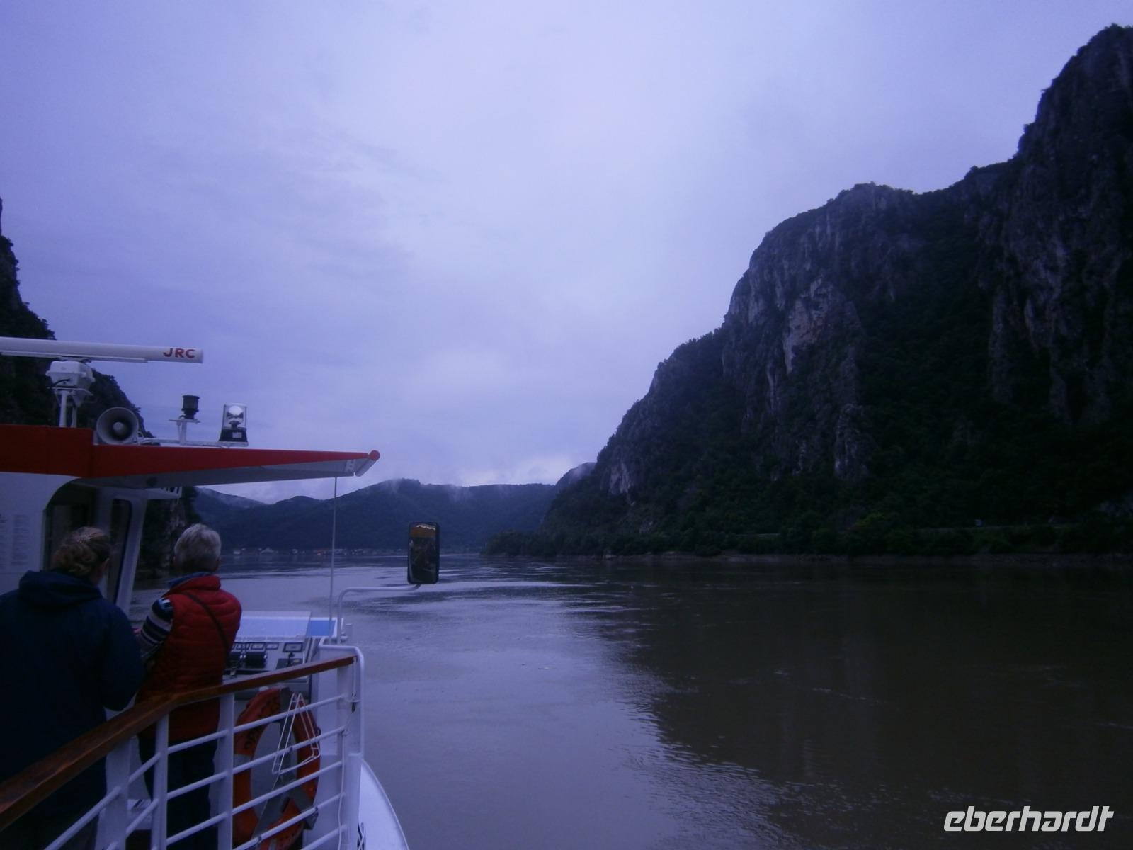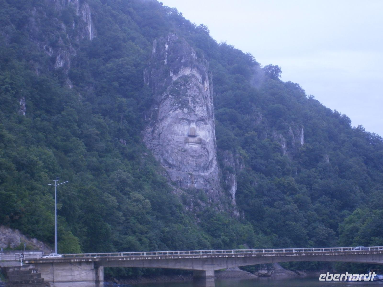 In den Morgenstunden passierten wir einen der wohl eindruckvollsten Abschnitte der Donau entlang der Karpaten und der Ausläufer des Balkangebirges: die Kataraktenstrecke. Auf der Fahrt durch das „Eiserne Tor" ragen steile Gebirge auf. Das in den Felsen gehauene Bildnis des Babakei bringt den Einheimischen alte Sagen ins Gedächtnis zurück. Die" Tabula Trajana" erinnert daran, dass schon die Römer hier eine Straße errichtet hatten. Der ehemals reißende und hier sehr gefährliche Strom wurde durch den Bau zweier Kraftwerke -Djerdap 1 und 2,die sowohl Serbien als auch Rumänien Energie liefern, gestaut. Später genossen wir dann die romantische Flusslandschaft zwischen Bulgarien und Rumänien.