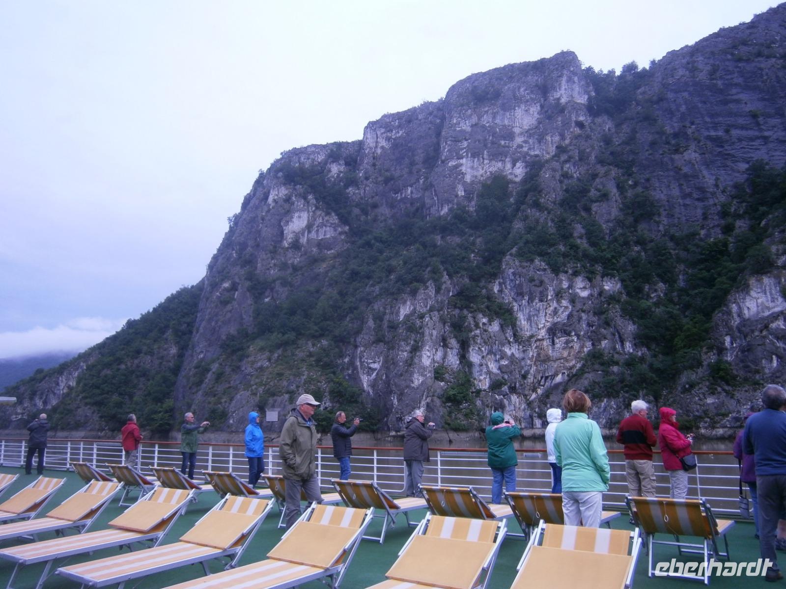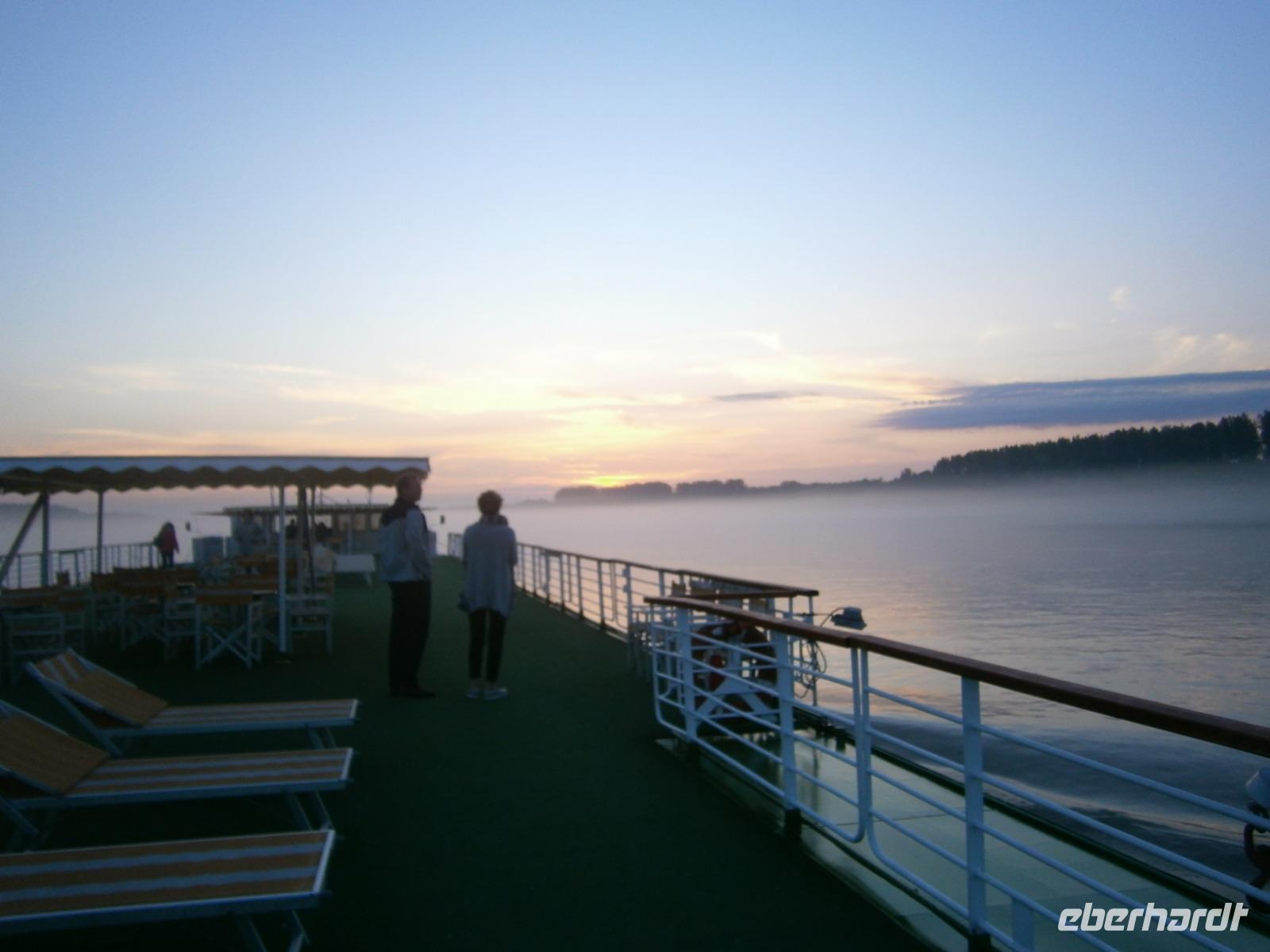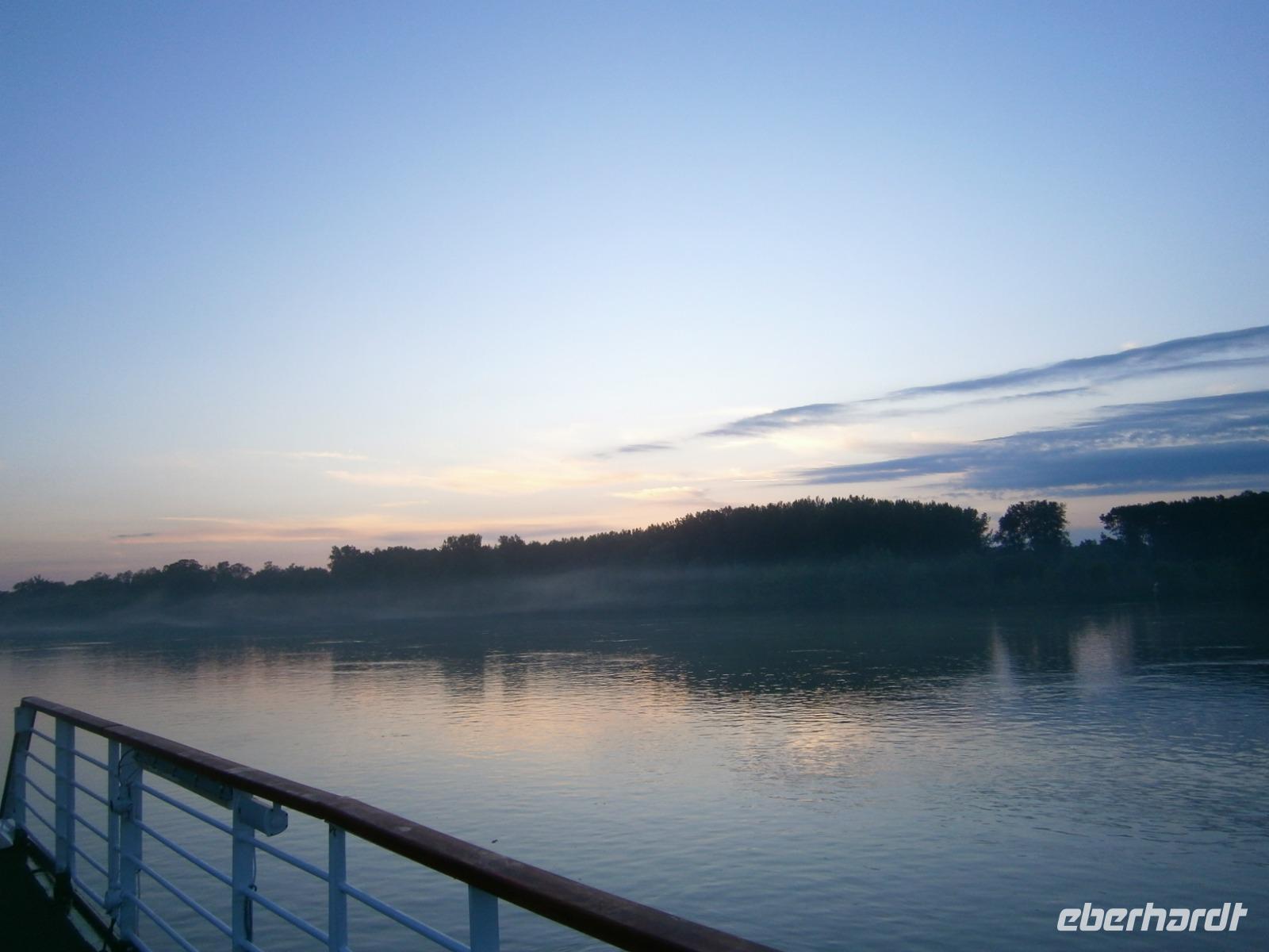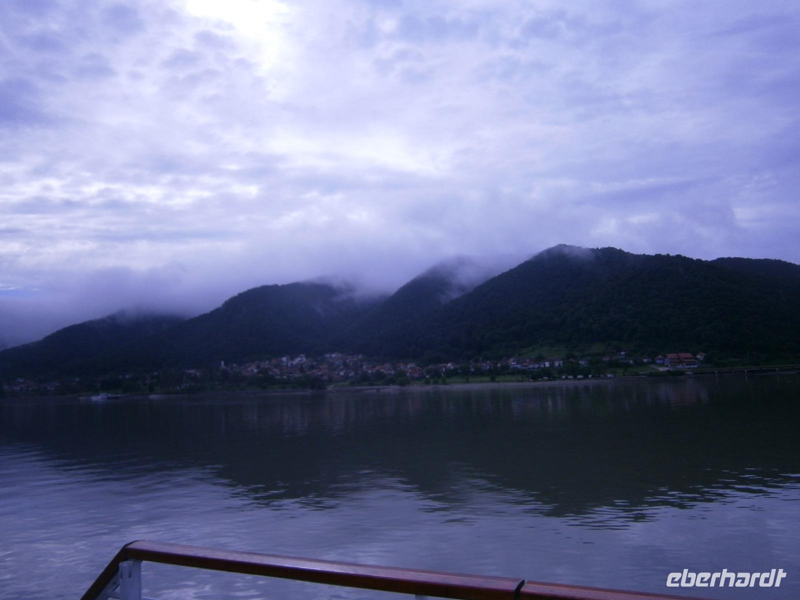 In den Morgenstunden passierten wir einen der wohl eindruckvollsten Abschnitte der Donau entlang der Karpaten und der Ausläufer des Balkangebirges: die Kataraktenstrecke. Auf der Fahrt durch das „Eiserne Tor" ragen steile Gebirge auf. Das in den Felsen gehauene Bildnis des Babakei bringt den Einheimischen alte Sagen ins Gedächtnis zurück. Die" Tabula Trajana" erinnert daran, dass schon die Römer hier eine Straße errichtet hatten. Der ehemals reißende und hier sehr gefährliche Strom wurde durch den Bau zweier Kraftwerke -Djerdap 1 und 2,die sowohl Serbien als auch Rumänien Energie liefern, gestaut. Später genossen wir dann die romantische Flusslandschaft zwischen Bulgarien und Rumänien.