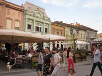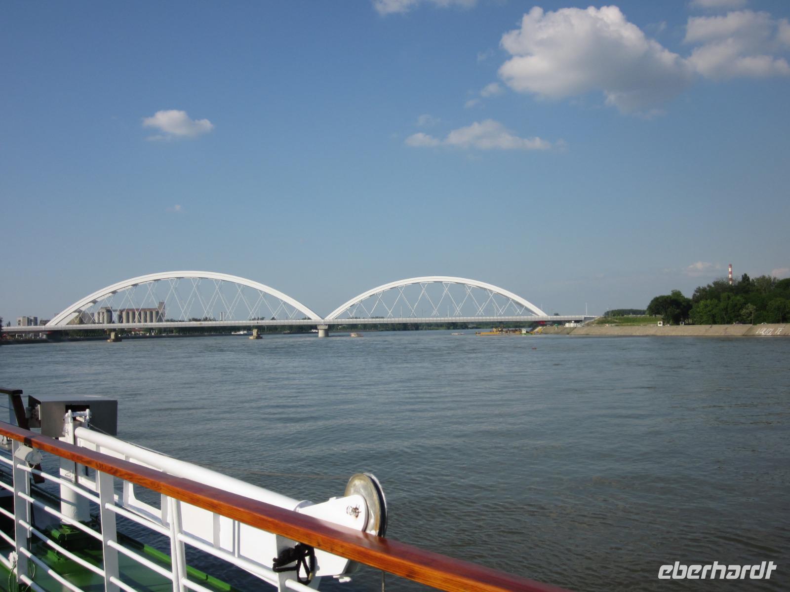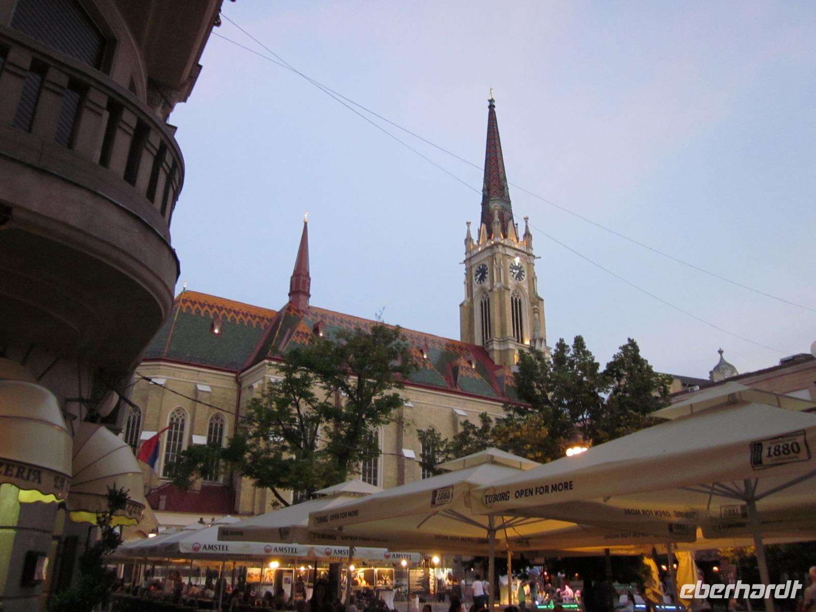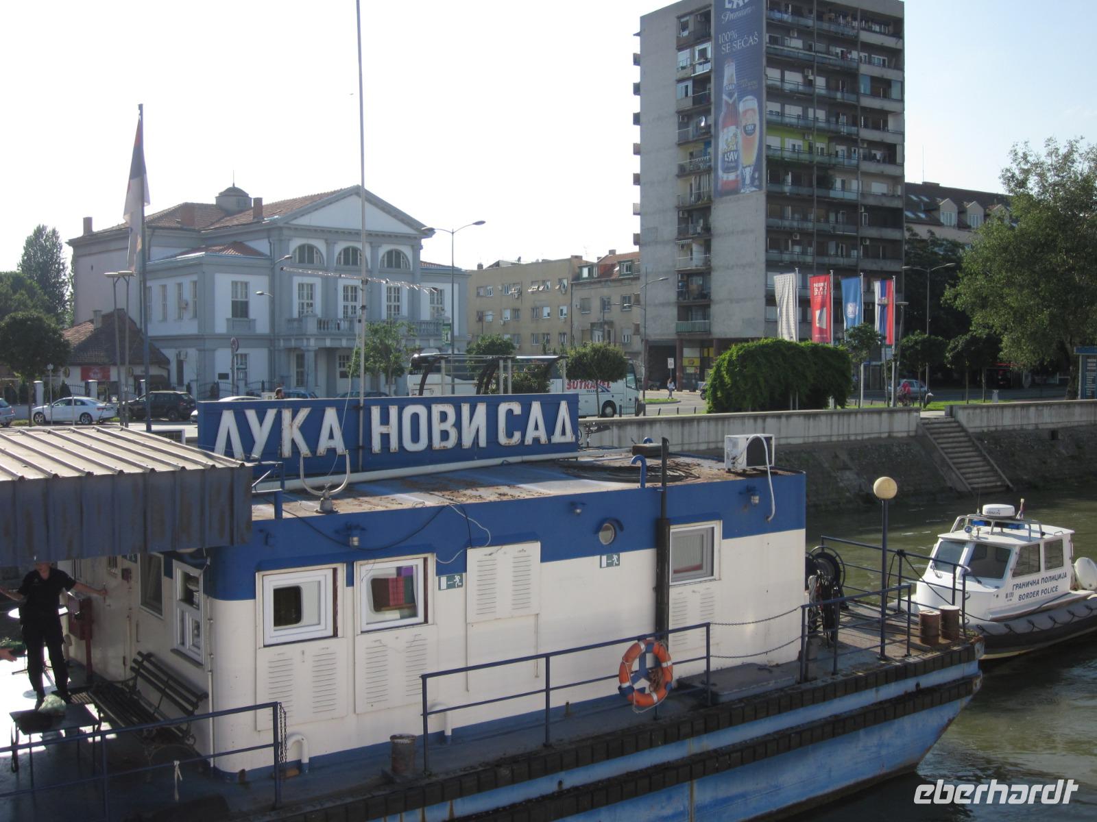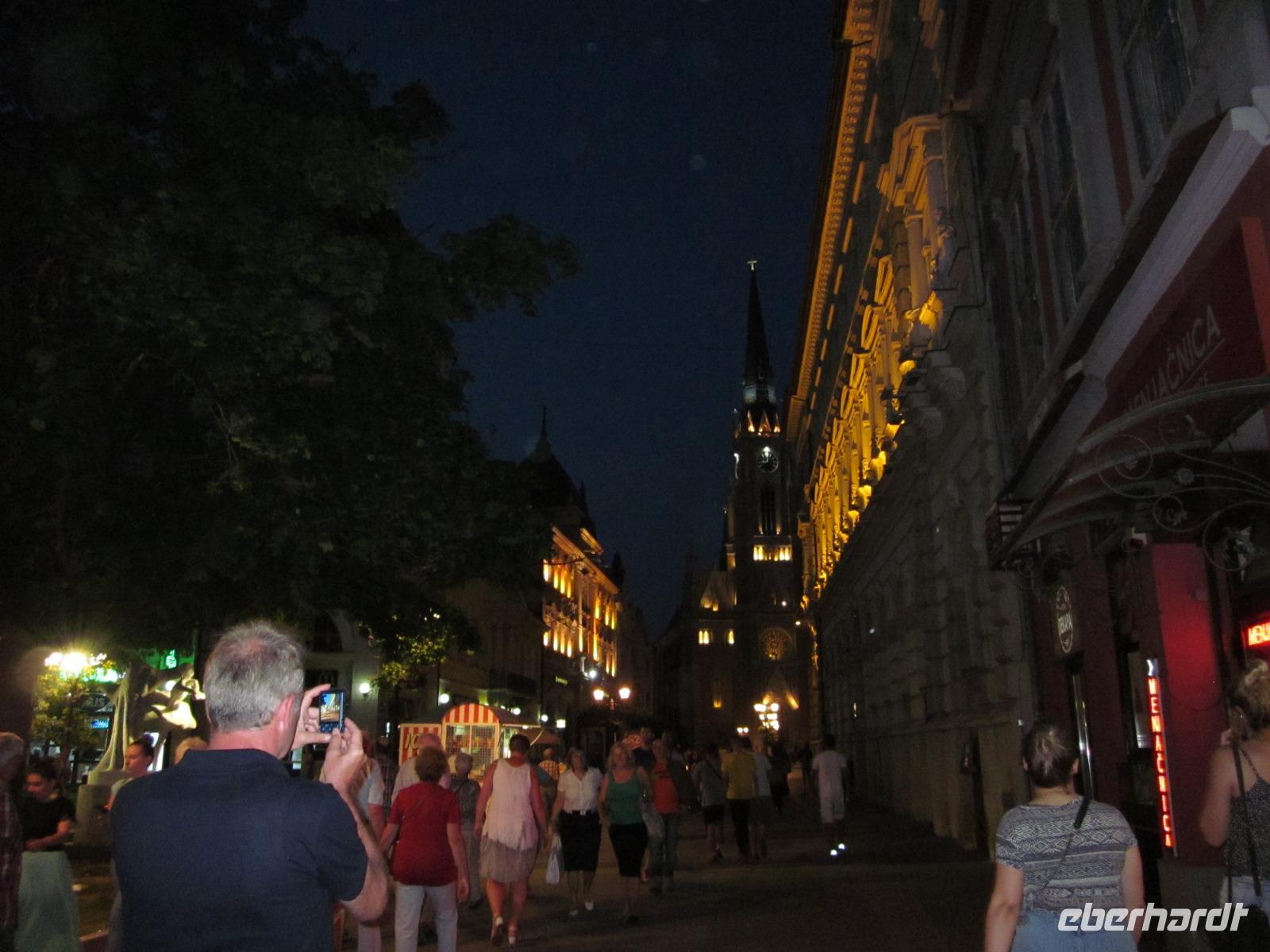 Unser Schiff fuhr am Vormittag den Fluss stromaufwärts durch Serbien. Während wir uns einmal wieder an Deck sonnten,Cocktails genossen und die Fahrt vorbei an der harmonisch und ruhig wirkenden Landschaft und den Ortschaften der Wojwodina , vorbei an der ehemaligen serbischen Hauptstadt Smederevo und den Mündungen der Flüsse Tamis und Save fotografierten, verging ein geruhsamer Vormittag. Wegen des noch immer beträchtlichen Hochwassers der Donau erreichten wir erst am Abend die rumänische Stadt Novi Sad. Dies erwies sich als großer Vorteil, denn es war nicht mehr so heiß. Wir erlebten eine sehr lebendige Stadt, geprägt von der Ansiedlung mehrerer Nationalitäten, die ihre Kultur und ebenfalls vielfältige Architektur mitbrachten.Abendliche Beleuchtung rückte die neogotische Marienkirche, das Rathaus,die Synagoge, die am jenseitigen Flussufer auf einem Berg liegende Festung Petrovaradin und natürlich auch die Flaniermeile, die Dunavska, ins rechte Licht für uns als Spaziergänger. Leider waren die Kirchen schon geschlossen und die stechfreudigen Mücken schienen Touristen zu bevorzugen. Für diese „Tortur" wurden wir an Bord, wie jeden Abend, durch Nadas Gesang und Musik erfreut und „entschädigt" durch die Zeitumstellung.
