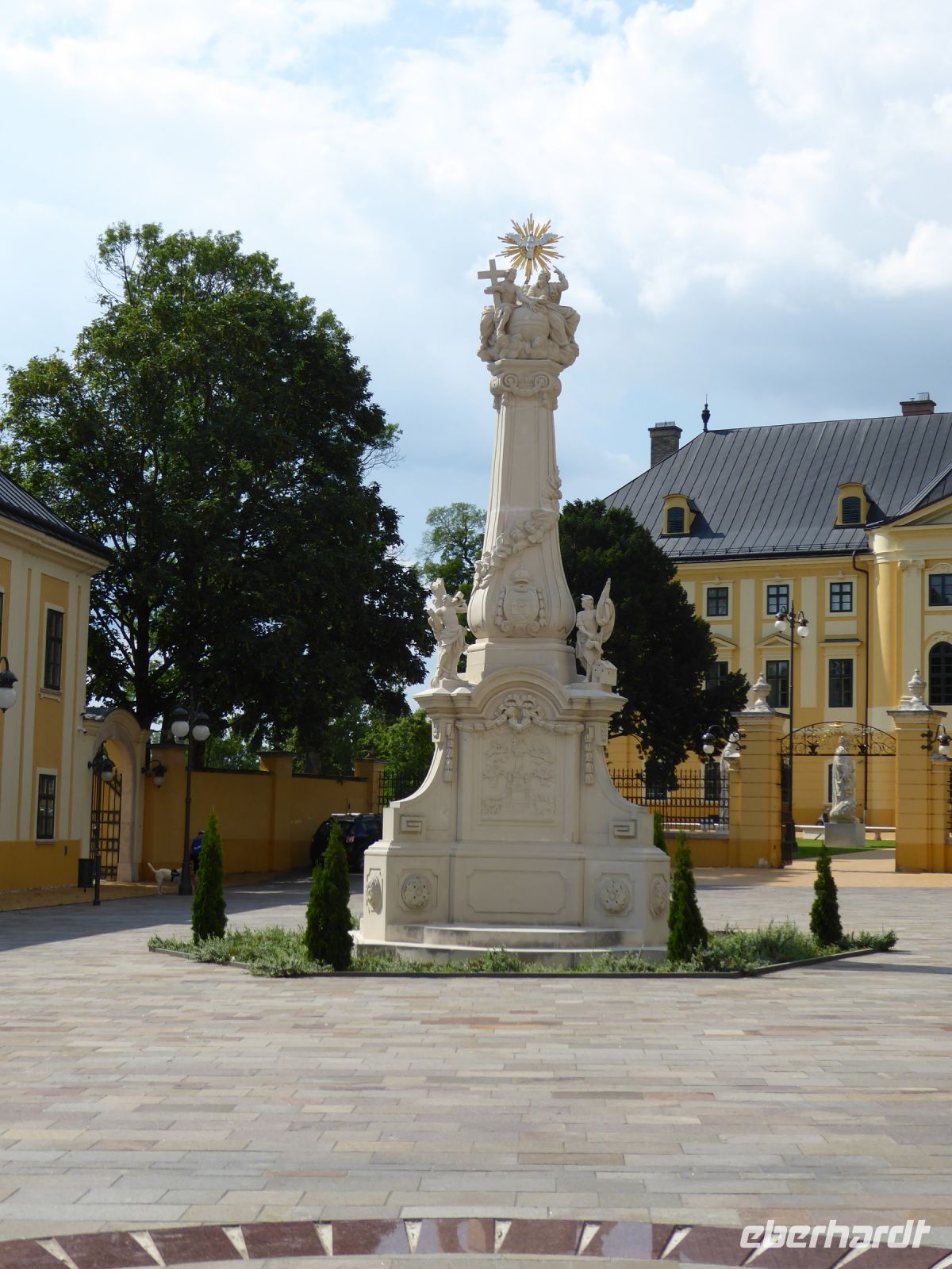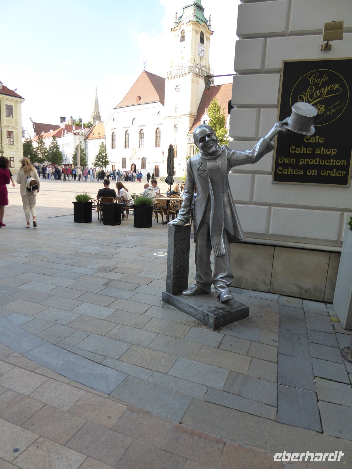 Zwei Busse und zwei Guides warteten auf die Passagiere der Princesse. Wir EHT Gäste hatten einen Bus, die anderen Gäste den zweiten. Unser Guide; Peter, begann auf der Fahrt hoch zur Burg die Geschichte der Stadt auf unterhaltsame und witzige Art zu erklären. Auf der Burg gab es nach der Führung noch genug Zeit für WC und Fotos, und dann ging es mit dem Bus wieder hinunter in die Altstadt. Zu Fuß ging es an der Pestsäule und er deutschen Botschaft vorbei zum Alten Rathaus, Jesuiten- und Franziskaner-Kirche, aber auch zum Cafe Mayer mit dem „Schönen Naci“ an der Ecke und weiter zum berühmten „Cumil“ mit dem total fehl am Platze stehenden Hinweisschild in Englisch „Man at work“.