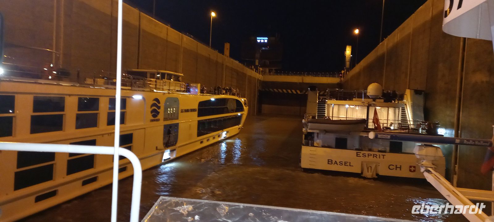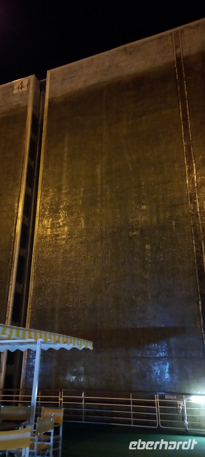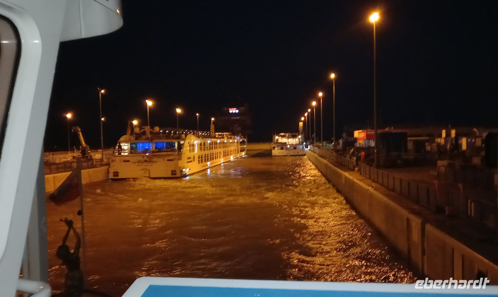 Gesichtskontrolle durch den Zoll/die Grenzpolizei gegen Mitternacht! Alle Passagiere und Besatzungsmitglieder mussten mitten in der Nacht aufstehen und zur Rezeption kommen. Dort wurde anhand des Ausweises das Gesicht kontrolliert, dann konnte frau/man weiterschlafen. - Wir waren an der "Schengener Grenze"!