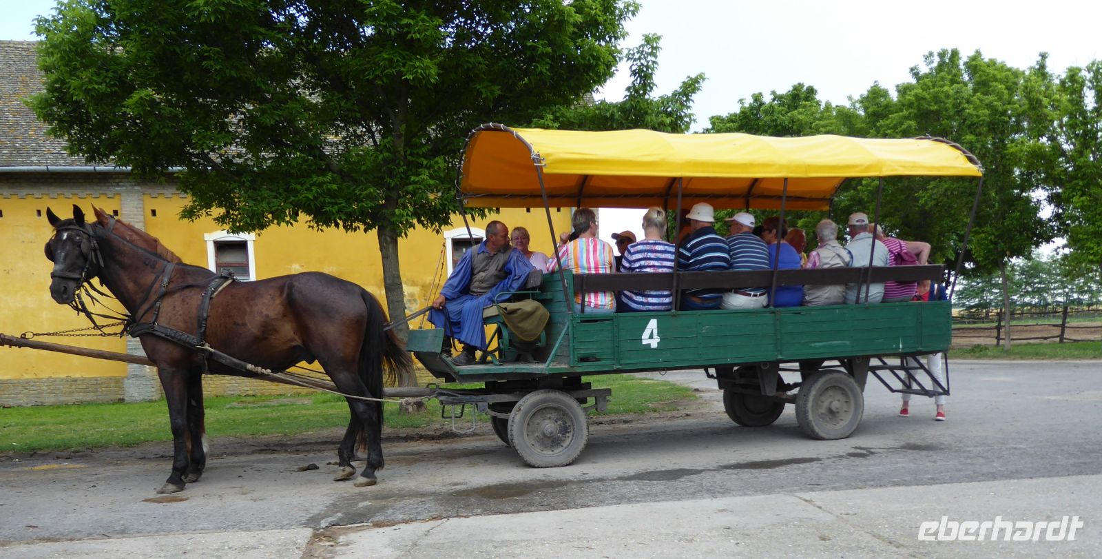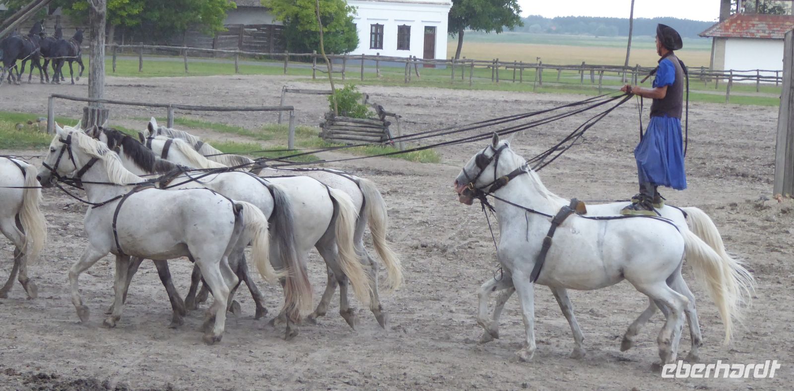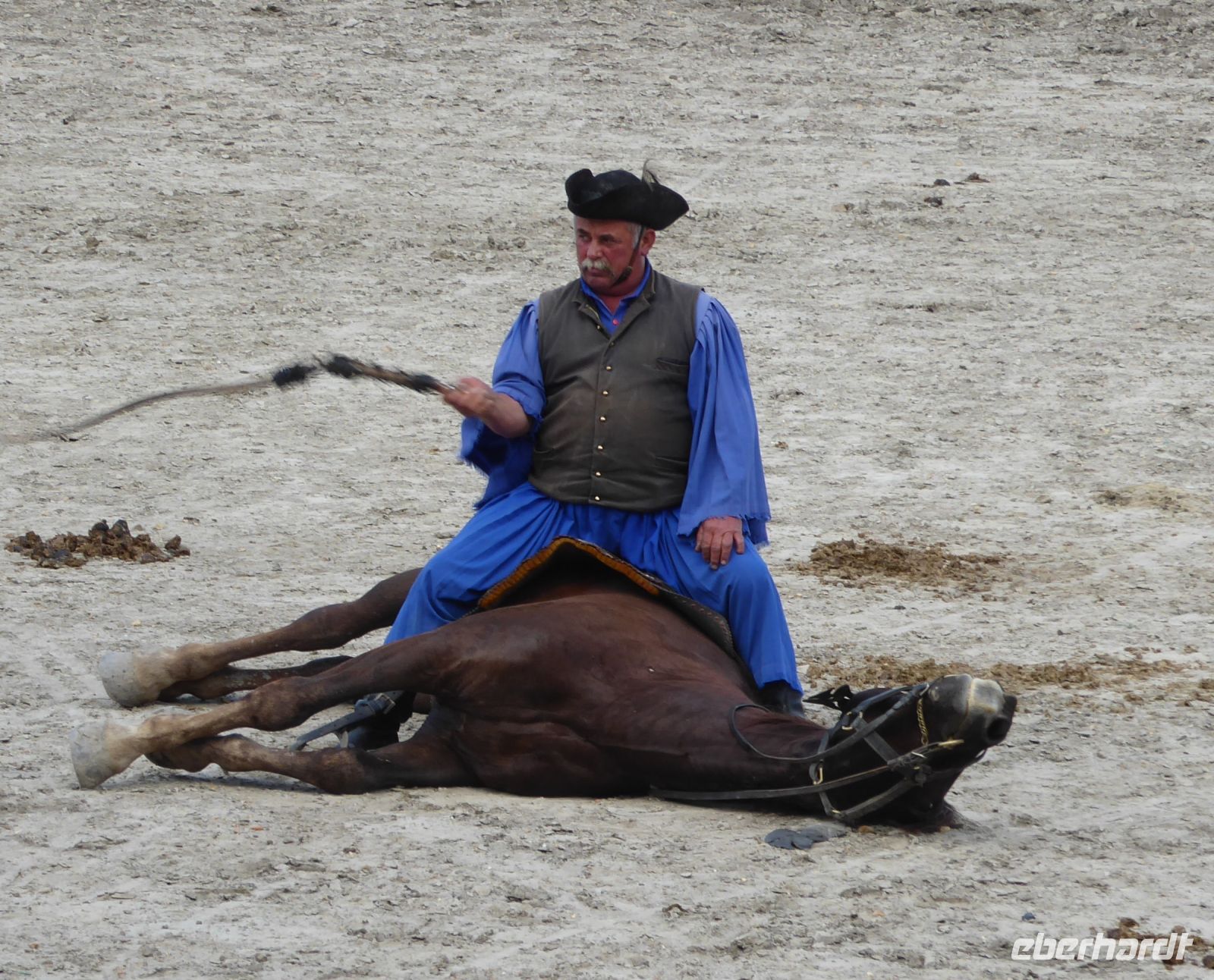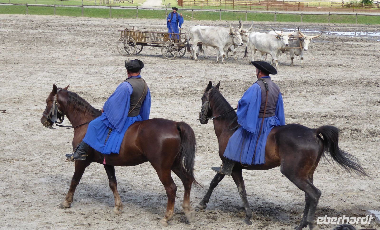 Weiter ging es in die Puszta zur Pferdeshow. In traditionellen Trachten werden Pferdedressuren von „Hirten“ vorgeführt. Zudem gab es eine Verkostung von Wein und und Häppchen, sowie Schnaps, der auch dort gekauft werden konnte/sollte. Für die Gäste, die so etwas noch nicht gesehen haben, ein interessantes Spektakel. Den