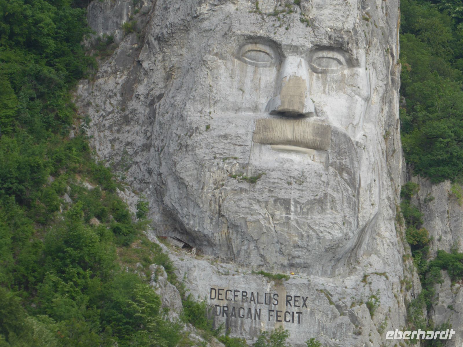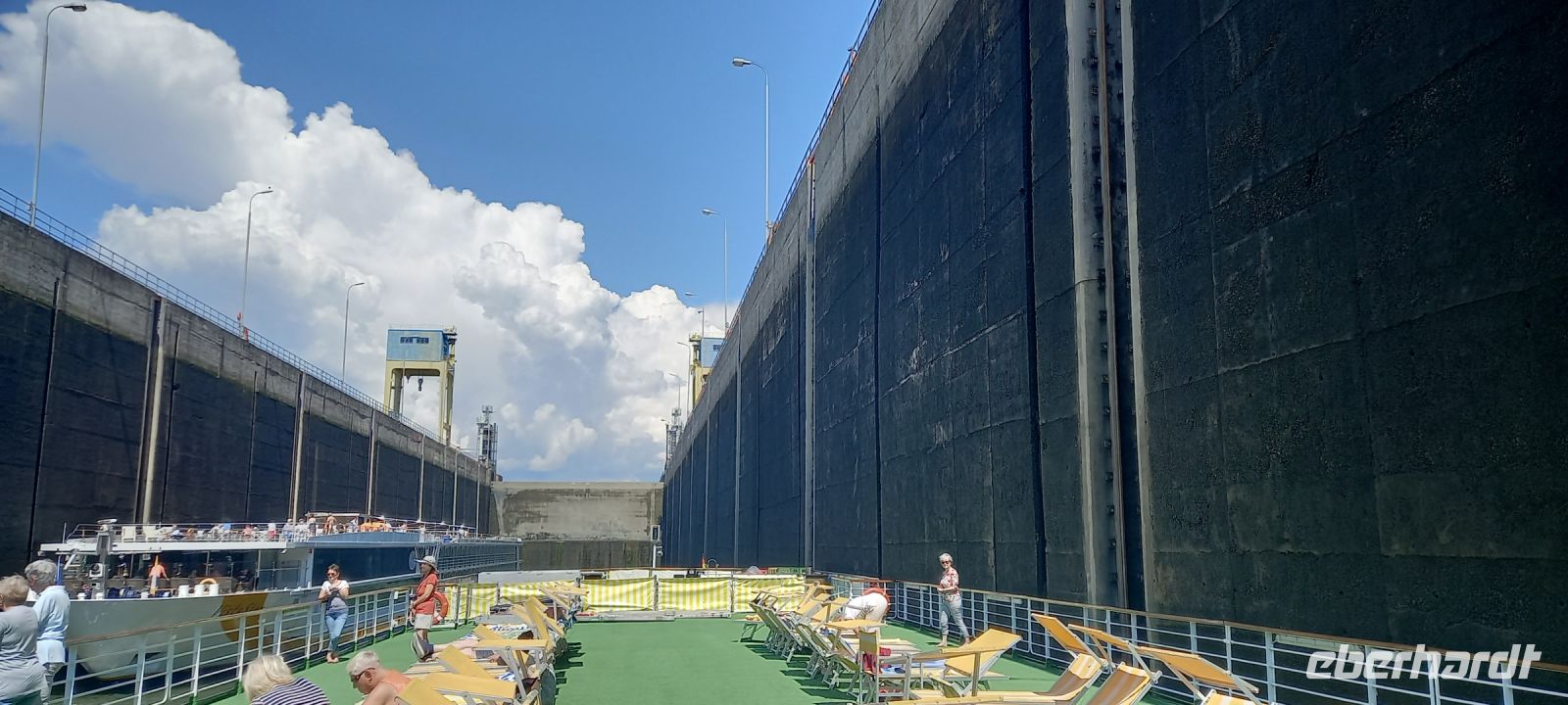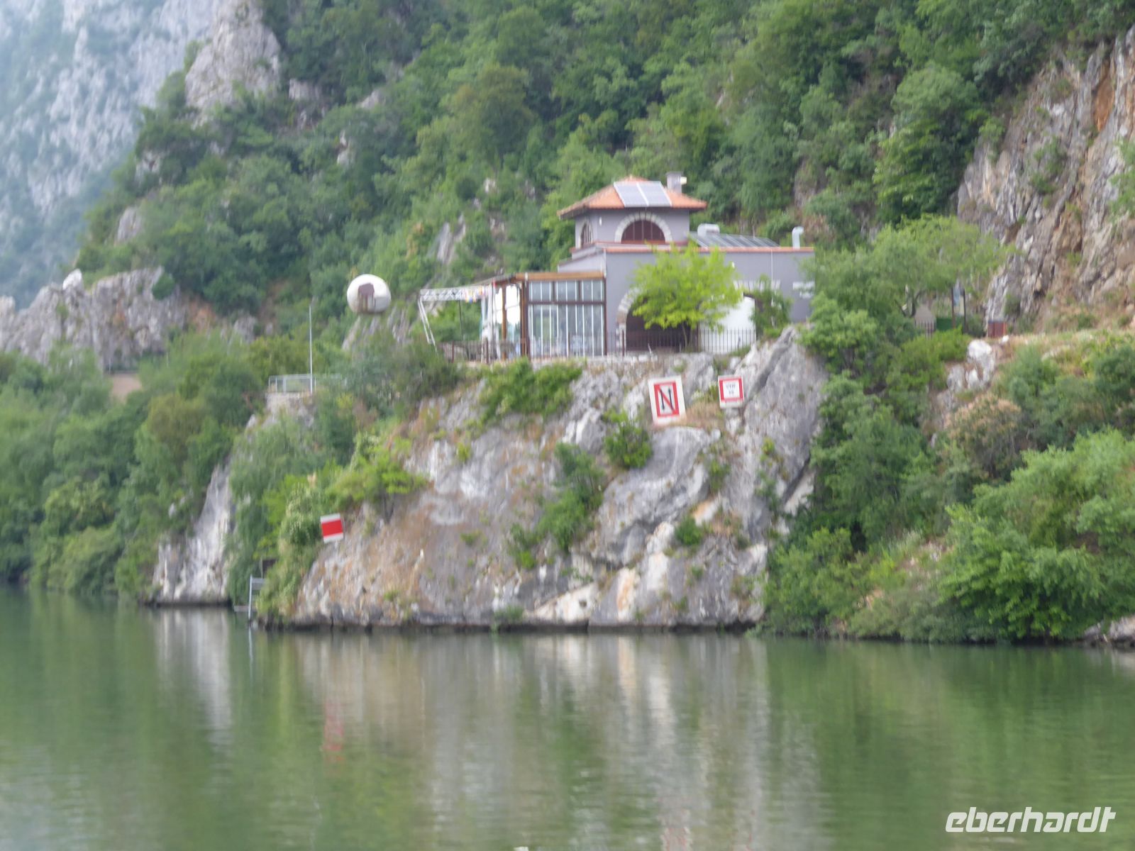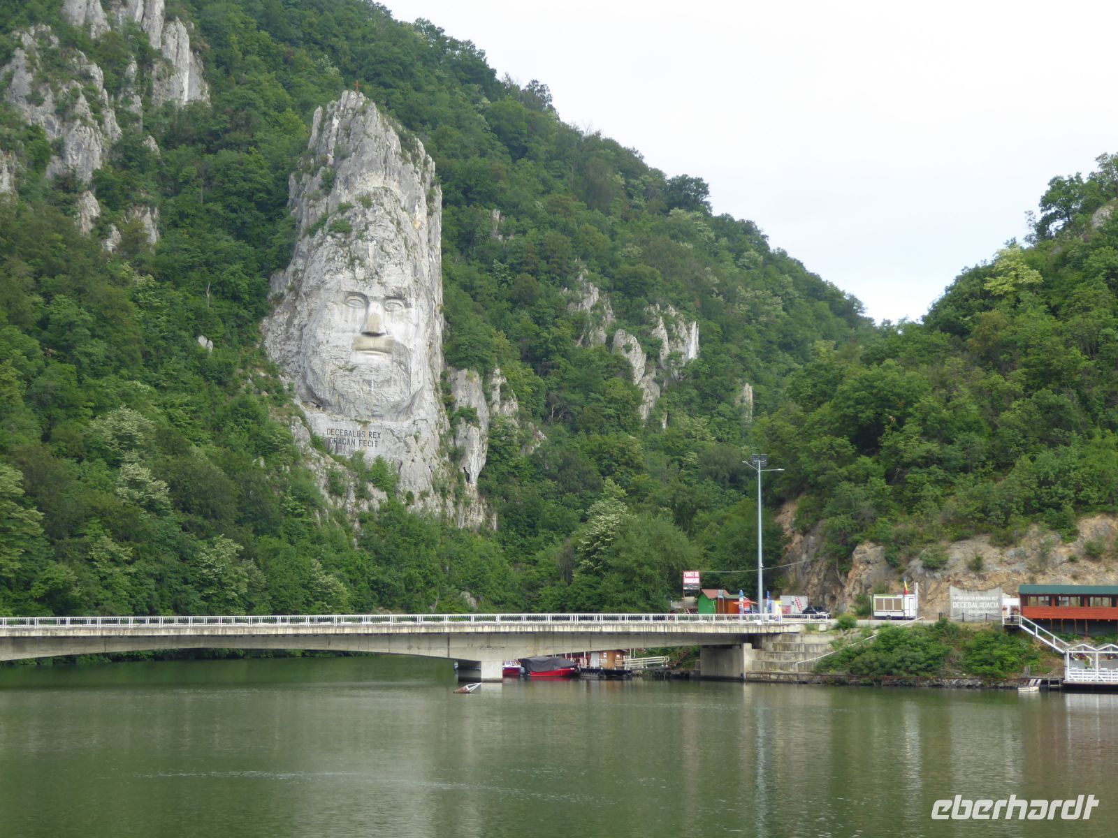 ca. 12.30 h zum Mittagessen. - Auf gut 100 km, zwischen Golubac und dem Kraftwerk Derdap I zwängt sich die Donau zwischen Ausläufern des Serbischen ERzgebirges und dem Banater Gebirge durch. Bis 1970 war dieser Abschnitt durch Strömung, Untiefen und Felsen im Flußbett schwer passierbar und nur mit Lotsen zu befahren. Bis 1972 das jugoslawisch-rumänische Gemeinschaftswerk des Stauwerkes Derdap I eingeweiht wurde, und der Donaupegel sich um 34 m erhöhte. Der Stausee wurde 220 km lang flußaufwärts. Die markanten Stellen erklärte uns Anna sehr anschaulich. ( Trajanstafel, Relief des grimmigen Decebal, Veterani-Höhle etc.) Dann kam die Durchfahrt durch die Schleusenanlagen Derdap I und Derdap II, ebenfalls ein imposantes Erlebnis, hat die Schleuse Derdap I doch eine Fallhöhe von erst 20 m und dann nochmal 14 m!