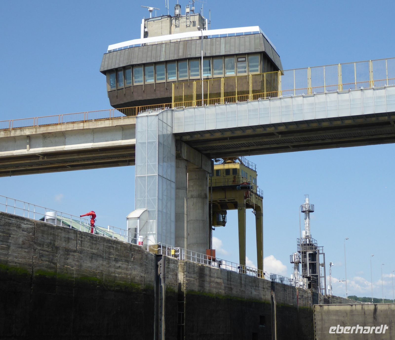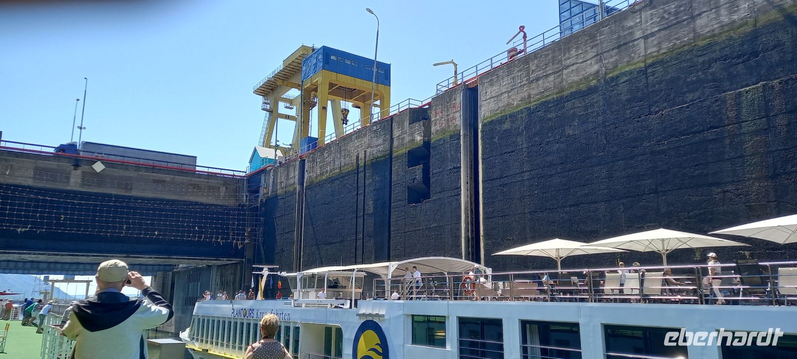 Nachdem alle Gäste an Bord waren (neben der „Eberhardt-Travel-Gruppe“ noch ca. 40 andere Passagiere) legte die „Prinzessin“ auch ab und fuhr gemächlich die Donau stromabwärts Richtung Linz/Österreich. Kurz vor der Grenze konnten wir die erste Schleusung dieser Fahrt beobachten. Die Schleuse Jochenstein, noch auf deutschem Boden, war zügig passiert. Vorbei an Engelhartszell (bereits Österreich) gab es gleich die erste Attraktion zu bestaunen, die „Schlögener Schlinge“ – der größten natürlichen Mäander der Donau, die sich hier in zwei fast 180° Schleifen des Weg durch das Gestein gegraben hat.