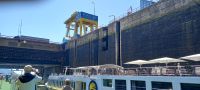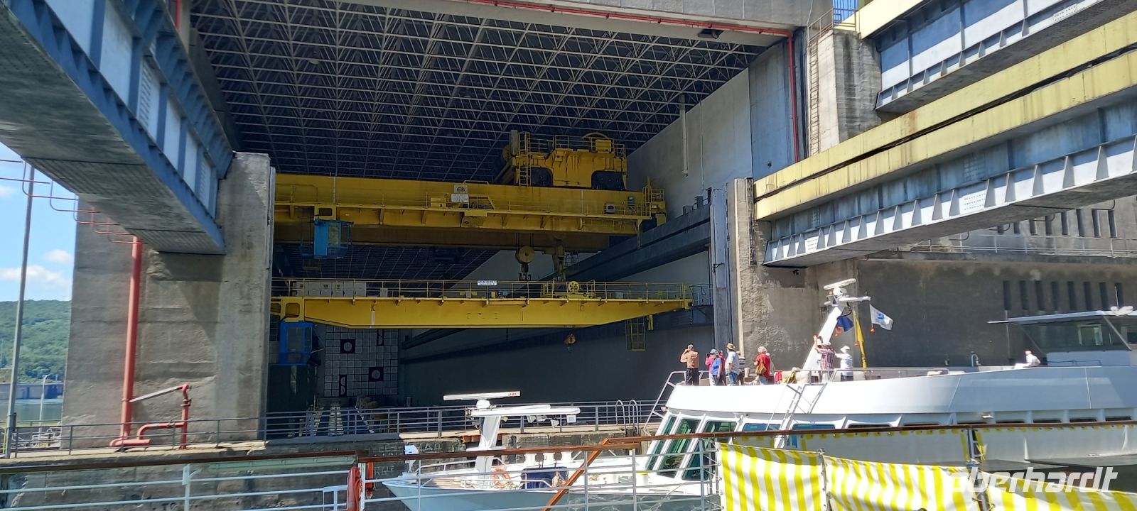 Während und nach dem Mittagessen musste das Schiff an der Schleuse Greifenstein festmachen und ca. 2,5 Stunden auf Schleusung warten. Je nach Verkehrslage sind solche Wartezeiten an Schleusen auf der Donau „normal“