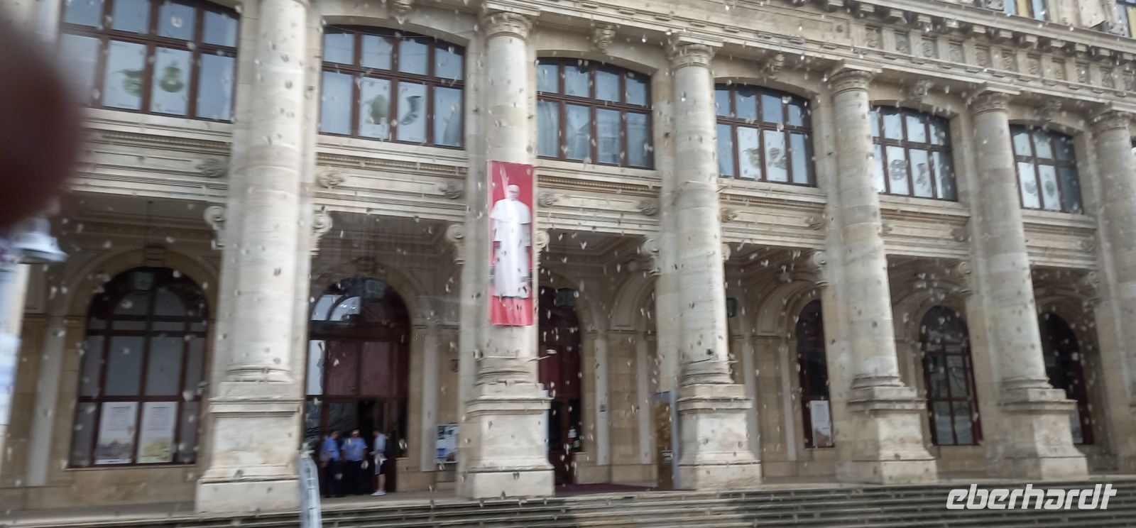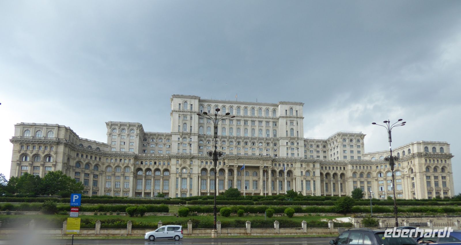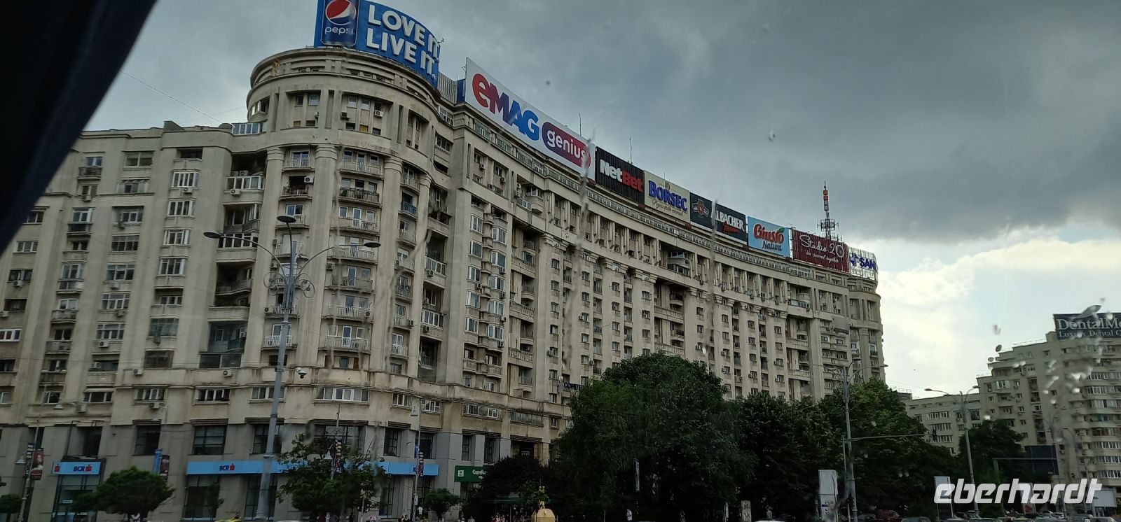 So sahen wir viele markante Bauwerke der Stadt nur durch den Regenvorhang und die nssen Scheiben des Busses. Nur bei der "Casa Poporului", dem gigantistischen Ungetüm, war es einen Augenblick trocken, sodass wir aussteigen konnten. Über diesen Bau und die ebenfalls gigantische Academia Romana und seinen Bauherren Nicolai Ceausescu sind Bücher geschrieben worden....!