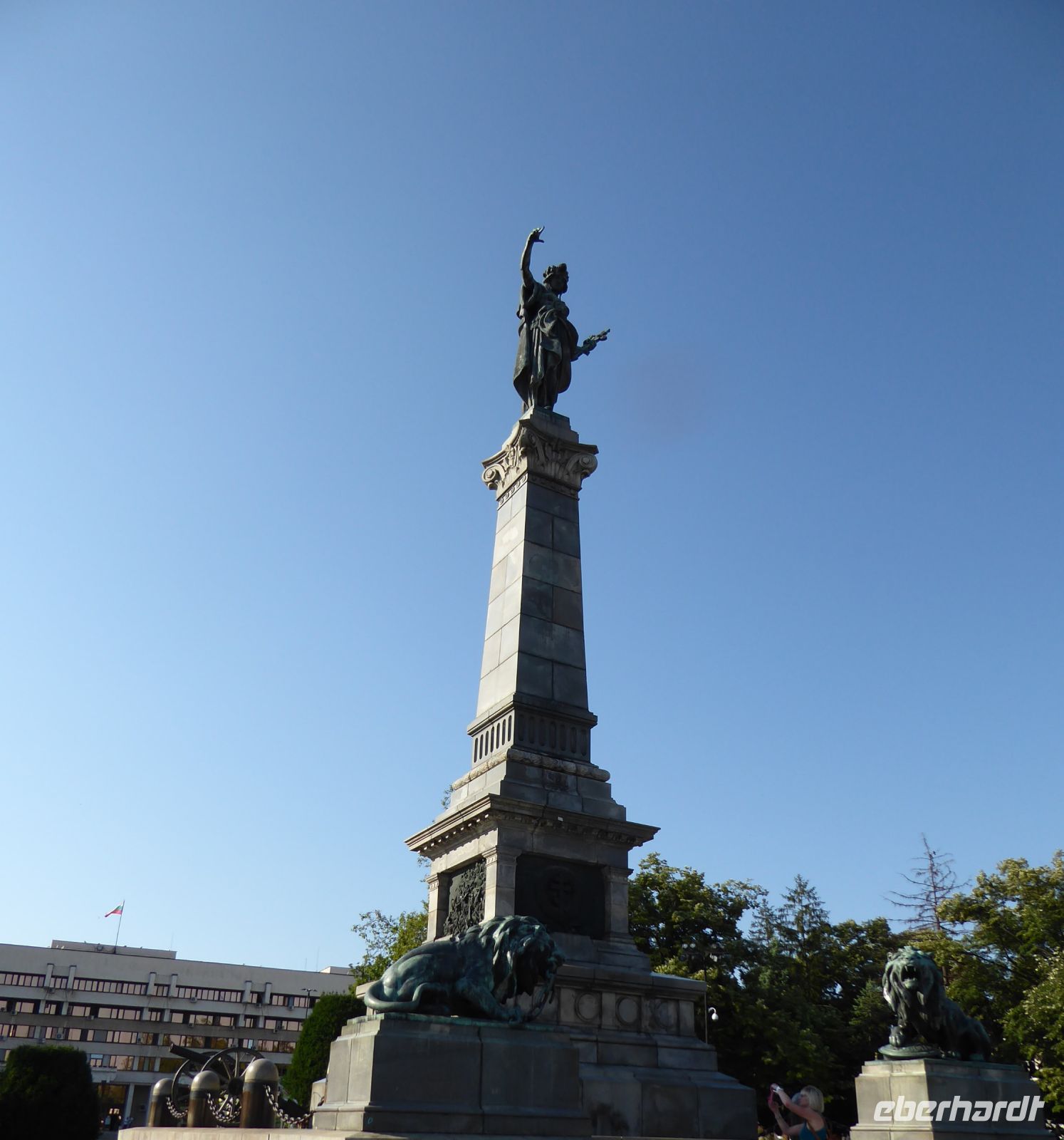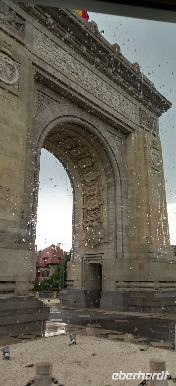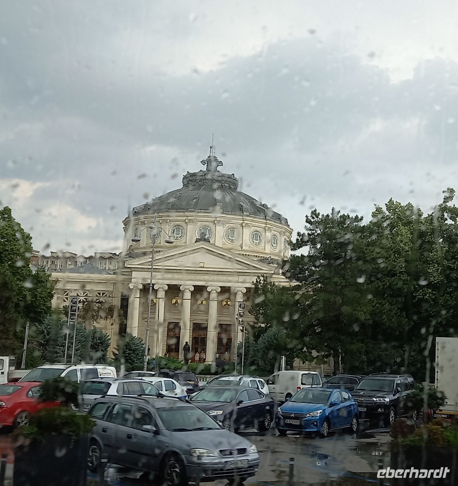 Den Vormittag üb er glitt unsere Prinzessin weiter flußabwärts, vorbei an Rousse/Ruse. das wir auf der Rückfahrt besuchen sollten. Kurz vor Mittag ging unser Schiff an die Pier in Giurgiu. Für uns Passagiere gab es bereits um 12.00 h Mittagessen, um genug Zeit zu haben mit 2 Bussen und deutschsprachigen Guides nach Bukarest, der Hauptstadt Rumäniens, zu fahren. Es sollte eine Fahrt im Regen werden, mit kurzen Unterbrechungen. Auch während der Stadtrundfahrt regnete es. Auf Anfrage des Guides möchte unsere Gruppe nicht zu dem geplanten