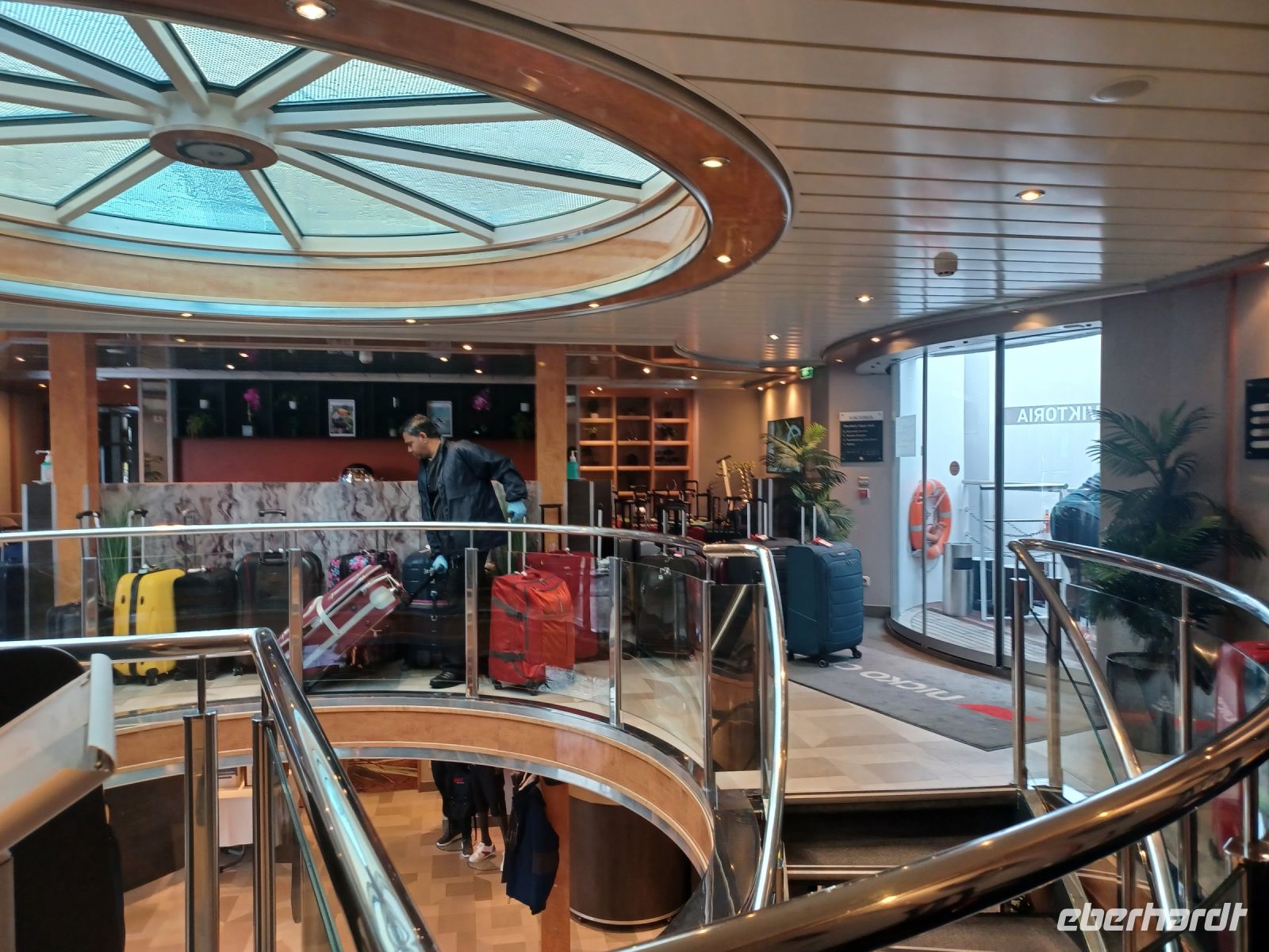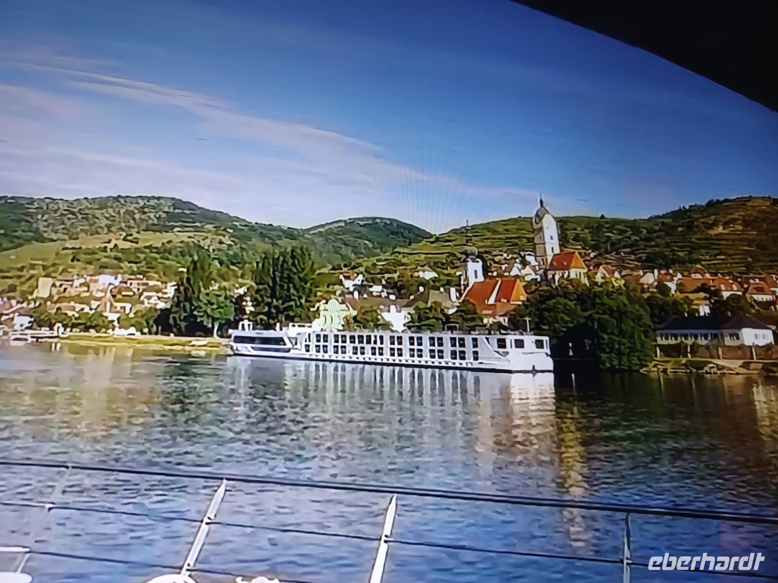 Wir folgen nun der Sicherheitseinweisung der Kreuzfahrtleiterin, Stefanie im Café Wien, der Lounge im vorderen Schiffsteil. Stefanie gibt weitere Hinweise zur Ausflugsabwicklung u. stellt das erste Besichtigungsziel - Wien-vor mit den Sehenswürdigkeiten u. Mobilitätschwierigkeitsgraden. Wir merken gleich: Steffi kommunziert klar die geordneten Abläufe auf dem Schiff zur Orientierung, u. sie verfügt über einen reichen beruflichen Erfahrungsschatz.