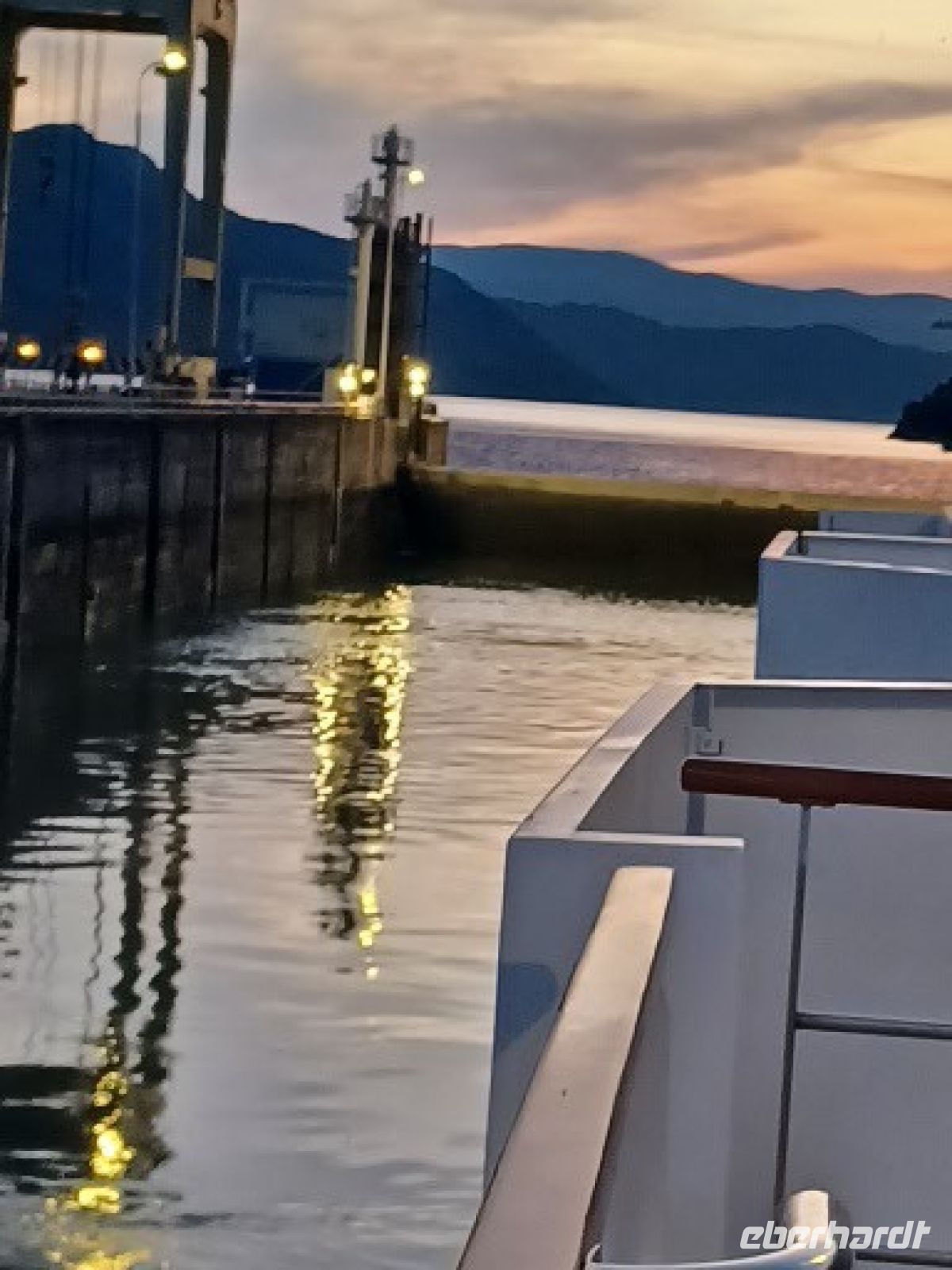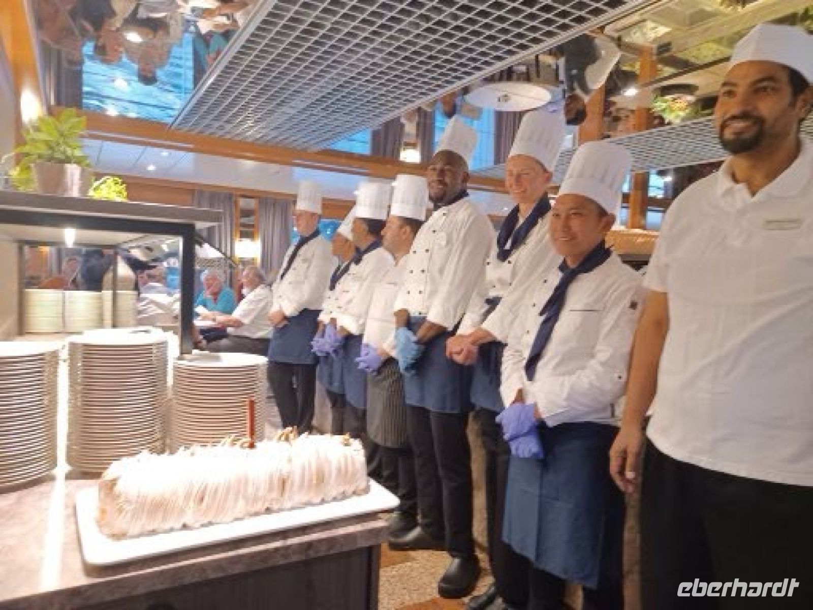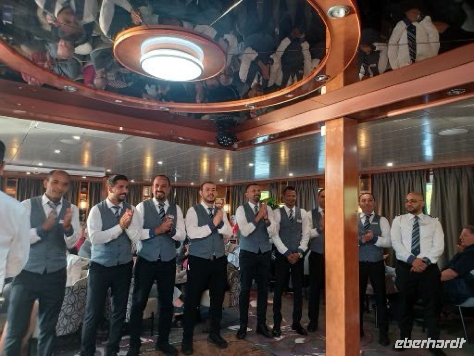 Am Abend erinnert uns der Abschiedsempfang mit Gala-Abendessen, dass die Reise sich dem Ende zuneigt. Der Kapitän sagt Dank allen Crewmitgliedern für das gute Gelingen der Reise. Es folgt eine Vorstellung der fleißigen sichtbaren u. unsichtbaren Hände u. Köpfe nach Abteilungen. Ein festlich gedeckter Tisch im Restaurant gibt dem Anlass einen würdigen Rahmen u. die Speisenfolge im 4-Gang Menü ist exzellent. Natürlich darf die Eistorte, wie in der Traumschiffserie, nicht fehlen.