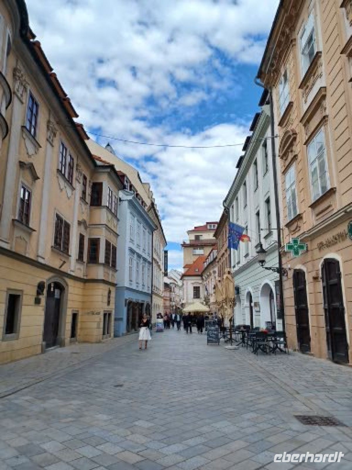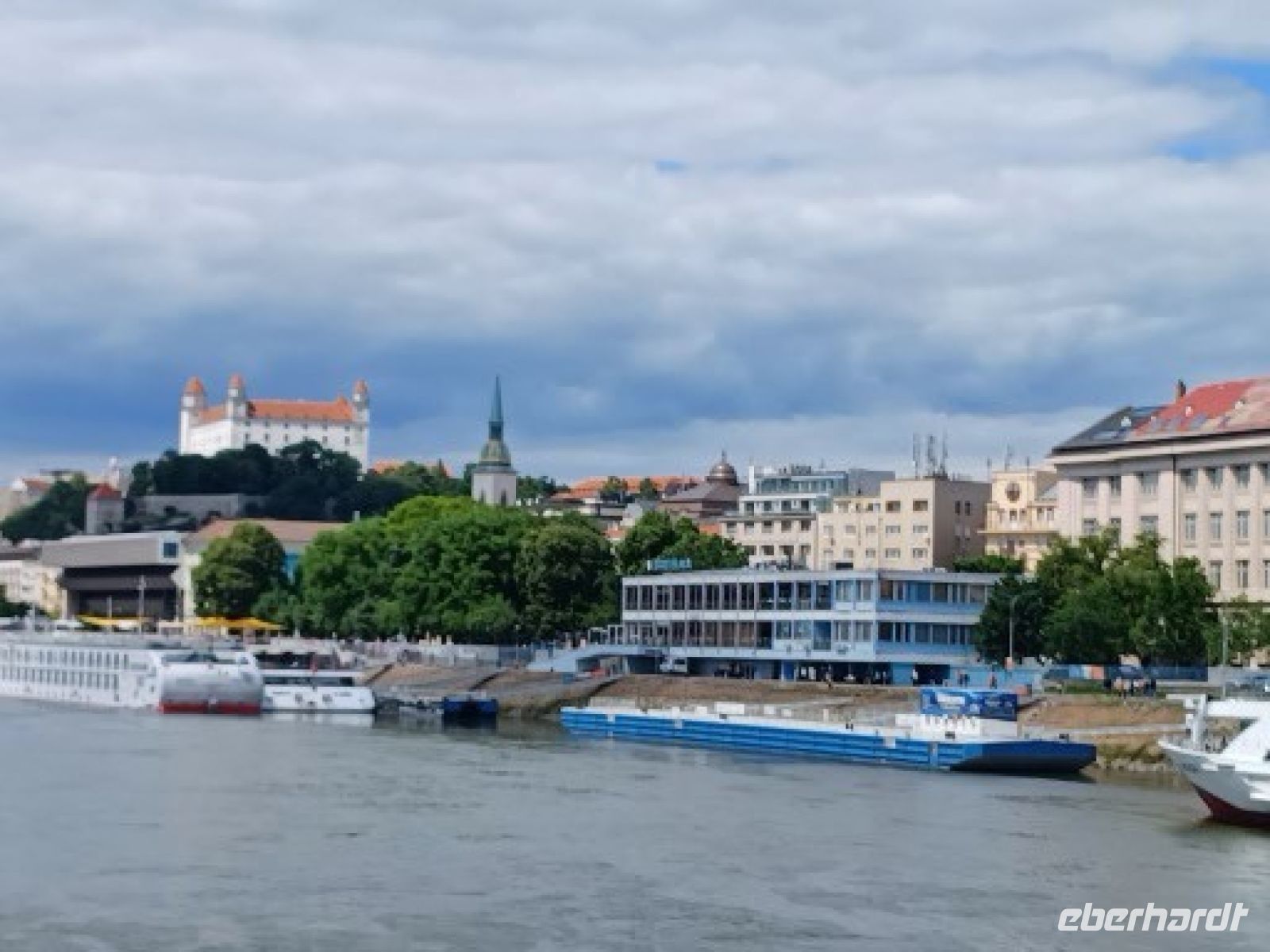 Am Nachmittag erreichen wir Bratislava u. fädeln uns in die vorgesehene Anlegestelle ein. Das markante Wahrzeichen - ähnlich wie in Budapest - die Burg auf dem Hügel. Deutsche Kolonisten ließen sich im Mittelalter hier nieder. Daher die ursprüngliche Bezeichnung Pressburg. Aus Pressburg wurde 1526 Pozsony - die ungarische Hauptstadt, nachdem die Osmanen die Burg in Budapest besetzt hatten. Die Stadtführerin, Eva, zeigt uns die Burg, die Nobelvillen auf dem Burgberg u. hält an einer Panoramaaussicht über das Dreiländereck- Ungarn-Slovakei-Österreich. Aufgrund der Geschichte werden alle drei Sprachen gepflegt u. die 4. Sprache ist Tschechisch. Die Ungarn u. Habsburger wählten Bratislava als Krönungsstadt als Alternative zu den durch die Osmanen besetzten Hauptstädte.
