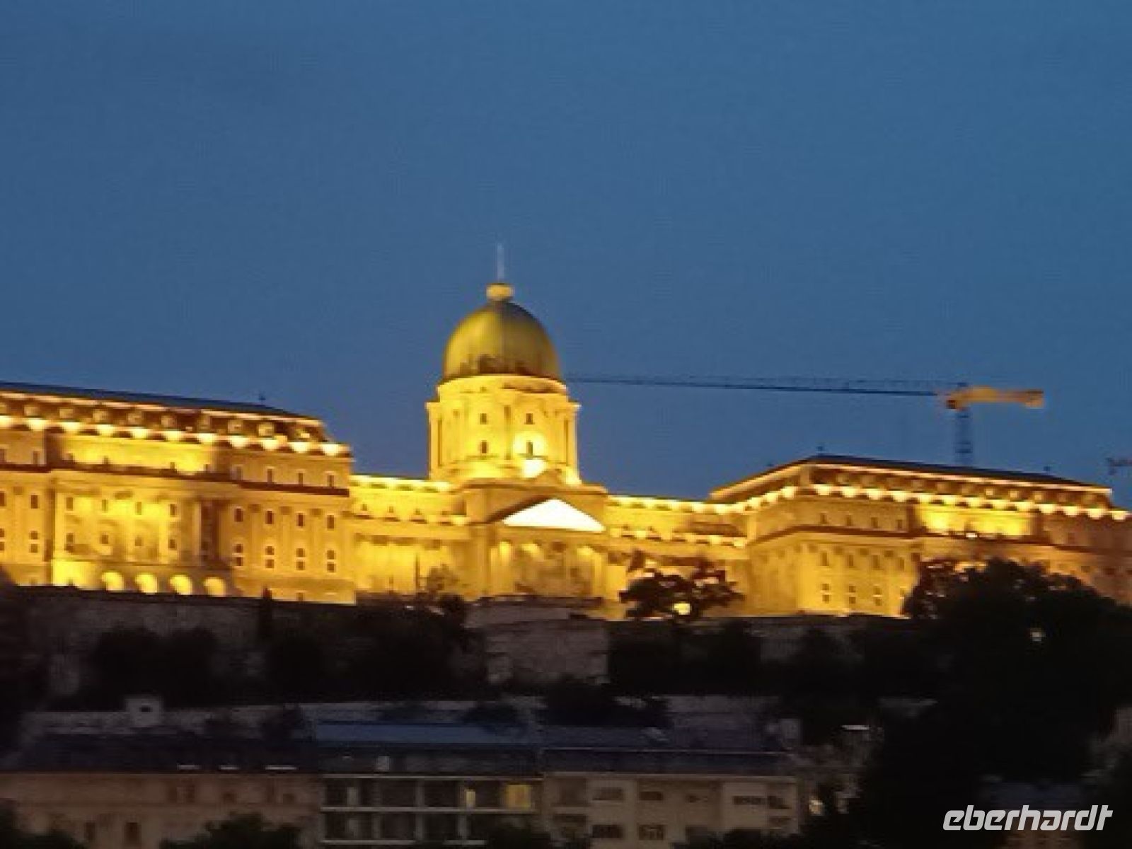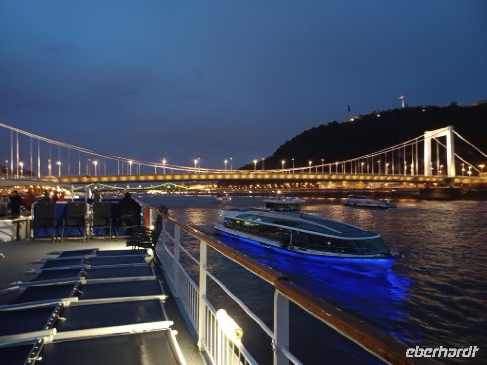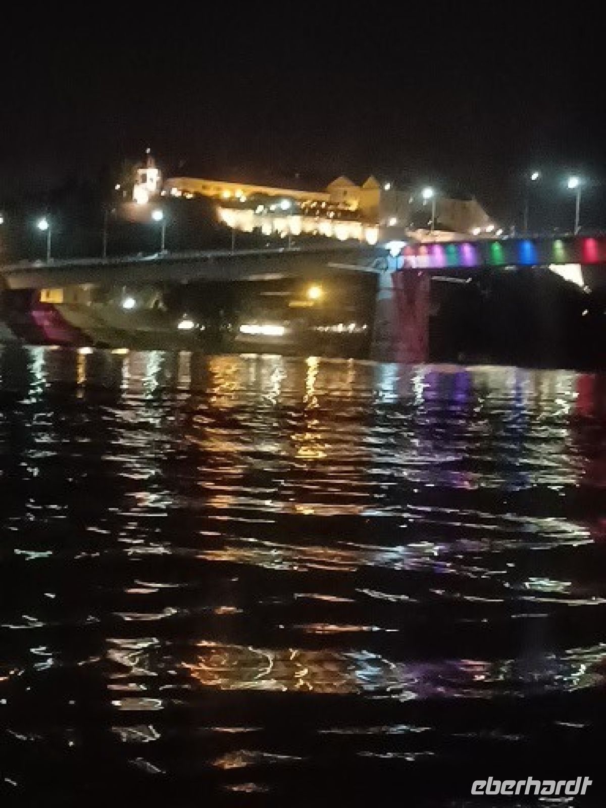 Später in der Dunkelheit passieren wir Bratislava mit der beleuchteten Pressburg.