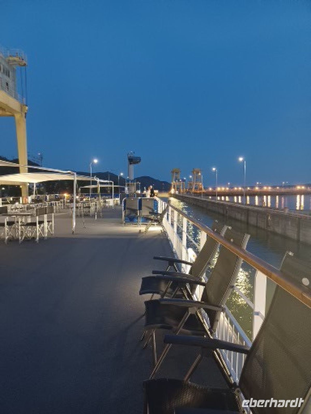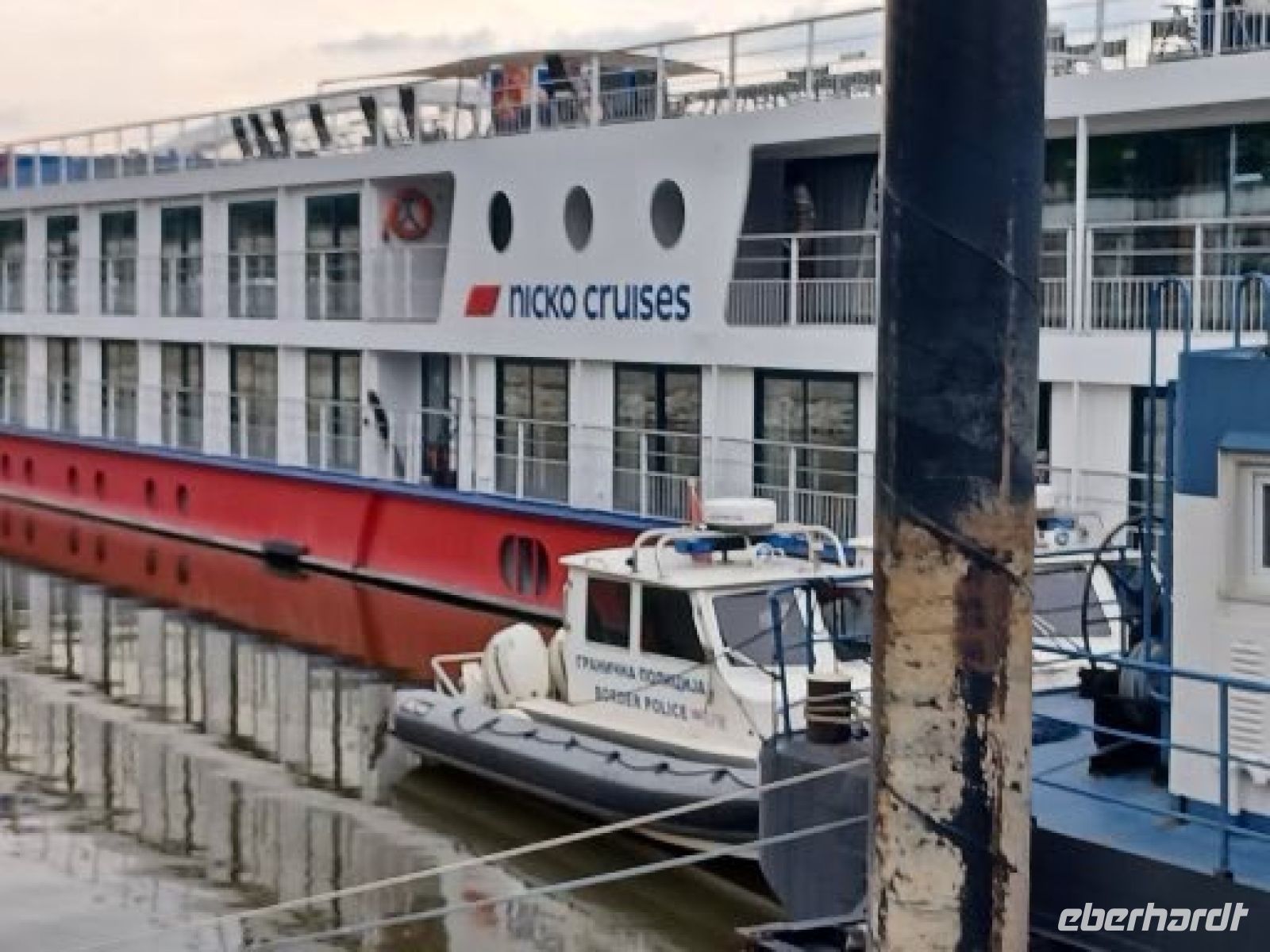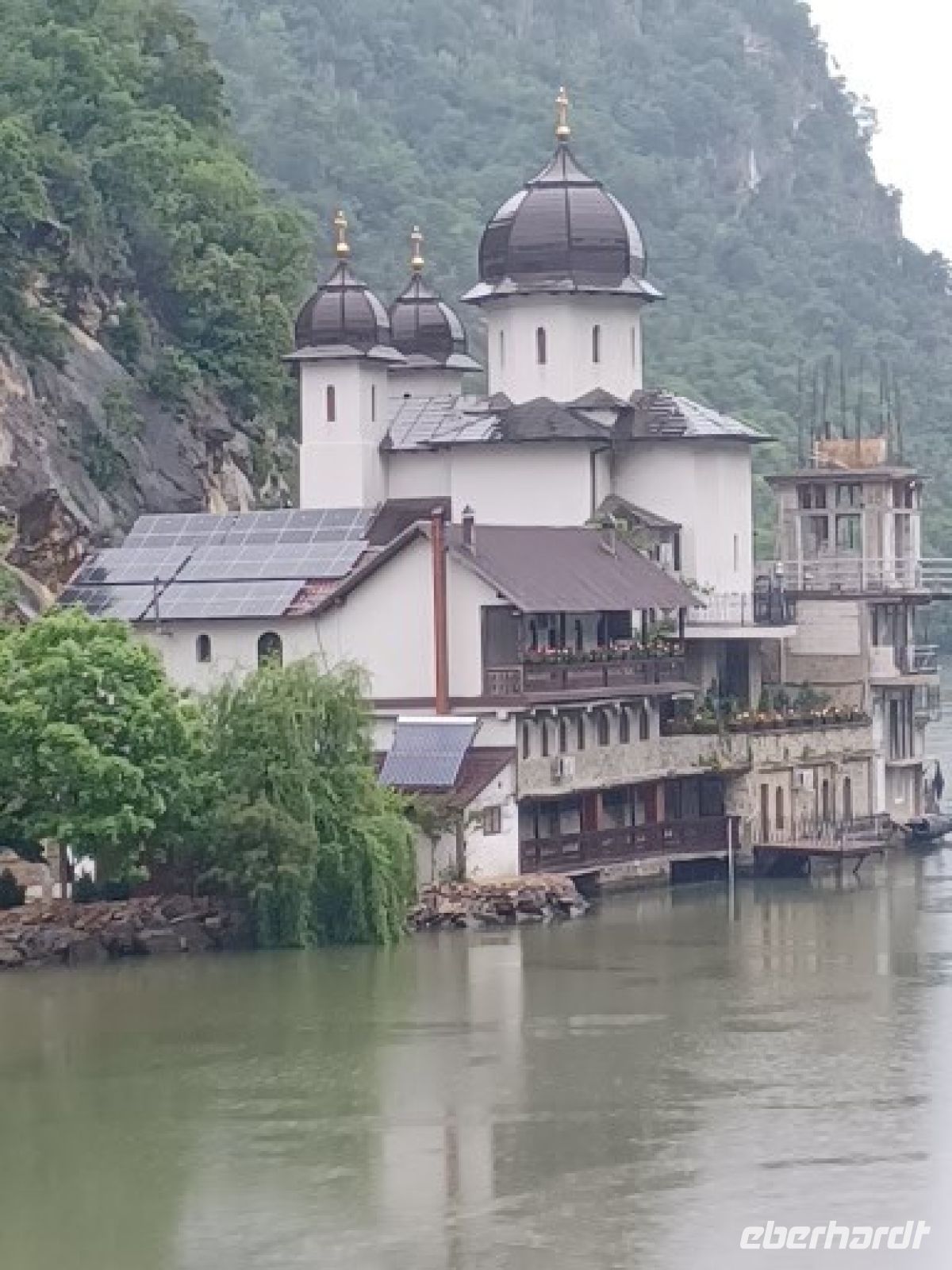 Heute verbringen wir den Tag auf dem Schiff. Da das Wetter nicht auf das Sonnendeck lockt, nutzen wir die Angebote auf dem Schiff: es gibt eine Führung im Kapitänshaus sowie einen Einblick in die Küche, wo täglich drei Mahlzeiten für ca 200 Personen zubereitet werden. Mit Wärmelampen werden die belegten Teller vorbereitet damit tischgleich eingesetzt werden kann. Der Bordshop läd mit einem Glas Sekt ebenfalls zum Stöbern ein: ein kleines Geschenk für nette Nachbarn, Freunde oder Verwandte darf es wohl sein! In die Sauna kann man nach Vorbestellung auch gehen. Ach ja, u. wir müssen an die Zeitumstellung denken, von osteuropäischer auf MEZ (1 h Stunde zurück). Auf Ansage werden die Handys auch wieder für gut zwei Tage ausgestellt, denn wir befinden uns im Serbischen Kommunikationsnetz.