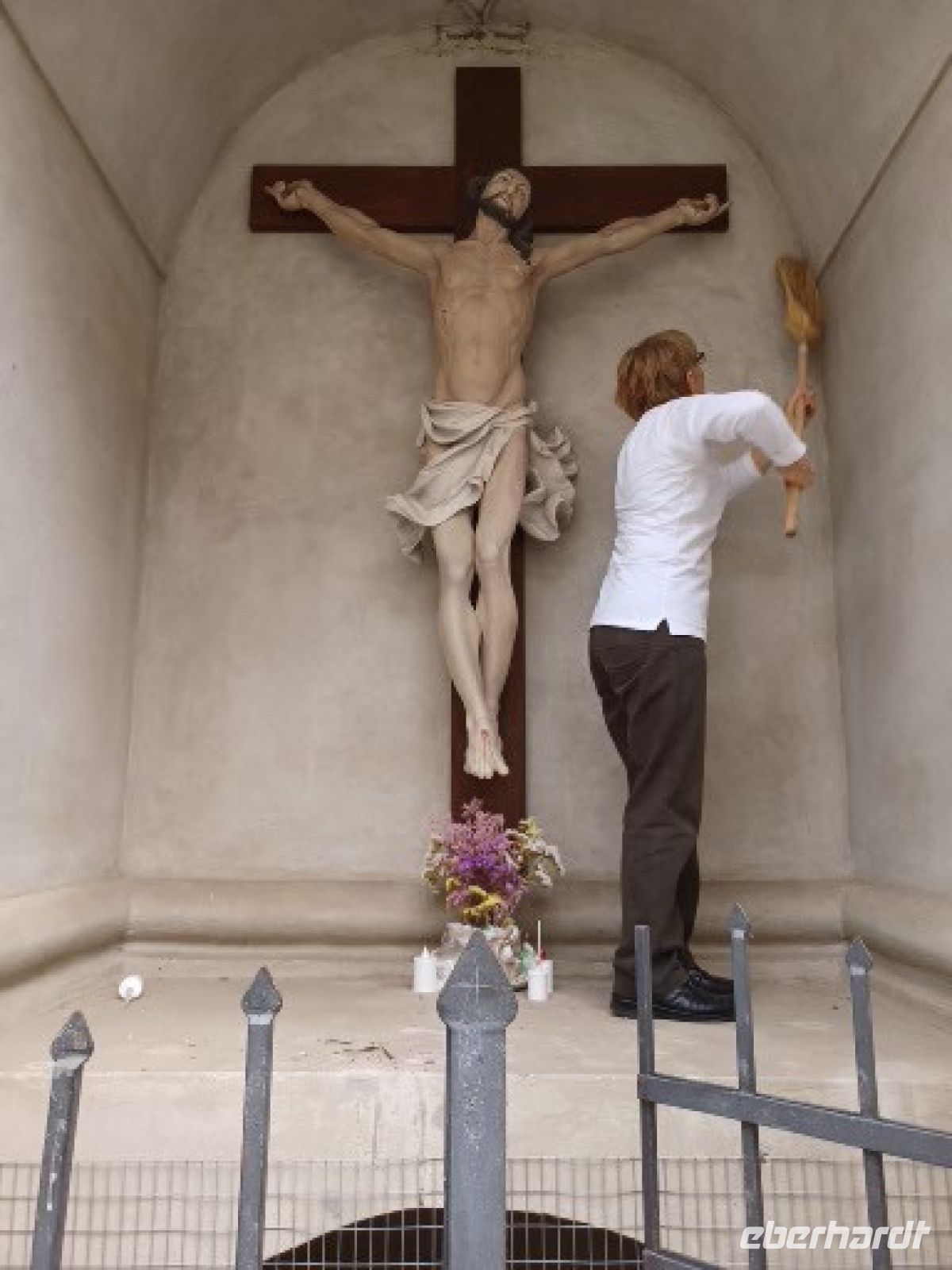 Melk erfreut uns mit den Barockkuppeln des gleichnamigen Stiftes. Nach der Schleuse Melk erreichen wir am Mittag den Nibelungengau u. schließlich den Ort Ybbs. Edeltraut, unsere Gästeführerin, leitet den Bus über enge Serpentinen hinauf zum Wallfahrtsort Maria Taferl. Der Überlieferung zufolge kam es an diesem Ort bereits 1633 zu zwei wundersamen Heilungen. Und auch später wurde immer wieder von Wundern und Engelserscheinungen gesprochen. Es ist Sonntag u. im Mai kommen zahlreiche Pilger hinauf. Es sind kirchliche Stände aufgebaut, u. eine Familie drückt singend u. tanzend, mit Gitarre, ihre Verbundenheit mit Gott aus. Wir schauen in die prunkvoll ausgestattete Kirche, genießen aber auch den Panoramablick über das Donaudelta. Einige Gäste spazieren auf dem Panoramaweg u. schauen sich die mechanischen Krippe an, die 1892 gefertigt wurde. Sie zeigt u.a. die Entstehungsgeschichte des Wallfahrtsortes sowie Stationen aus dem Leben Jesu.