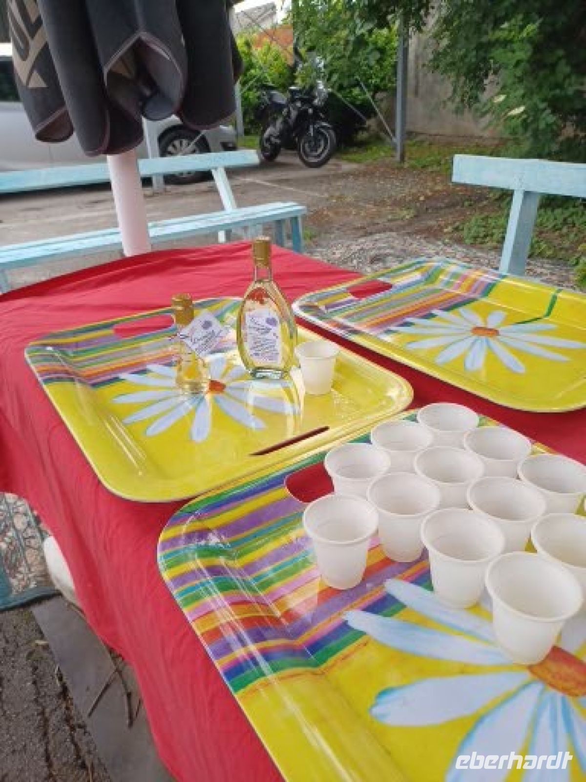 Damit uns der Abschied nicht so schwer fällt, gibt es für jeden erst einmal einen ungarischen Palinka nach Obstsortenwahl im Bus.