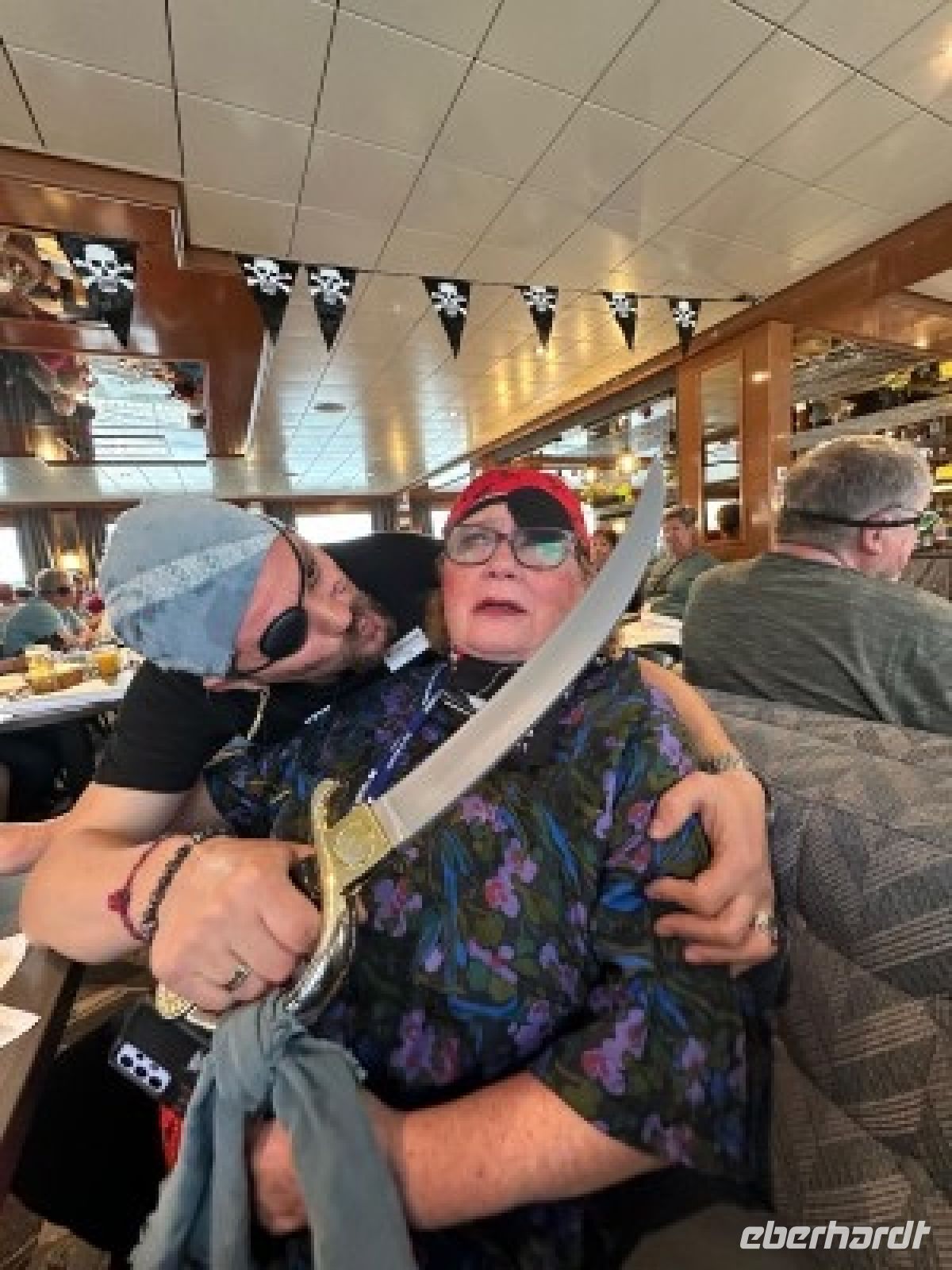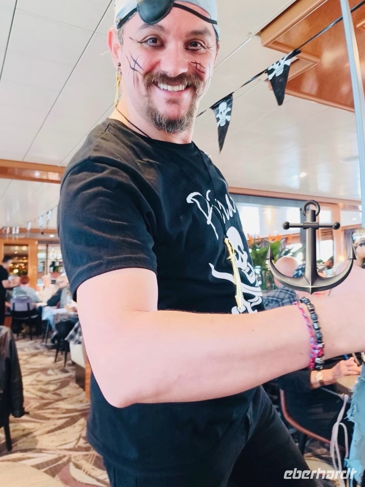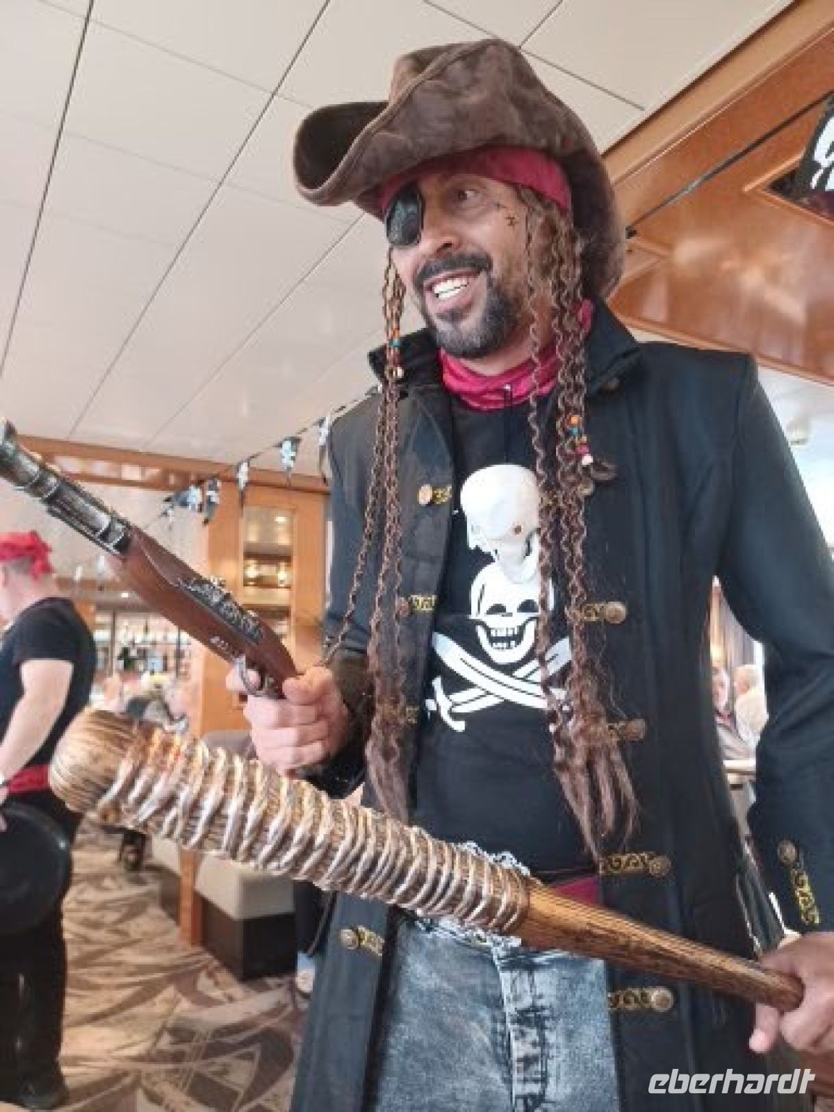 Am Abend sammeln sich Piraten vor dem Restaurant u. fordern Einlass. Es sind unsere Tischservicekräfte, die mit Säbel u. Augenklappe recht wild bedienen. Um unsere Gäste zu schützen, habe ich mich als Reisebegleiterin freiwillig ergeben. Piratenverkleidung wurde, wer wollte angelegt. An der Rezeption kann man Piratentücher, Kopftücher, Piratenhut, Augenklappe u weitere Accessoires käuflich erwerben. Ein Teil unserer Gäste u. alle Crewmitglieder waren im Piratenaufzug u. hatten viel Spaß bereits am Tisch. Da fiel die (leere!) Suppentasse schon mal auf den Gast!