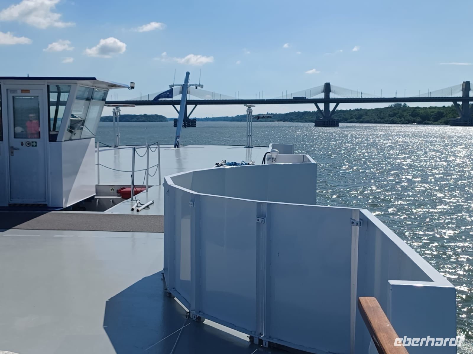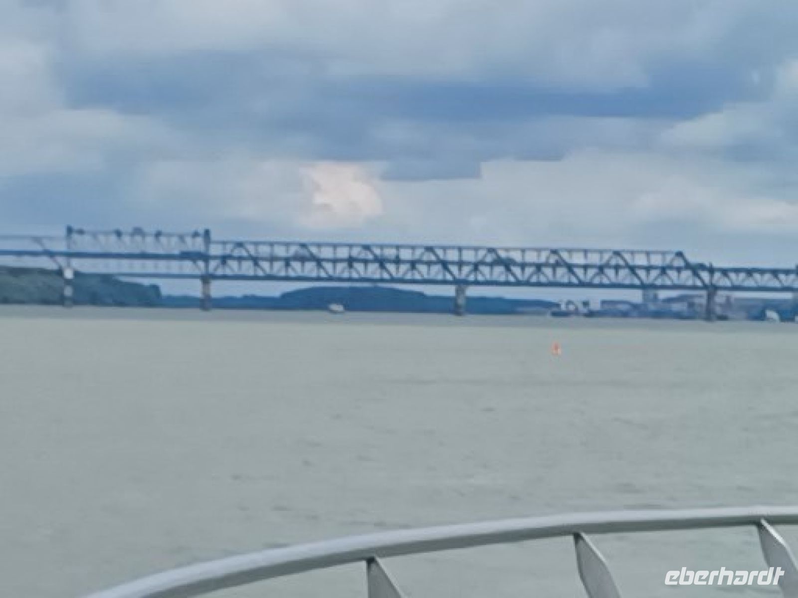 Wir genießen die Weiterfahrt an Deck durch die "Brücke der Freundschaft", die Bulgarien u. Rumänien zwischen Rousse u. Giugiu verbindet. Sie wurde 1954 als Fachwerkbrücke für den Bahn - u. Straßenverkehr gebaut.