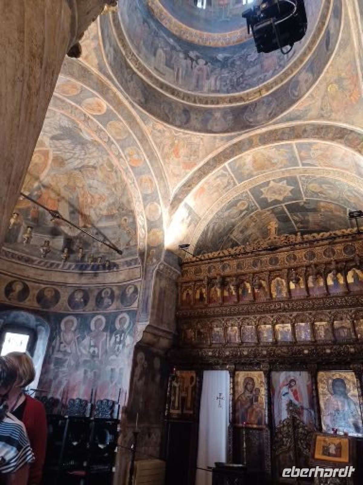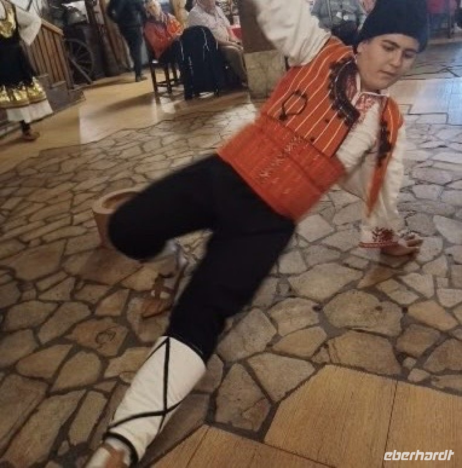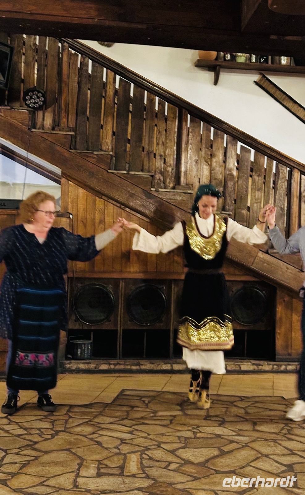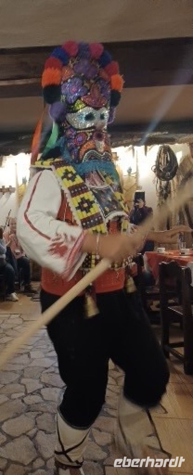 Am Vormittag werden wir mit einem Lied über Rousse, die Stadt der Rosen, auf unsere Stadtexkursion eingestellt. Überhaupt sei hier zu erwähnen, dass die Schiffsreiseleitung der MS Voktoria zu jeder Stadt u. jedem Abschnitt Songs in Auftrag gegeben hat, die wir am Ende der Reise mit einem Schiffsstick erwerben können. Gästeführerin, Kornelia aus Rousse, führt informativ u. ist leidenschaftlich engagiert, ihre Heimatstadt mit positiven Eindrücken vorzustellen. Uns imponieren die vielen Grünstreifen entlang der Straßen u. die zahlreichen Parks, die im Sommer die Hitze erträglicher machen. Zunächst halten wir in einem Restaurant zum 2. Frühstück mit einer Spezialität, Banistsa - eine landestypische Quarktasche. Es beginnt eine Folkloredarbietung, die auch einen Maskentanz zur Vertreibung böser Geiser einschließt. Am Ende wird die Reiselebegleiterin zur Schrittübung eingeladen, wobei sie über den eigenen Schnüsenkel fast zu Fall kommt. Aber immerhin schließen sich weitere Gäste dem Reigentanz an. Ein Spaziergang durch die Altstadt folgt: durch die Hauptstraße der Altstadt mit dem Freiheitsdenkmal, und auch das Rathaus u. die Oper sind sehenswert. Wir besichtigen die älteste orthodoxe Kirche der Stadt. Da unter der türkischer Herrschaft orthodoxe Gebetsräume nicht neben Moscheen ebenerdig geduldet wurden, hat man die, mit Ikonen geschmückten religiösen Räume unter die Erde gebaut. So steigen wir auch hier die Treppen in den Gebetsraum hinab. Eine Taufe wird vorbereitet.