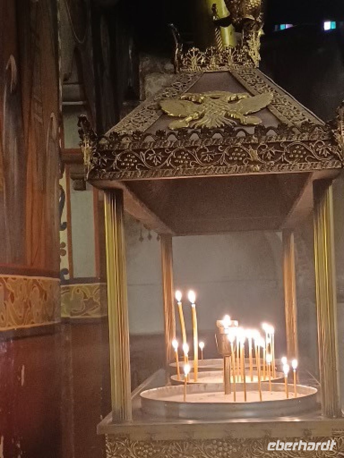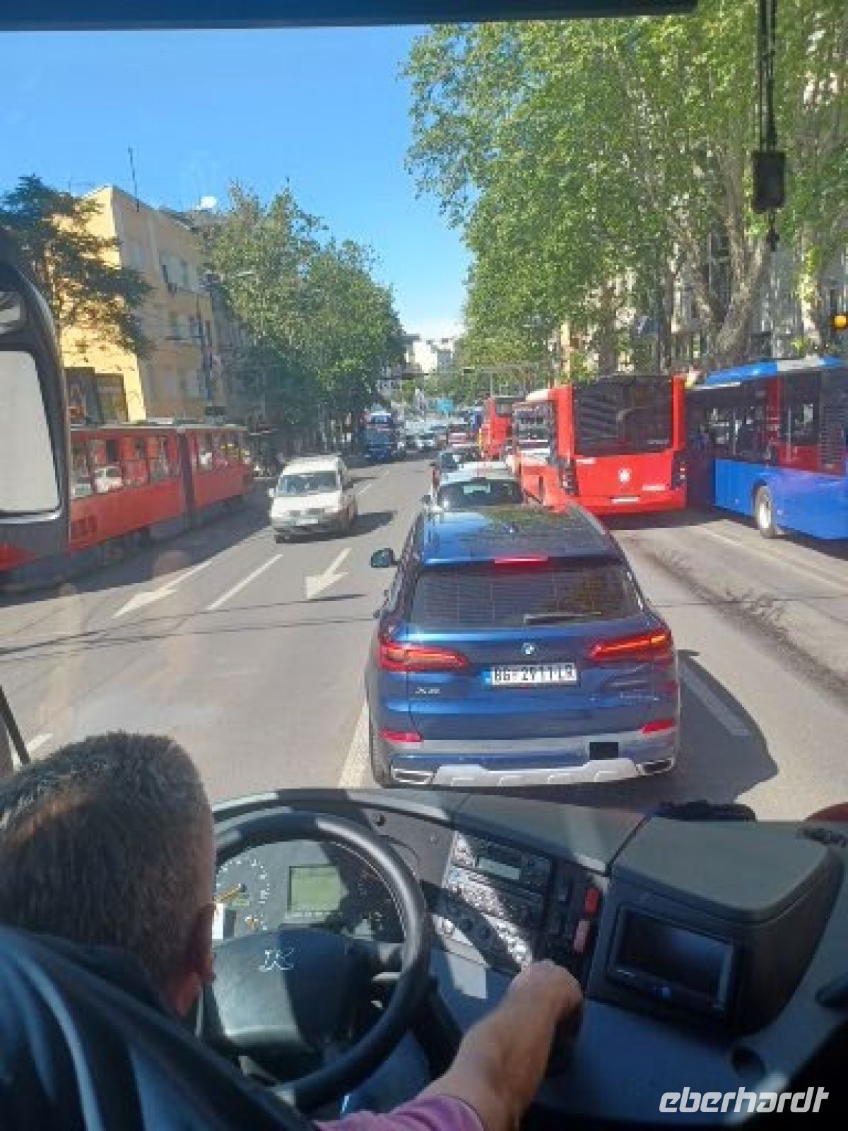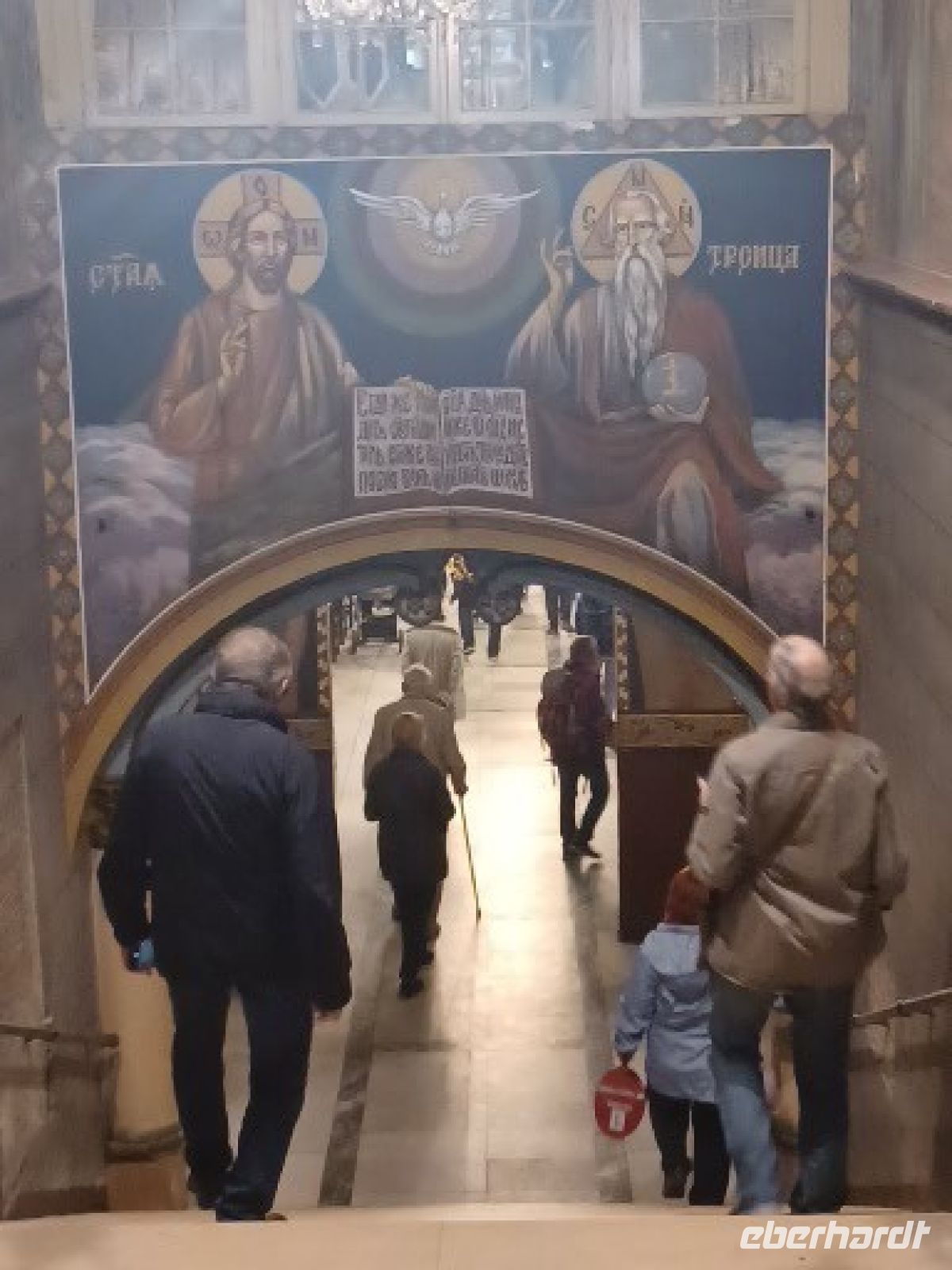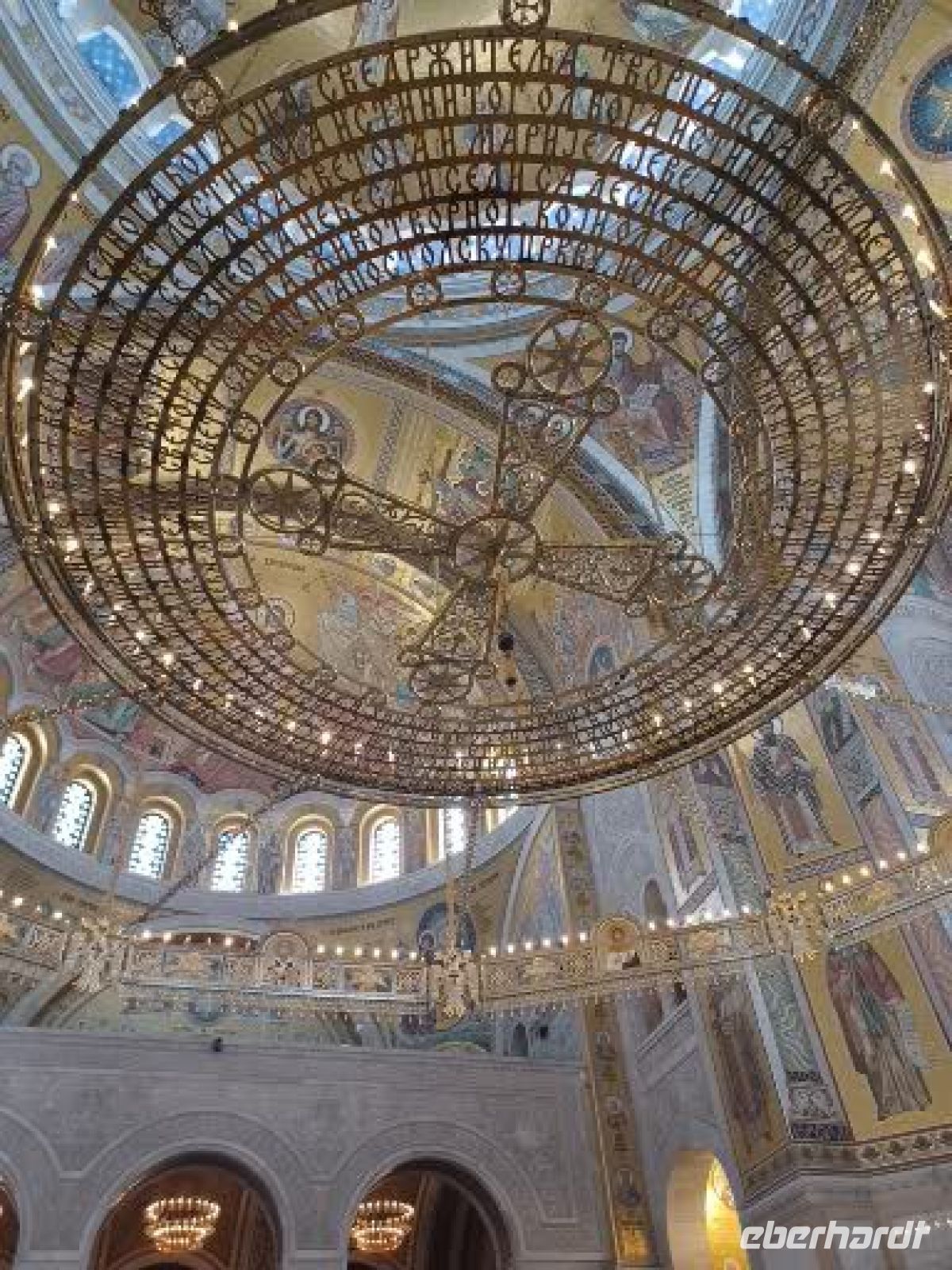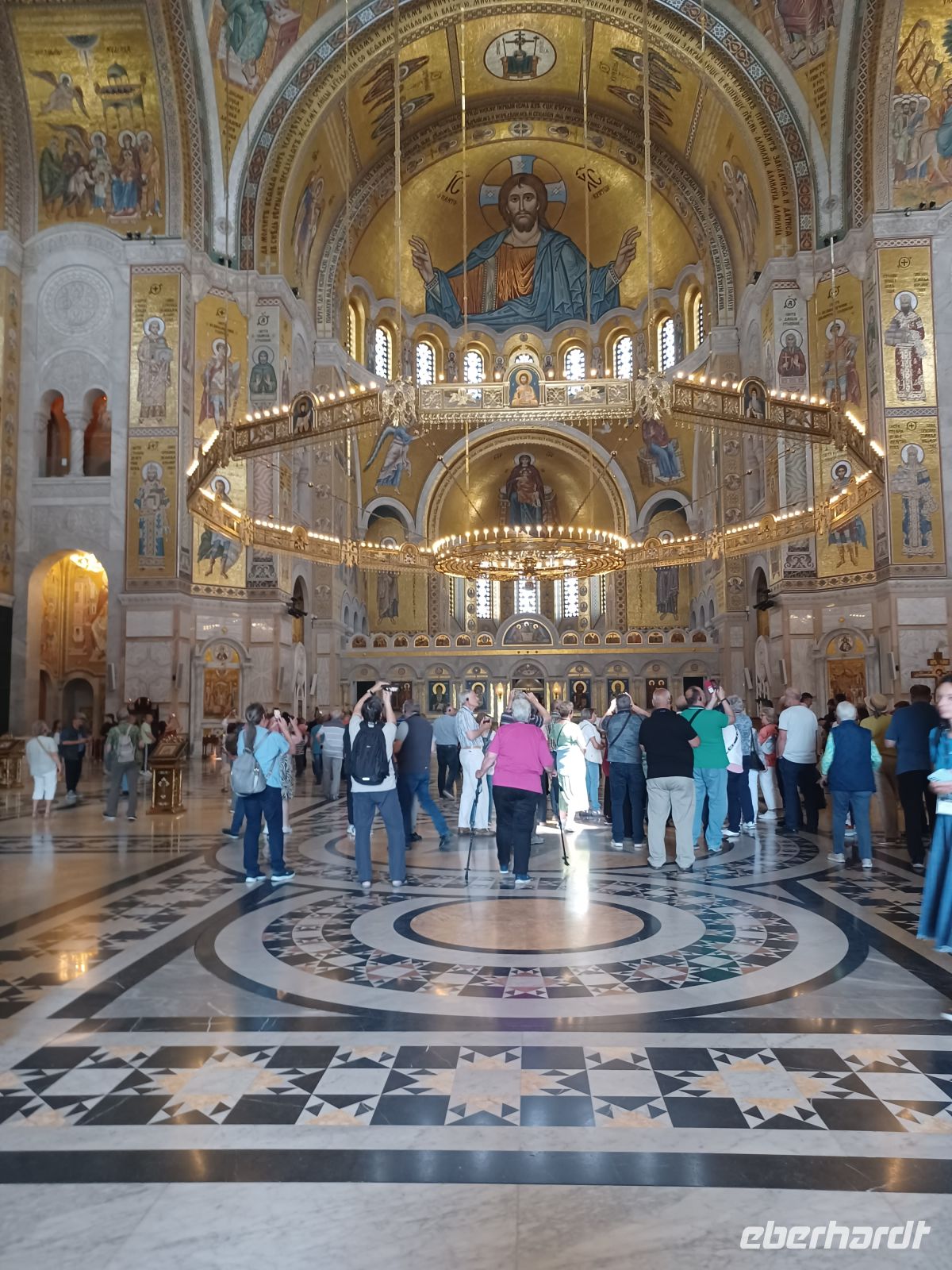 Unsere Fahrt über Nacht u. am Vormittag des Folgetages führt uns durch den kroatischen u. serbischen Donauabschnitt nach Belgrad. Da wir nun die Europäisch Union verlassen, fährt das Schiff zur Ausgangsrevision für Schengener EU-Staaten. Außerdem schalten wir die Handys aus u. genießen eine ungewohnte handyfeie Zeit. Am Nachmittag beginnt unsere Stadtrundfahrt in Belgrad (Ausflugspaket) mit Gästeführer Darko. Wir haben 28 Grad; daher genießen wir den "Kirchgang" in die Kathedrale des Heiligen Savas auf dem Vracar-Hügel. Es ist die größte orthodoxe Kirche Südeuropas. Die Mosaike im Innern sind erst vor einigen Jahren durch russische Künstler fertiggestellt worden, u. das Blattgold glänzt in der Sonne. Die Mehrheit der Serben sind aktive Gläubige u. beten zweimal am Tag in den Gottesdiensten. Manchmal bietet die Kirche auch drei Gottesdienste an.